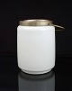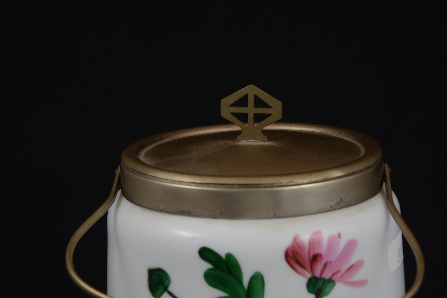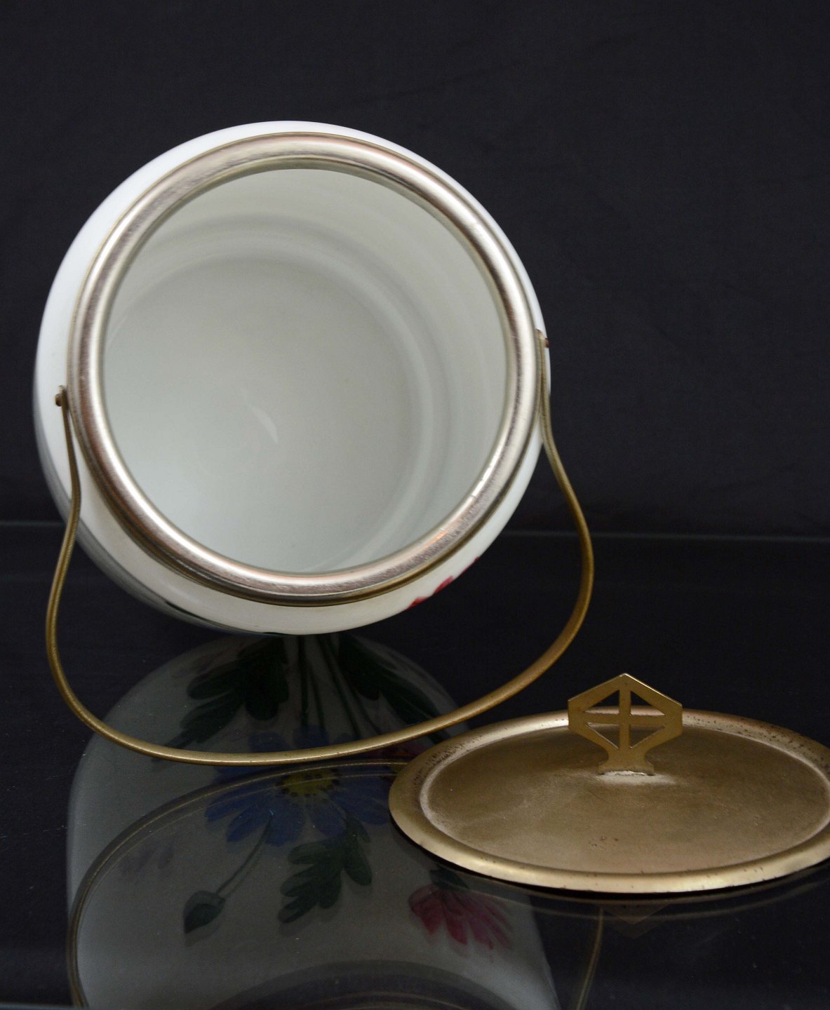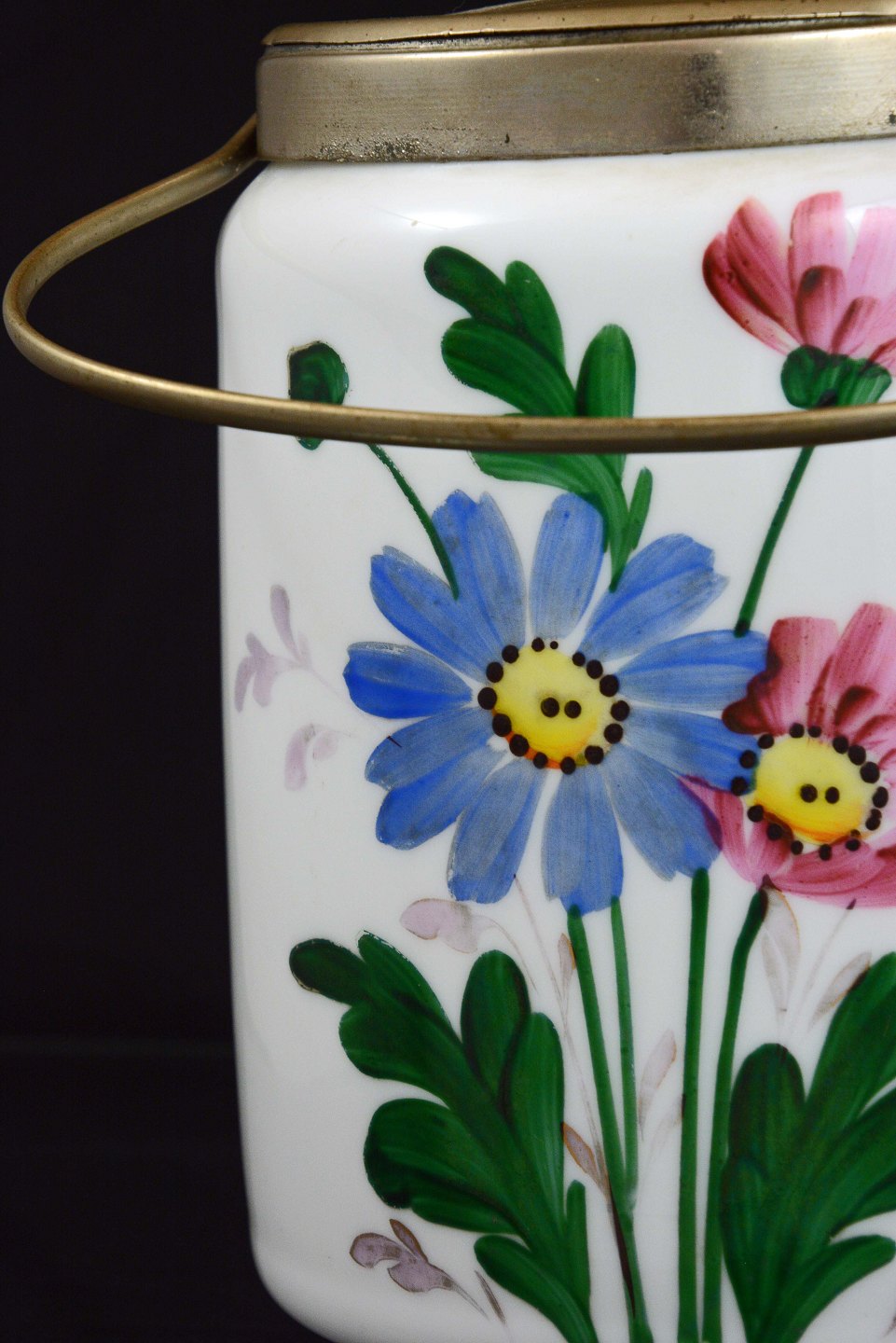 Glas kagekrukke med sommerblomster. Krukken er lavet i hvidt glas og låget er fremstillet i sølvbelagt metal.
