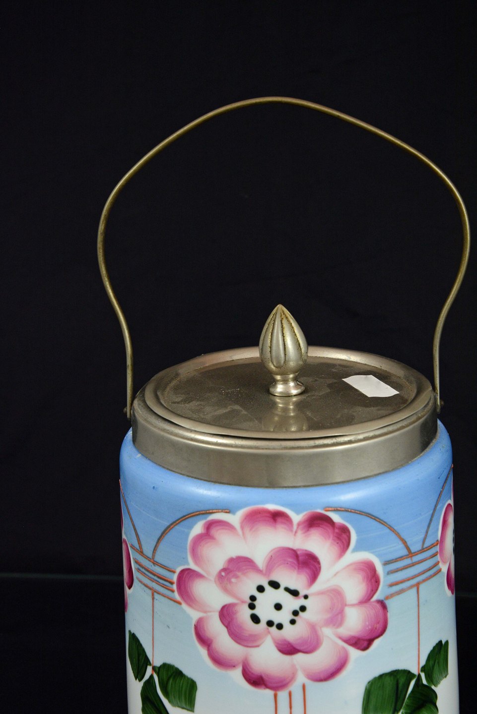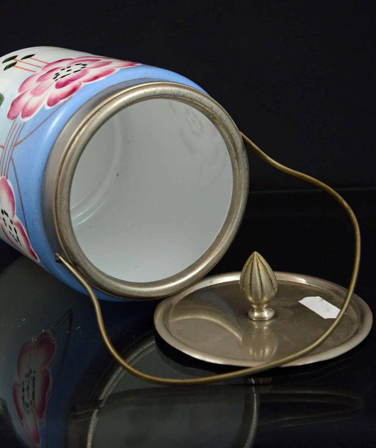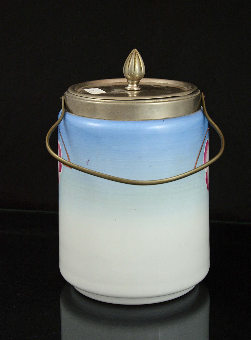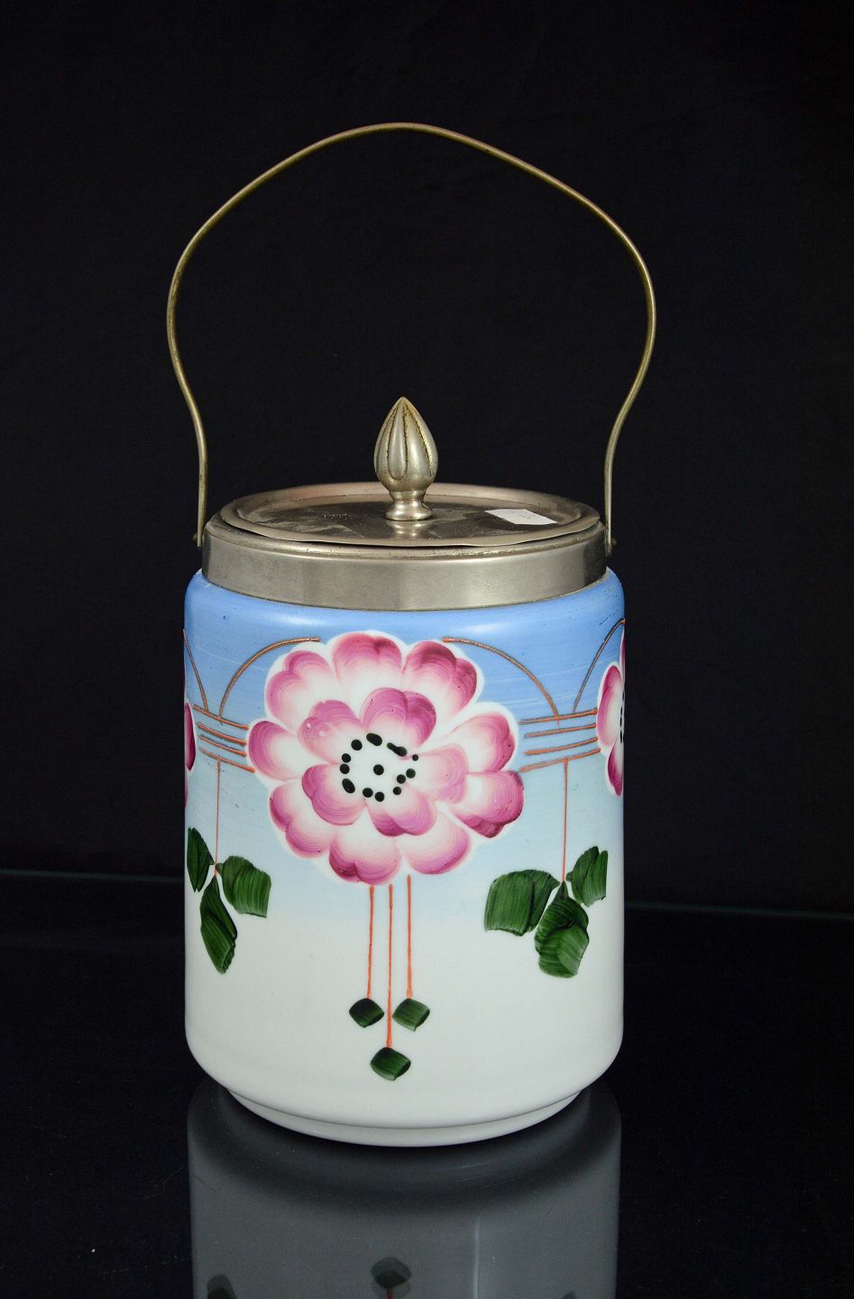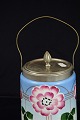 Blå/hvid opalglas kagekrukke med pink blomst.