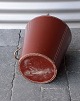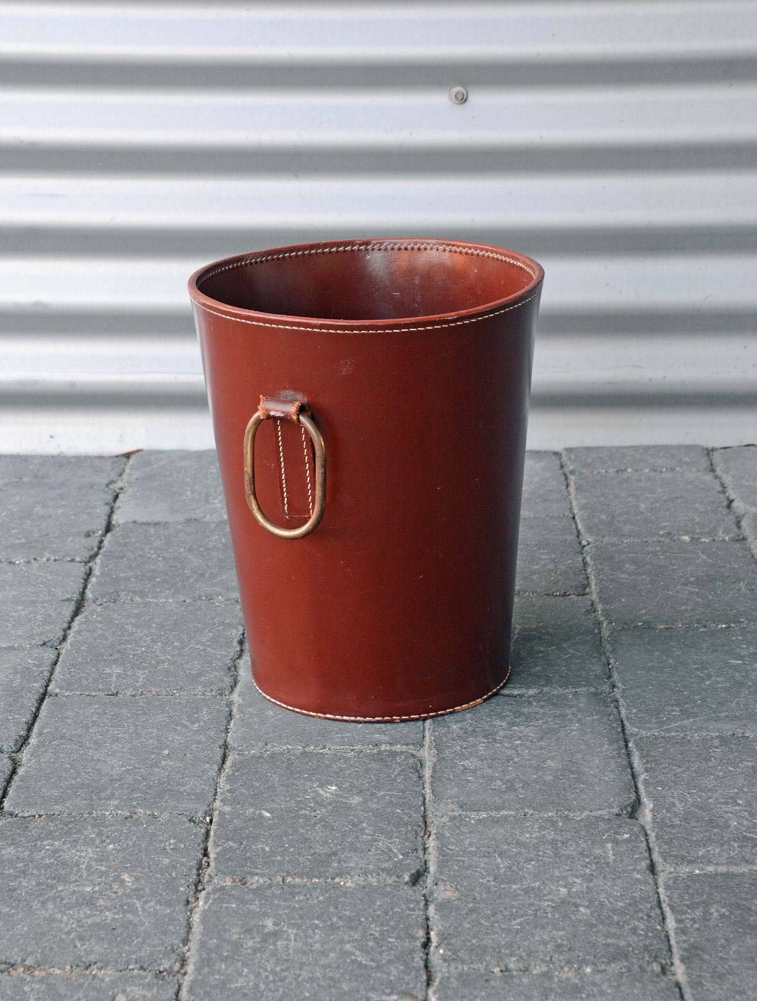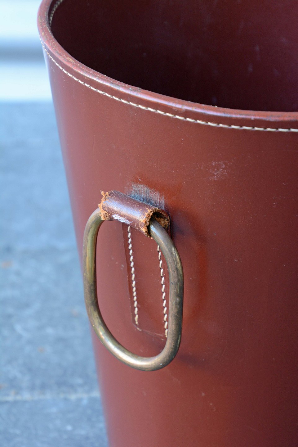 Papirkurv designet af Carl Auböck. Kurven er fremstillet af kernelæder i farven mørk cognac/rødlig brun med greb af messing. Papirkurven har intakte syninger og fremstår med brugsspor.