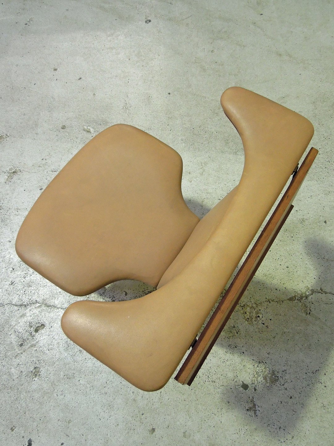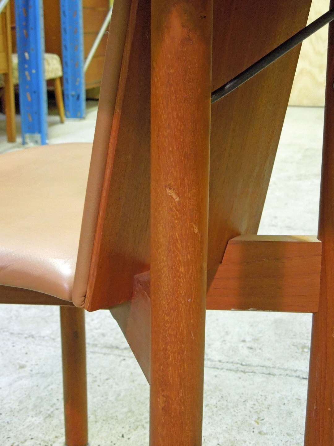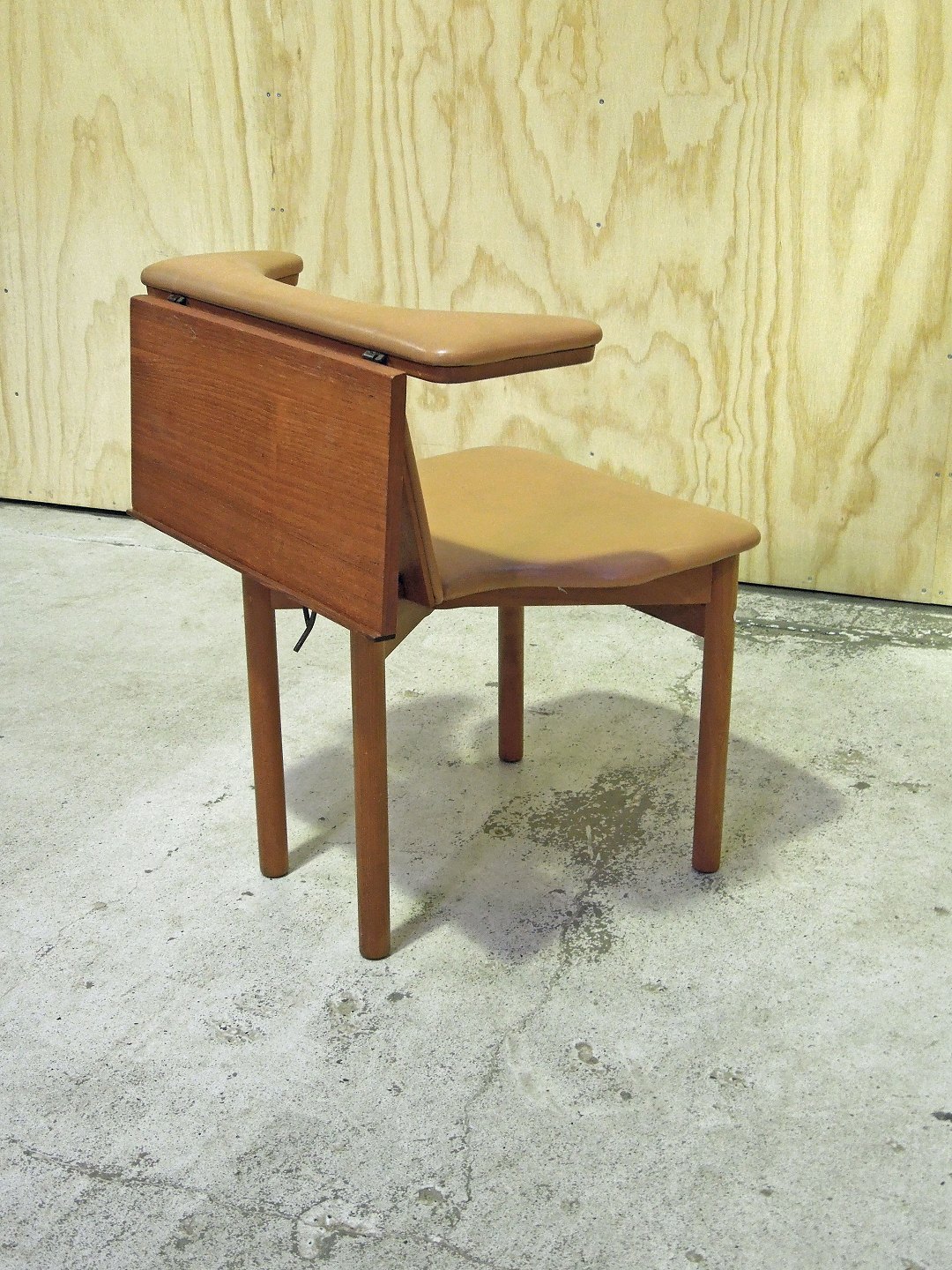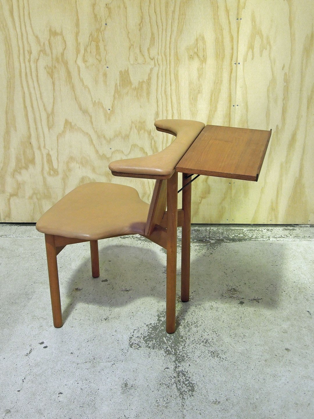 Frederik den syvende stol designet af Hans Olsen. Stolens ryg og sæde er betrukket med beige læder. Bag på Frederik 7 stolen er der en mindre klap-op skriveplade. Stolens stel og skriveplade er fremstillet teak.