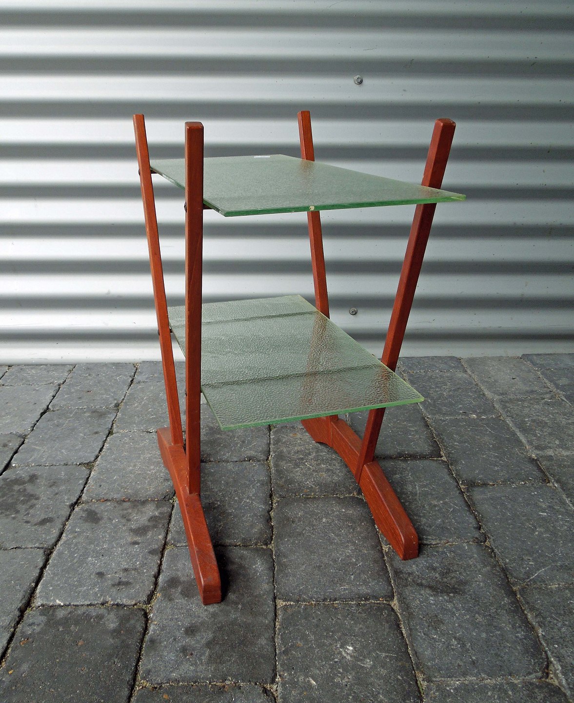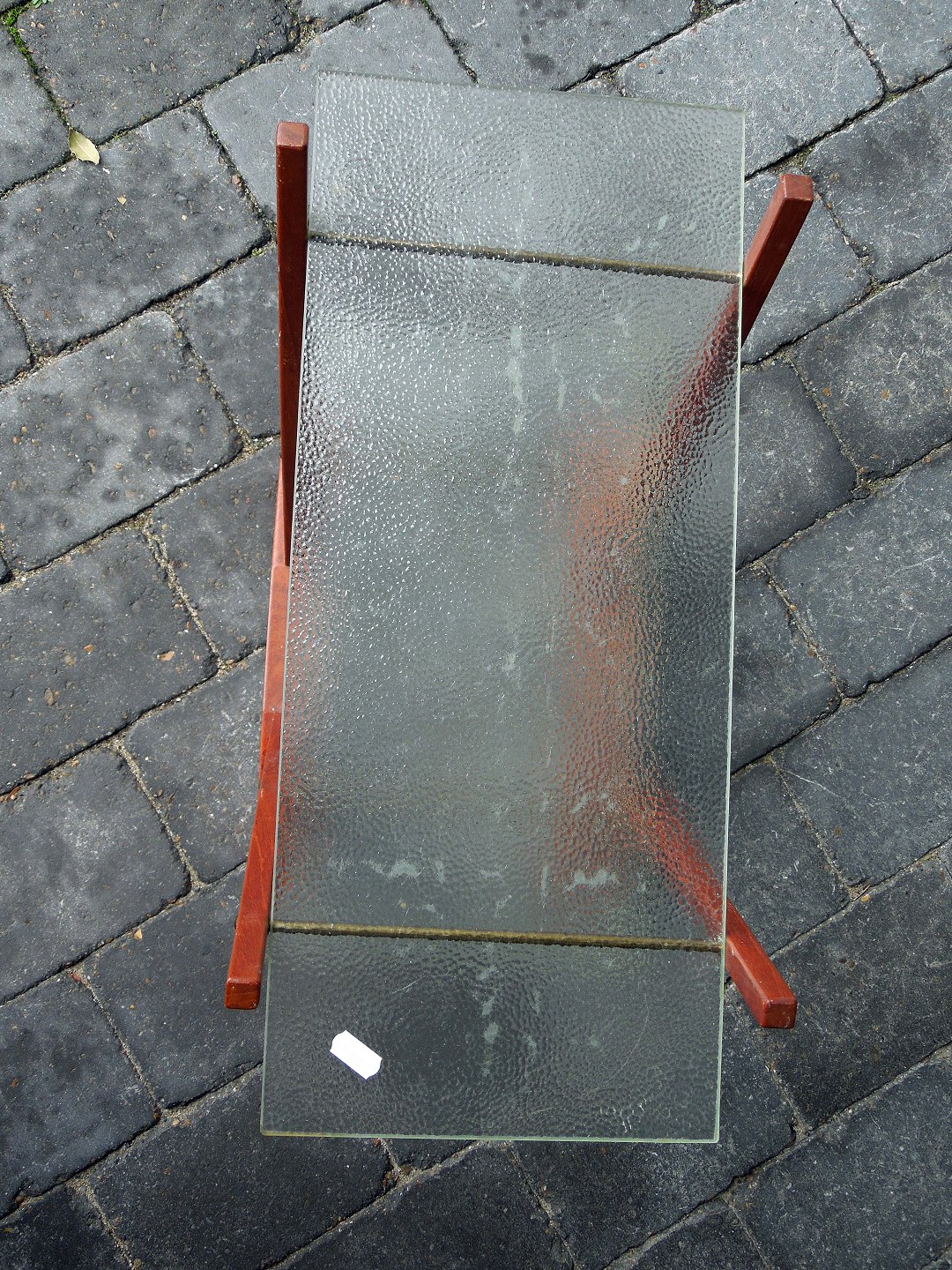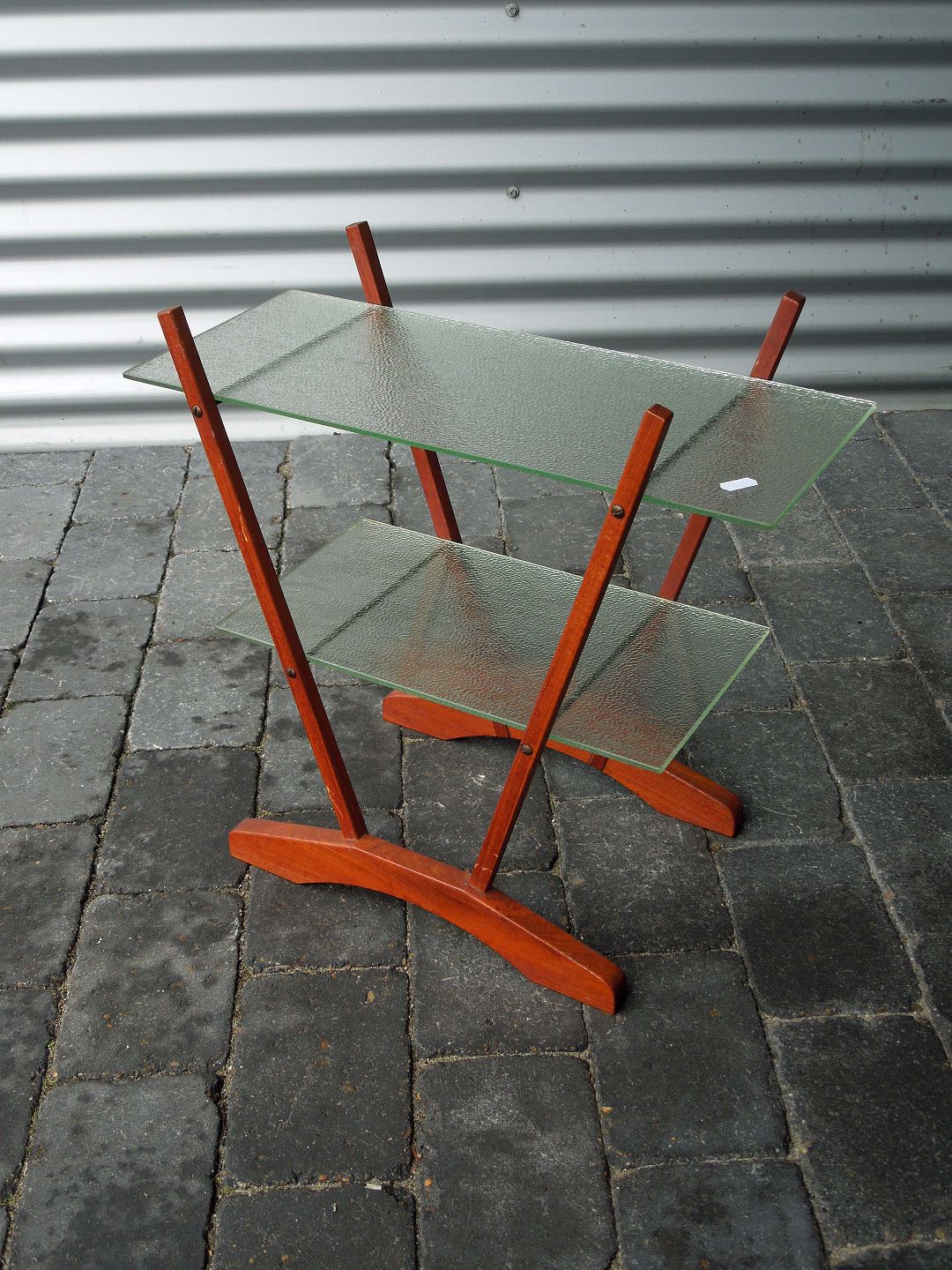 Vifteformet plantebord med 2 glasplader. Bordet er i teaktræ og fremstår med få brugsspor på glas og stel.