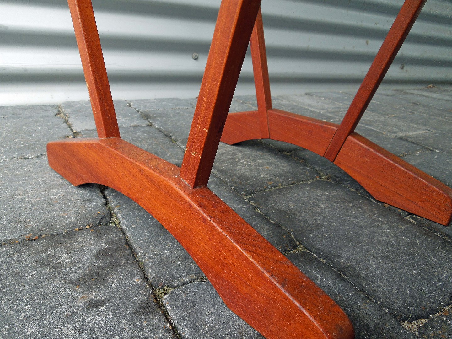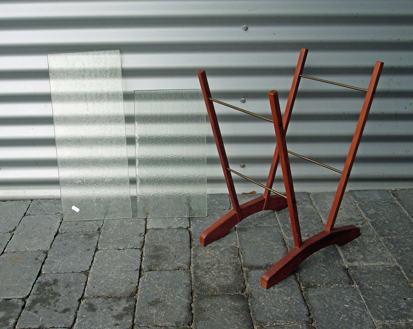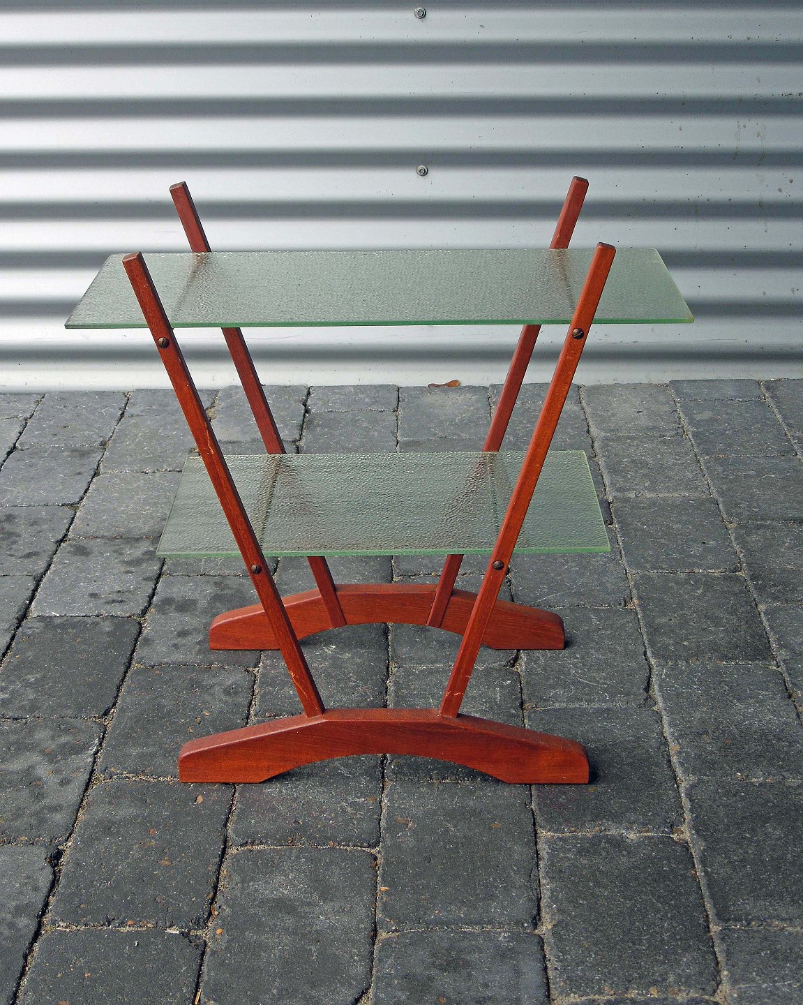 Vifteformet plantebord med 2 glasplader. Bordet er i teaktræ og fremstår med få brugsspor på glas og stel.