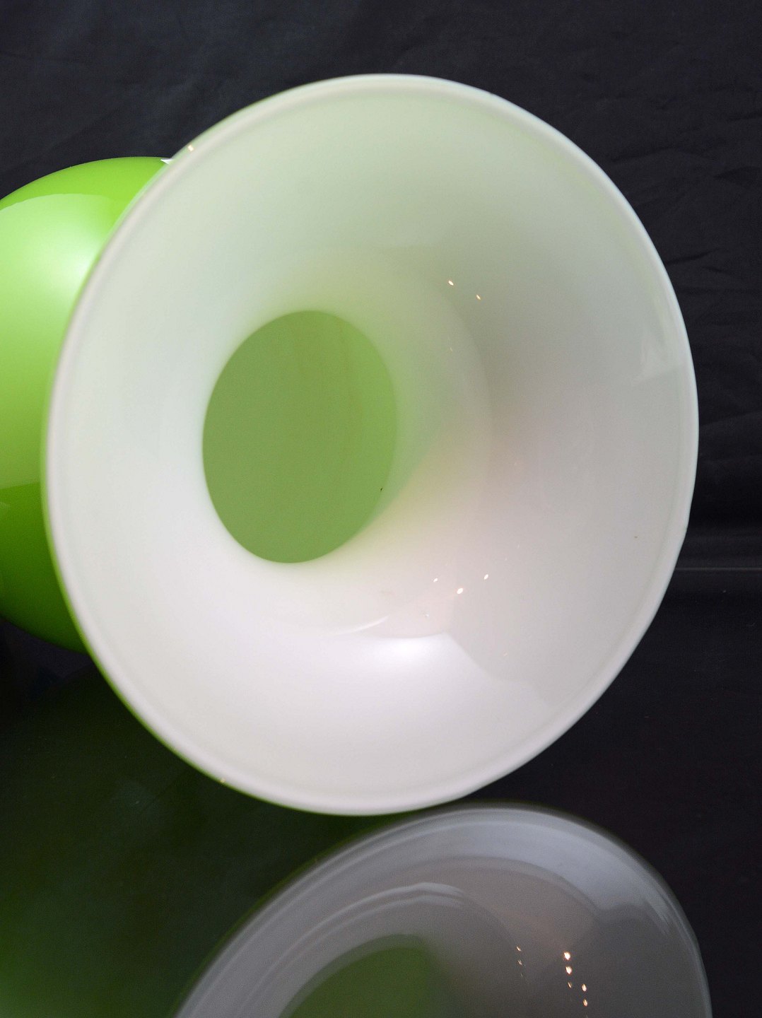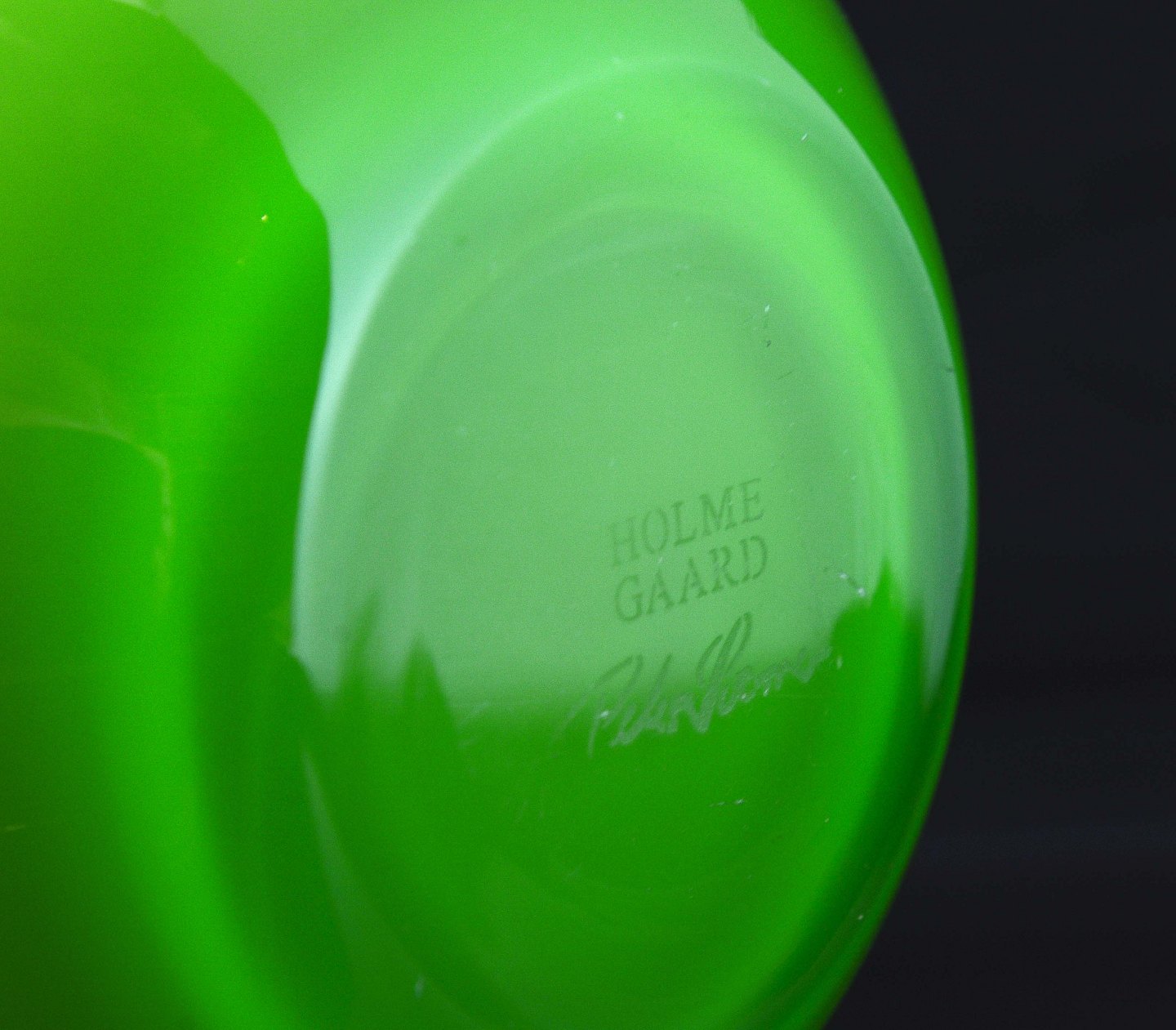 Opalhvid vase med grønt omfangsglas. Designet af Peter Svarrer for Holmegård.