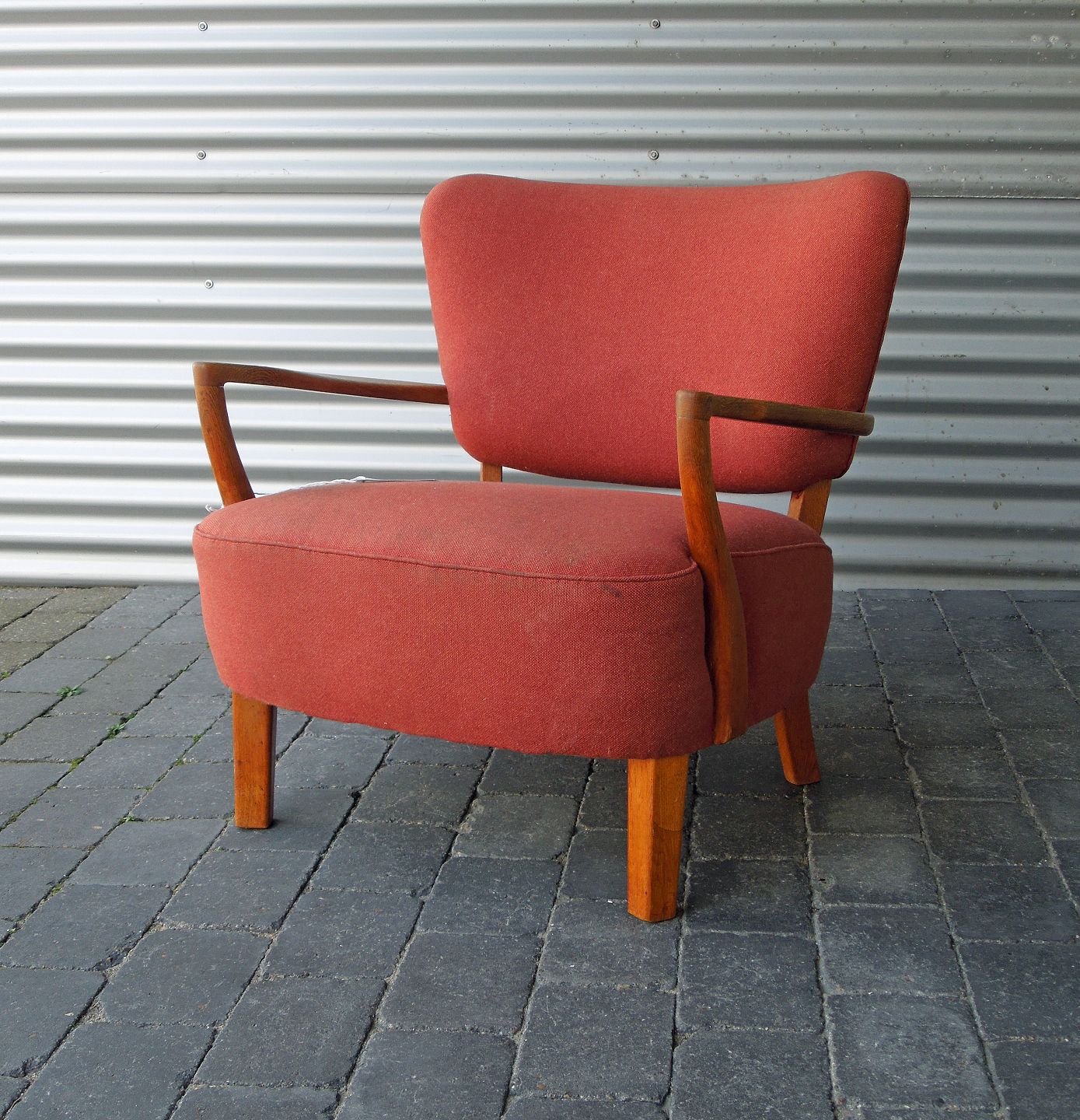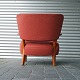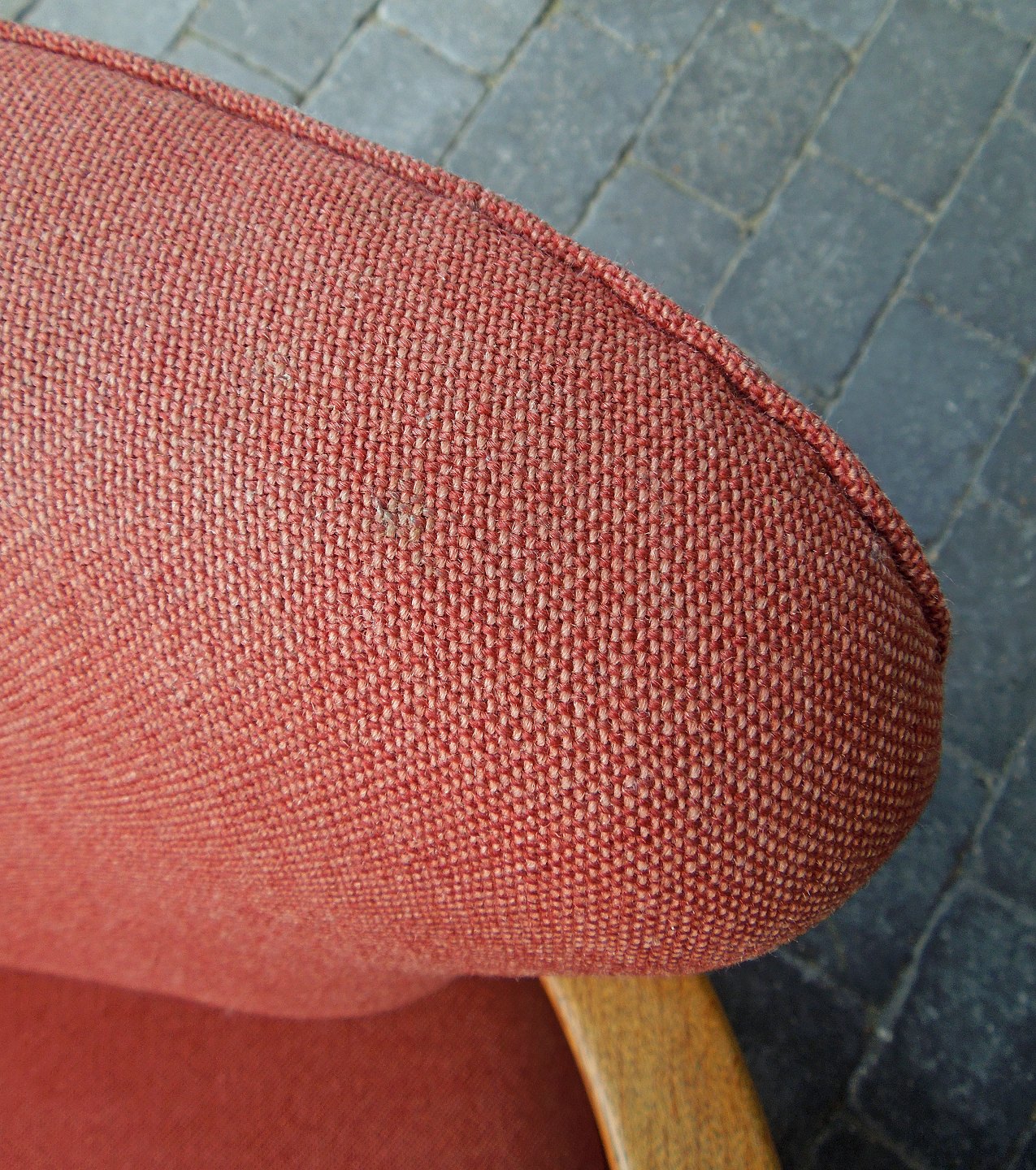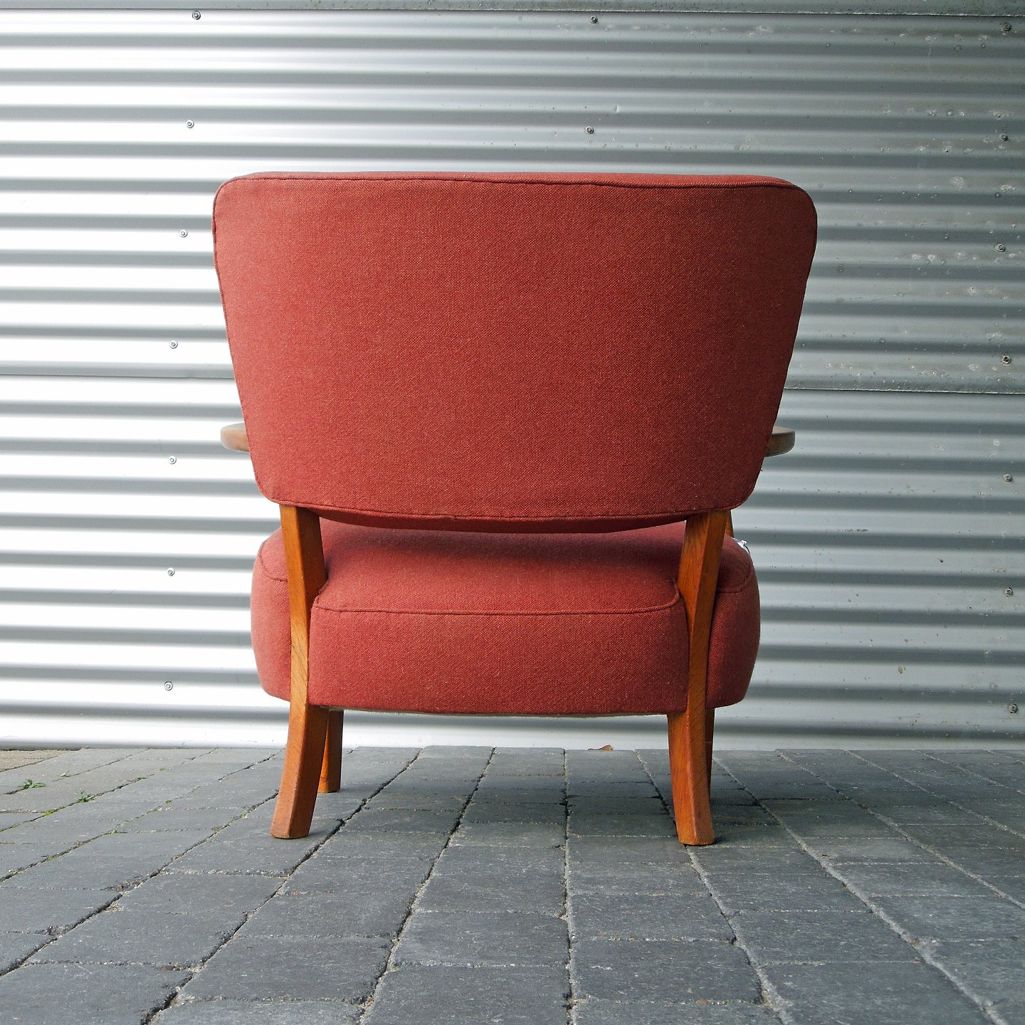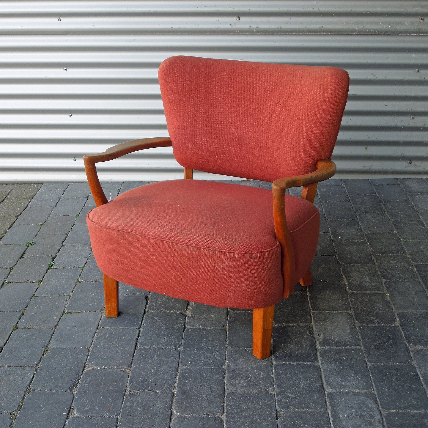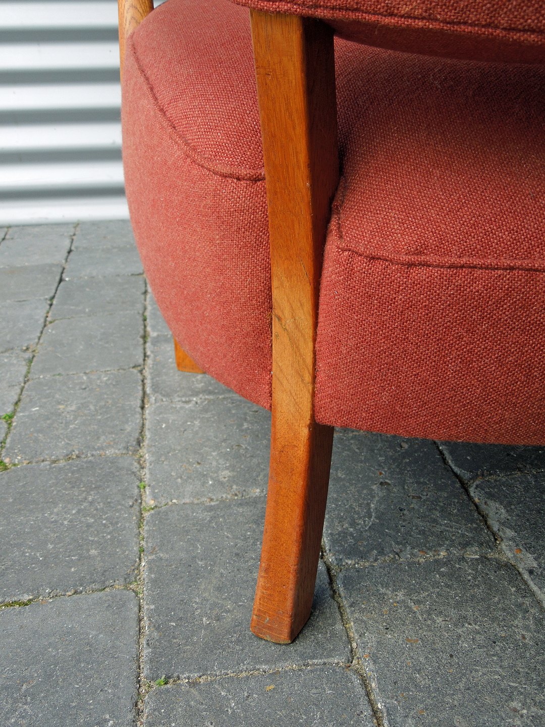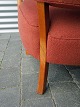 Overpolsteret lænestol. Ege stel, der er polstret "solbleget" rødt stofbetræk på ryg og sæde.