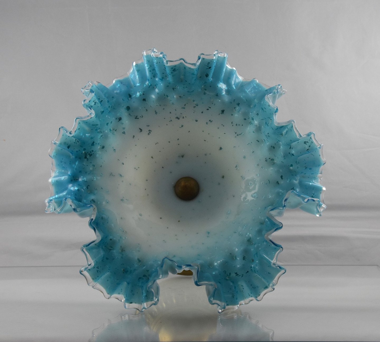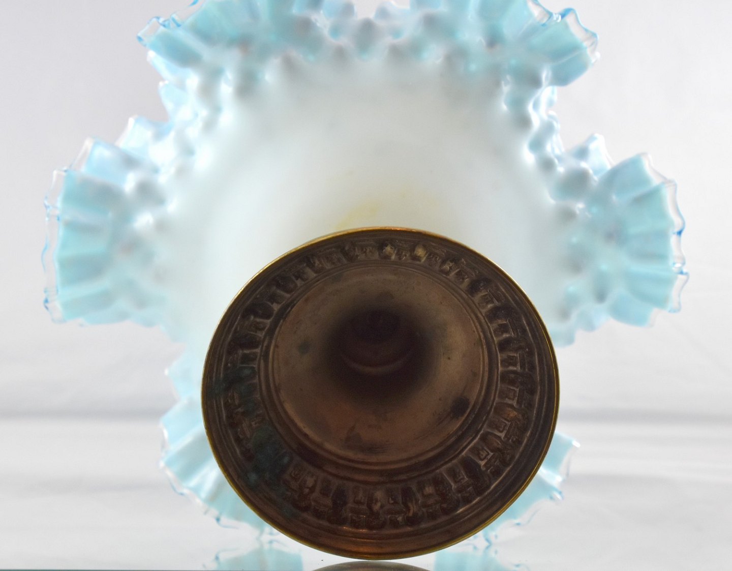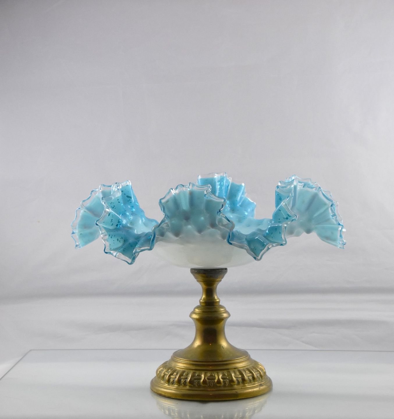 Blå-hvid glasopsats med blondekant og messingfod. Opsatsen var moderne omkring 1900 som visitkortholder.