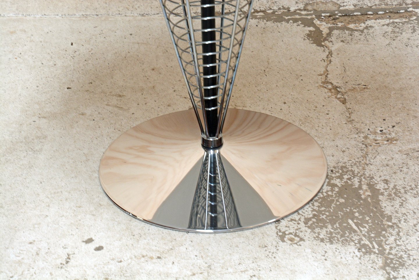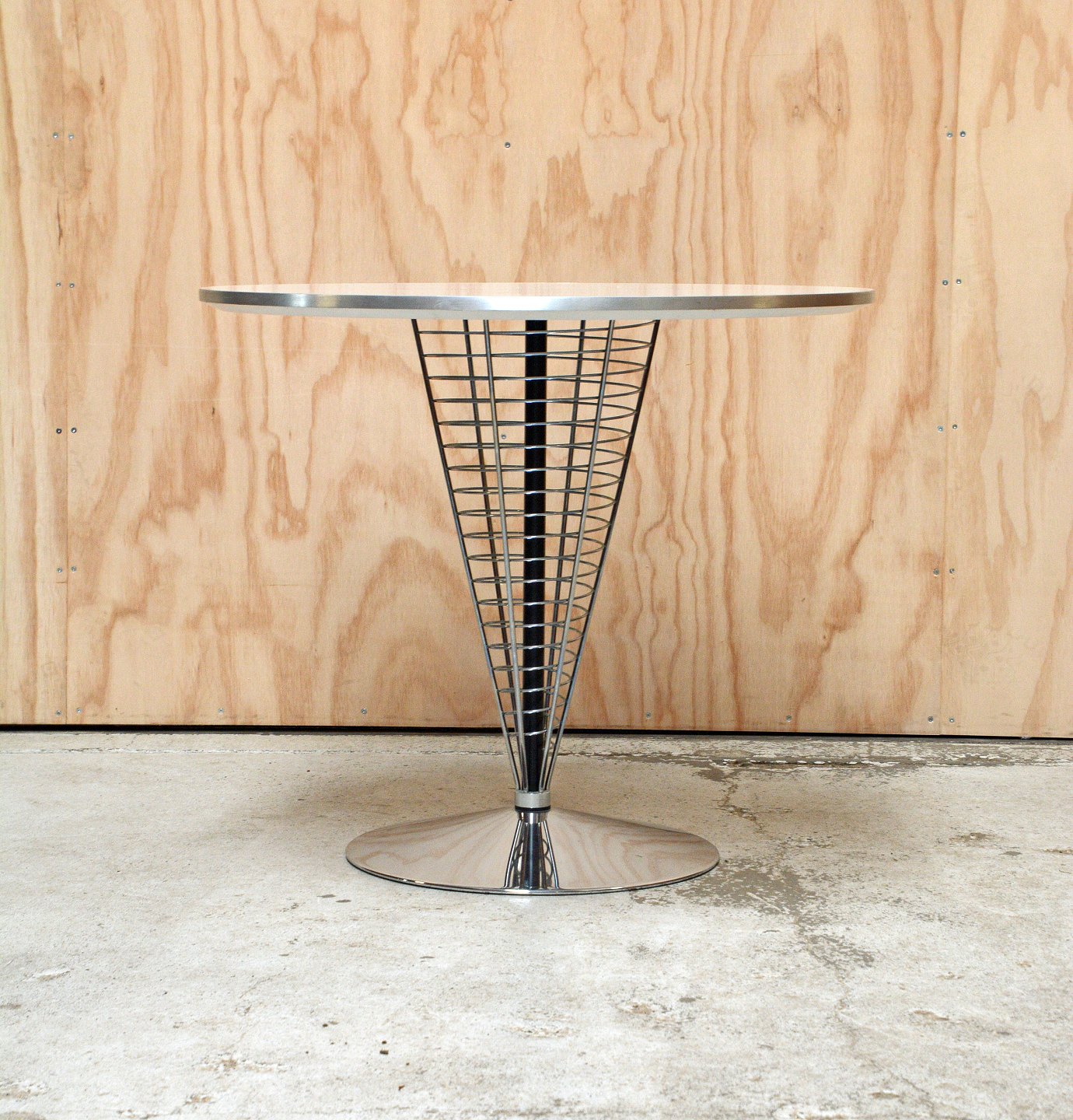 Sofabord designet af Verner Panton for Fritz Hansen. Lavet til kæmmerhusstolene. Bordet har stel af krom med hvid Formica bordplade. Enkelte brugsspor på bordpladen.
