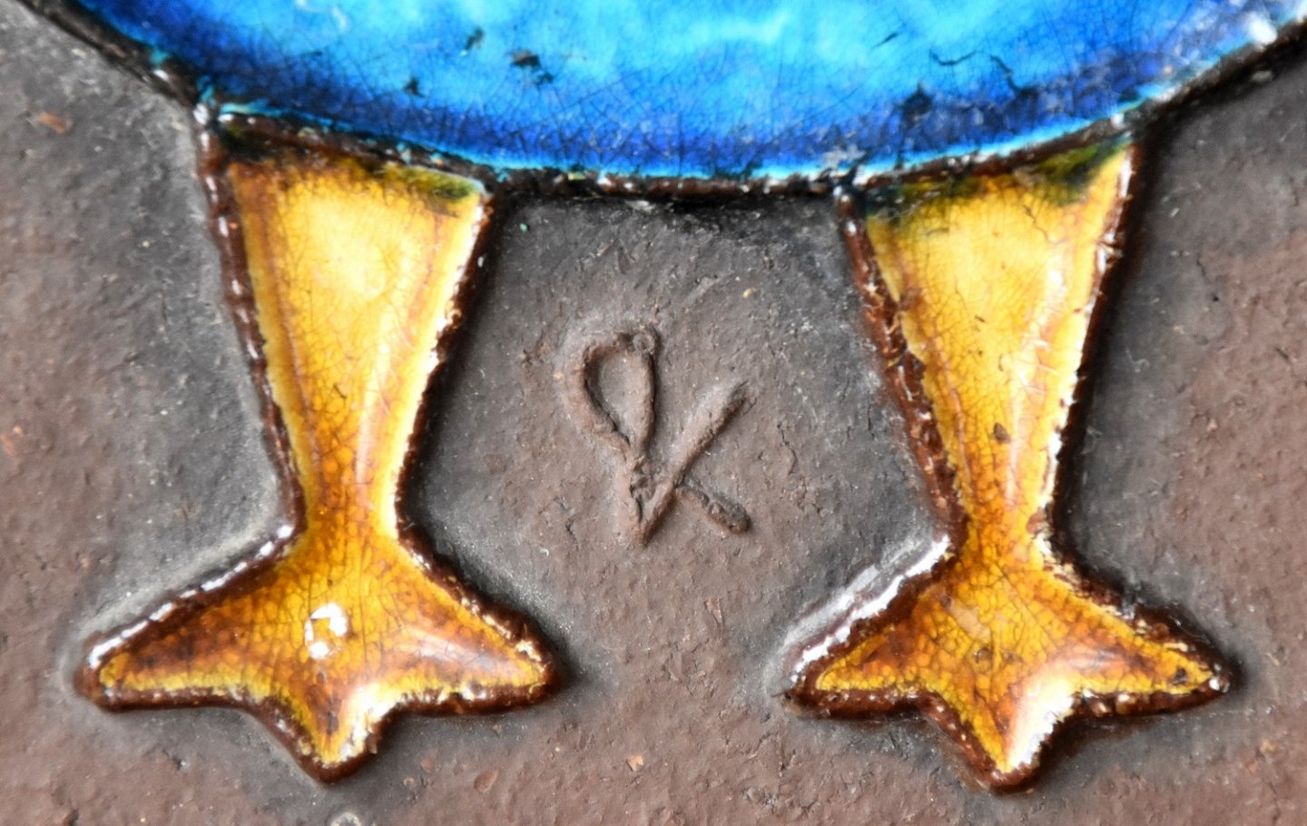 Tre blå fugle på brun baggrund. Relief, stentøj