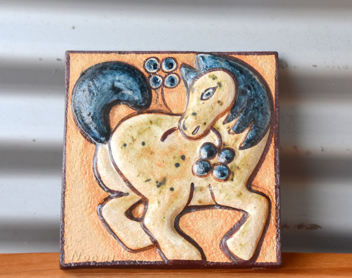 Lys og blå hest på brun baggrund. Noomi 4008, Søholm Bornholm Stentøj