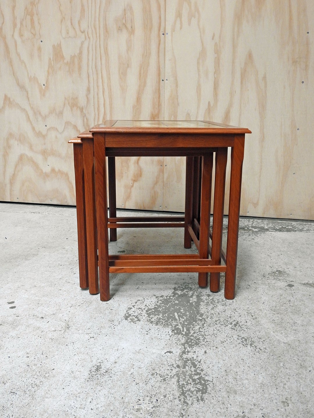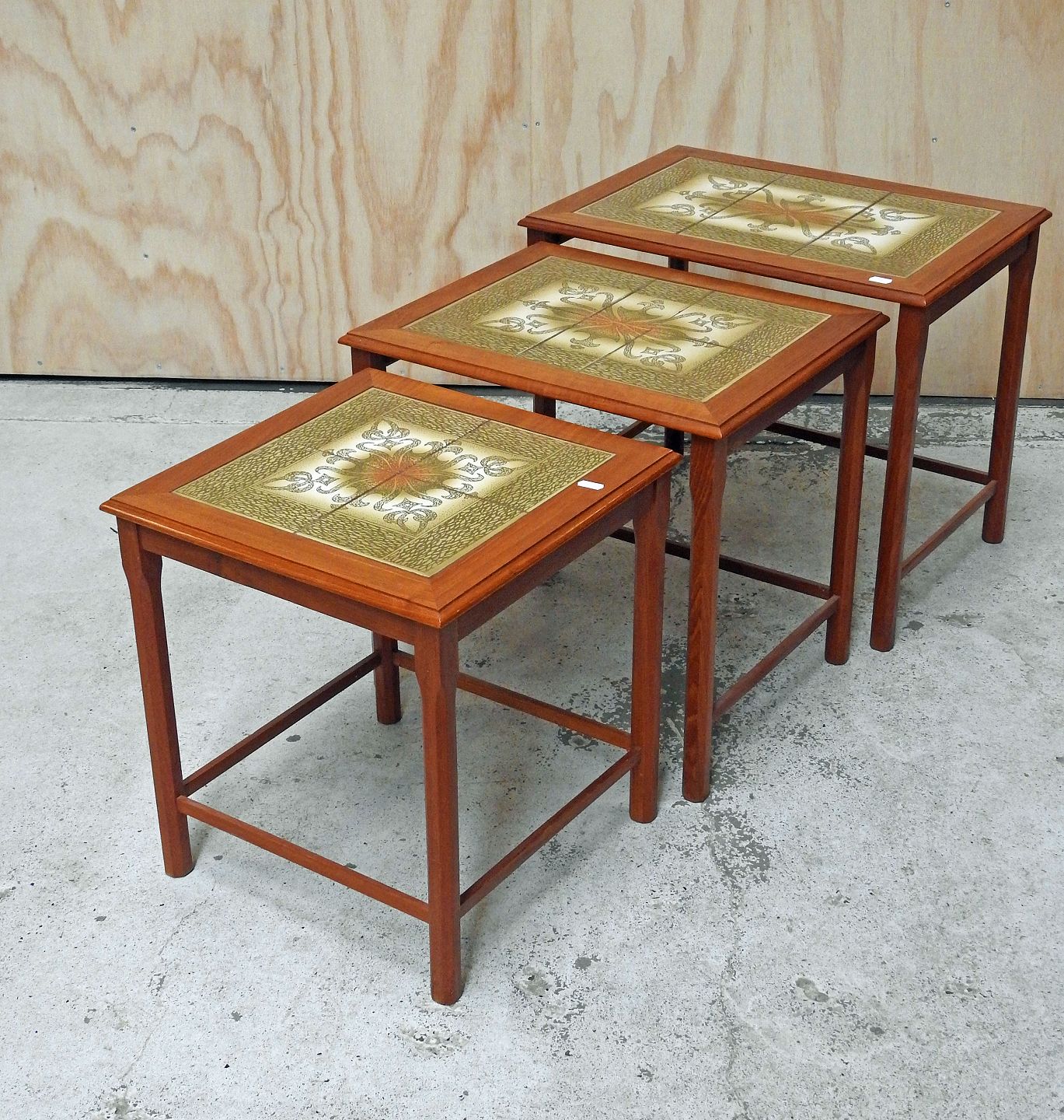 Indskudsborde i teaktræ med kakler. Dansk møbeldesign. Tre borde med mønstrede kakler i grøn og brune farver.