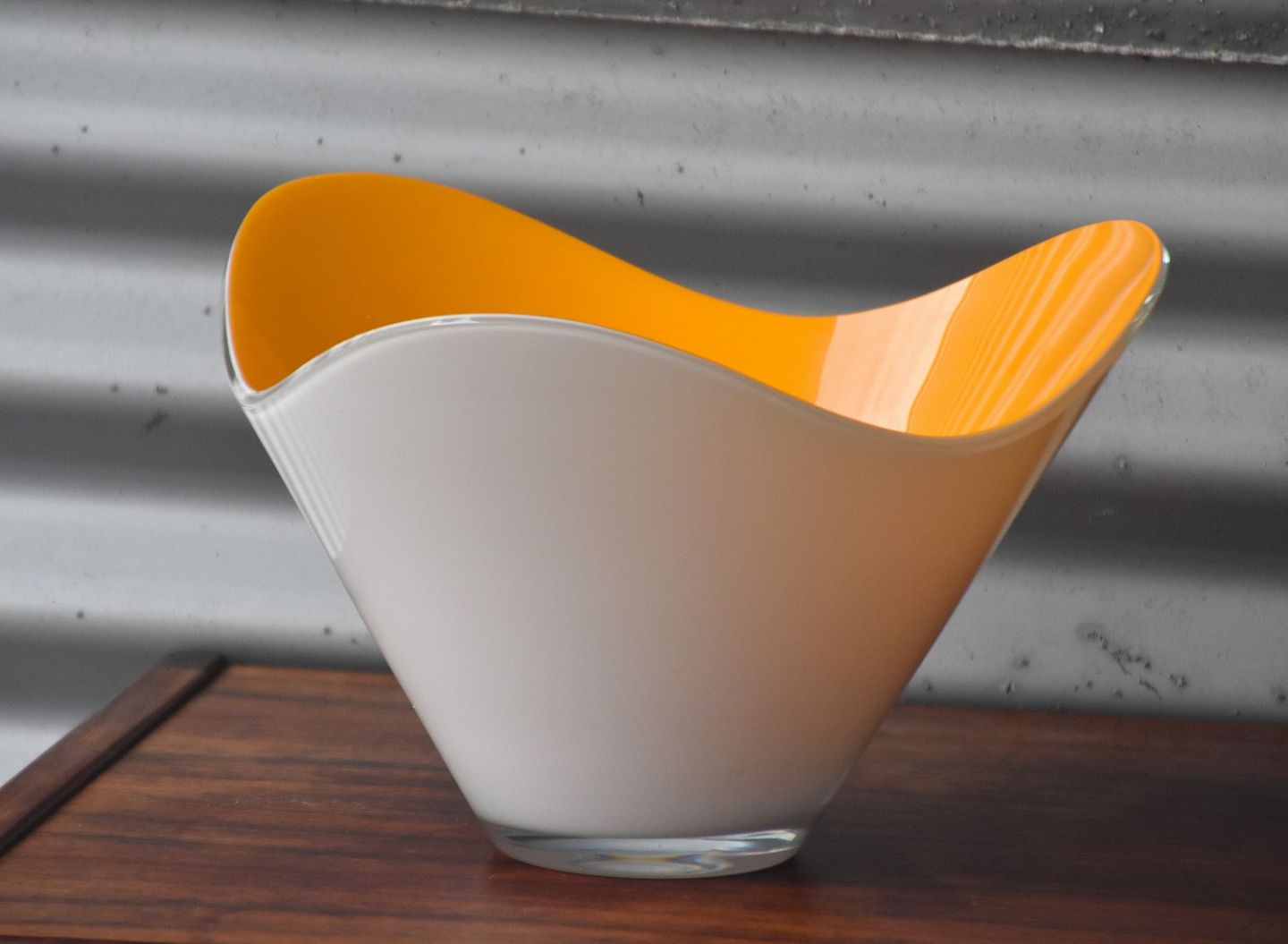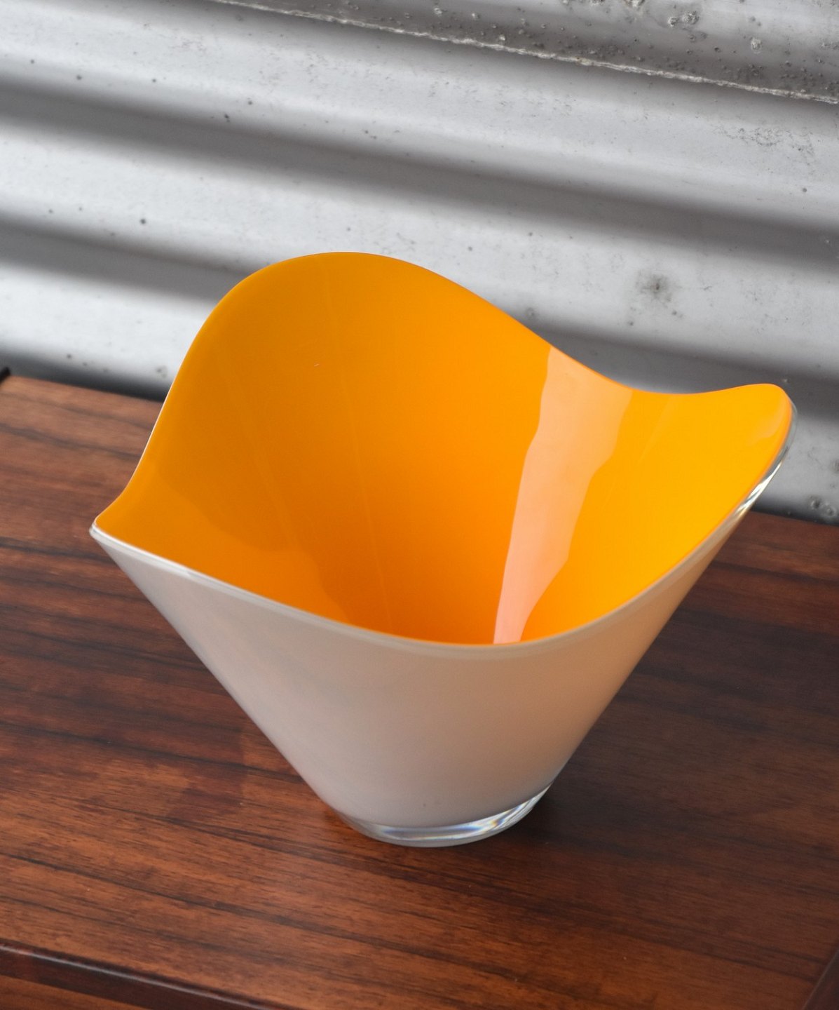 Holmegaard glasskål, skålen er hvid udvendig og orange indvendig, designer Piet Hein. Inskription i bunden "Holmegaard - Piet Hein"