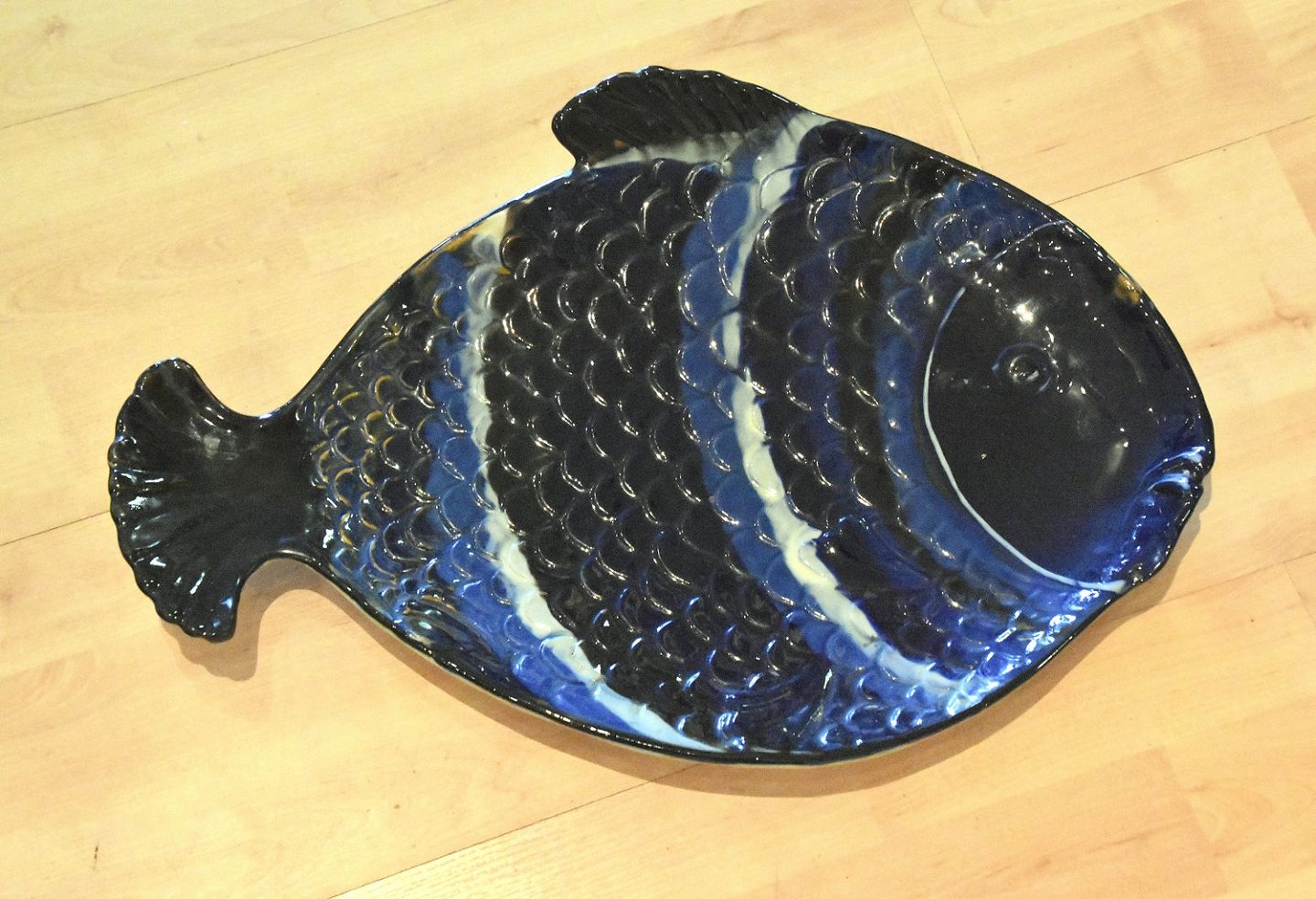 Keramik fad fra Kæhler formet som fisk i blålige nuancer