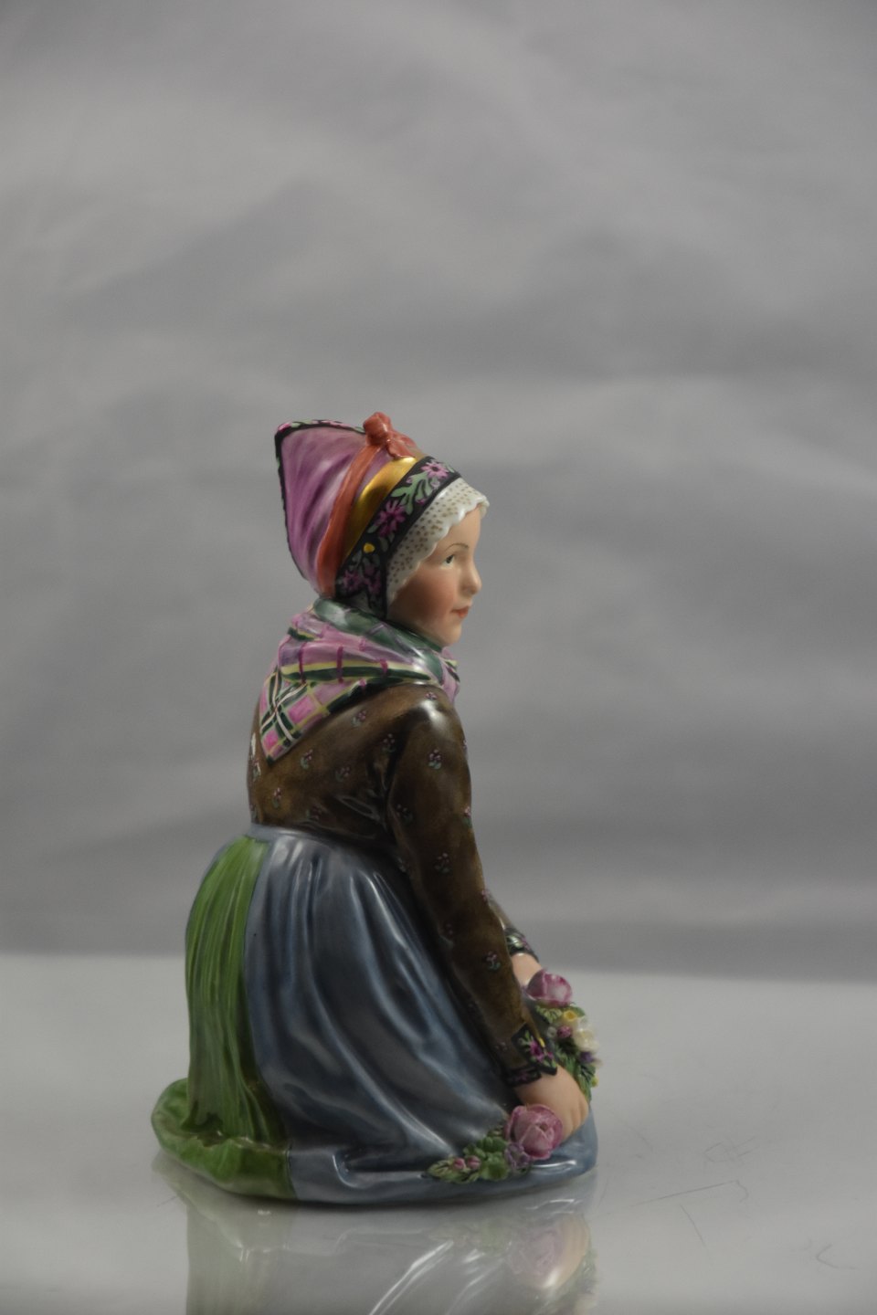 Kvinde i egnsdragt fra Fanø, hun sidder på hug og laver blomsterranker overglassur