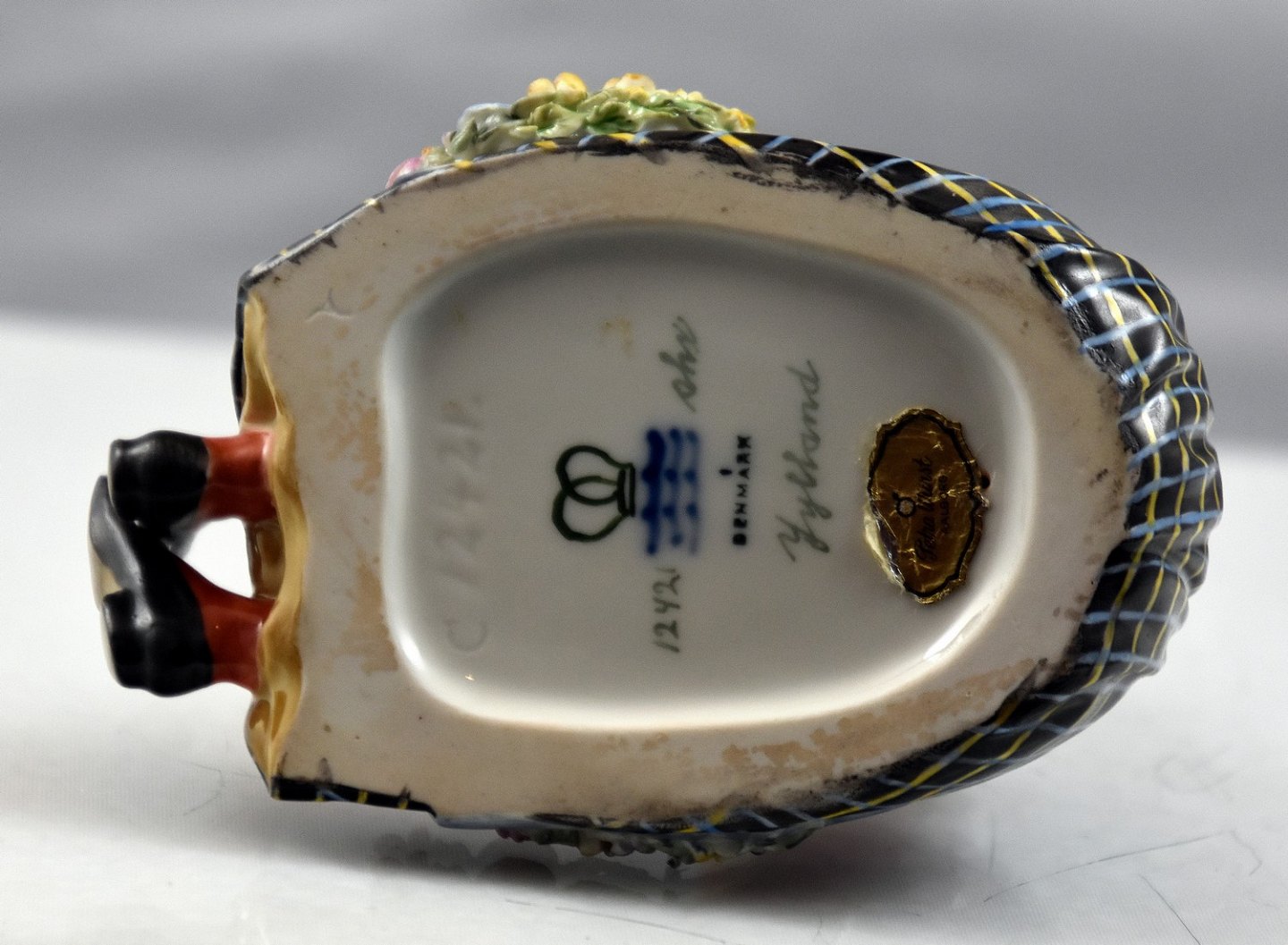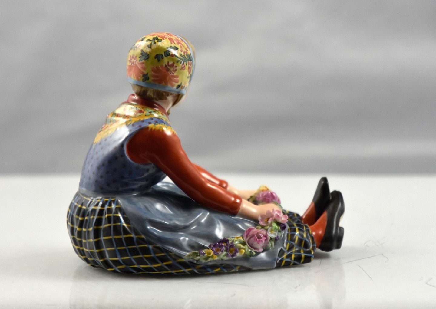 Siddende pige i egnsdragt fra Jylland, sidder med blomster i hænderne, overglasseret