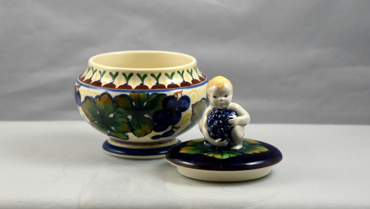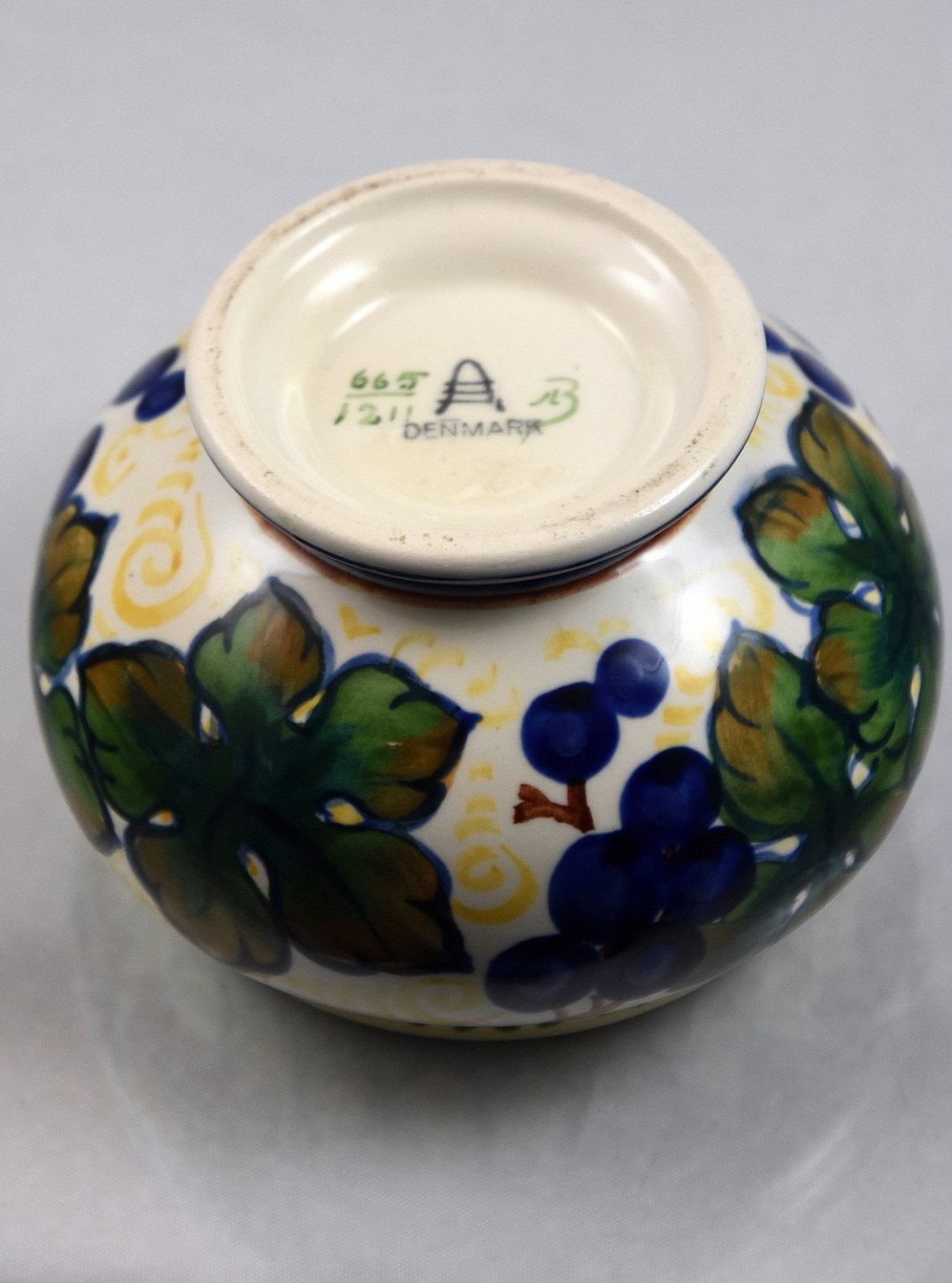 Bonbonniere lågkrukke med dreng og druer fra Aluminia nr. 665/1211