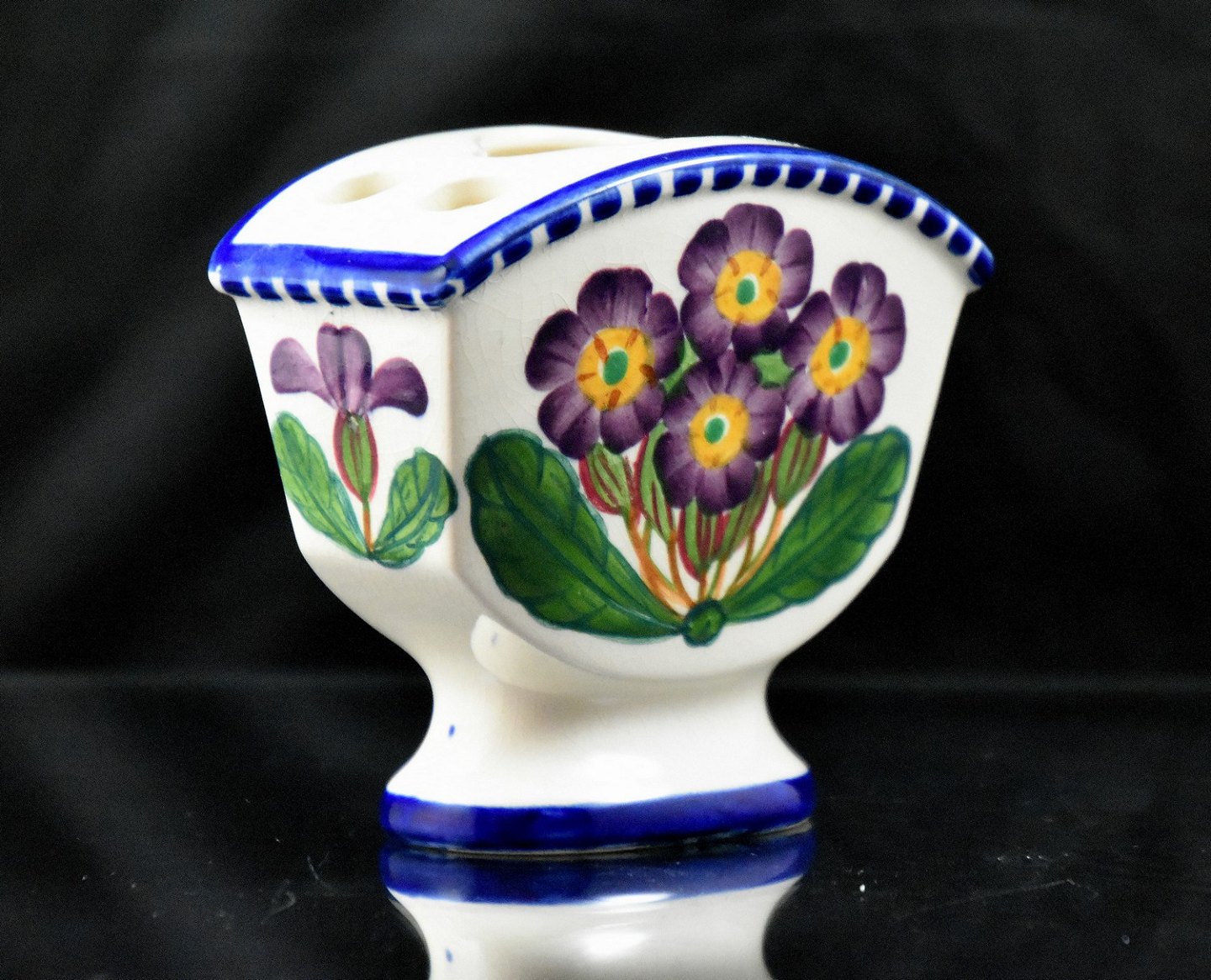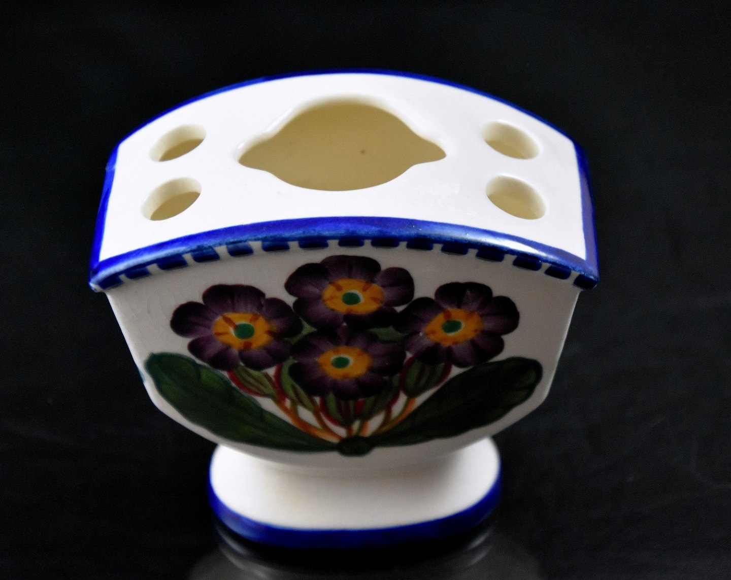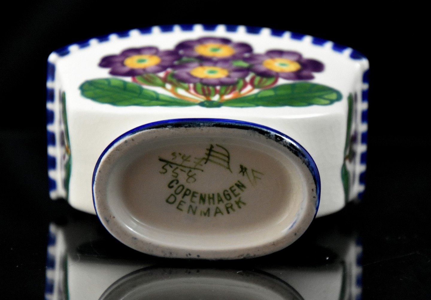 Aluminia blomster opsats, jardinere med buet rist 547/558, der er med lilla blomster på fladerne, kunstfajance opsatsen er designet af Christian Joachim, 1908.
