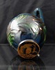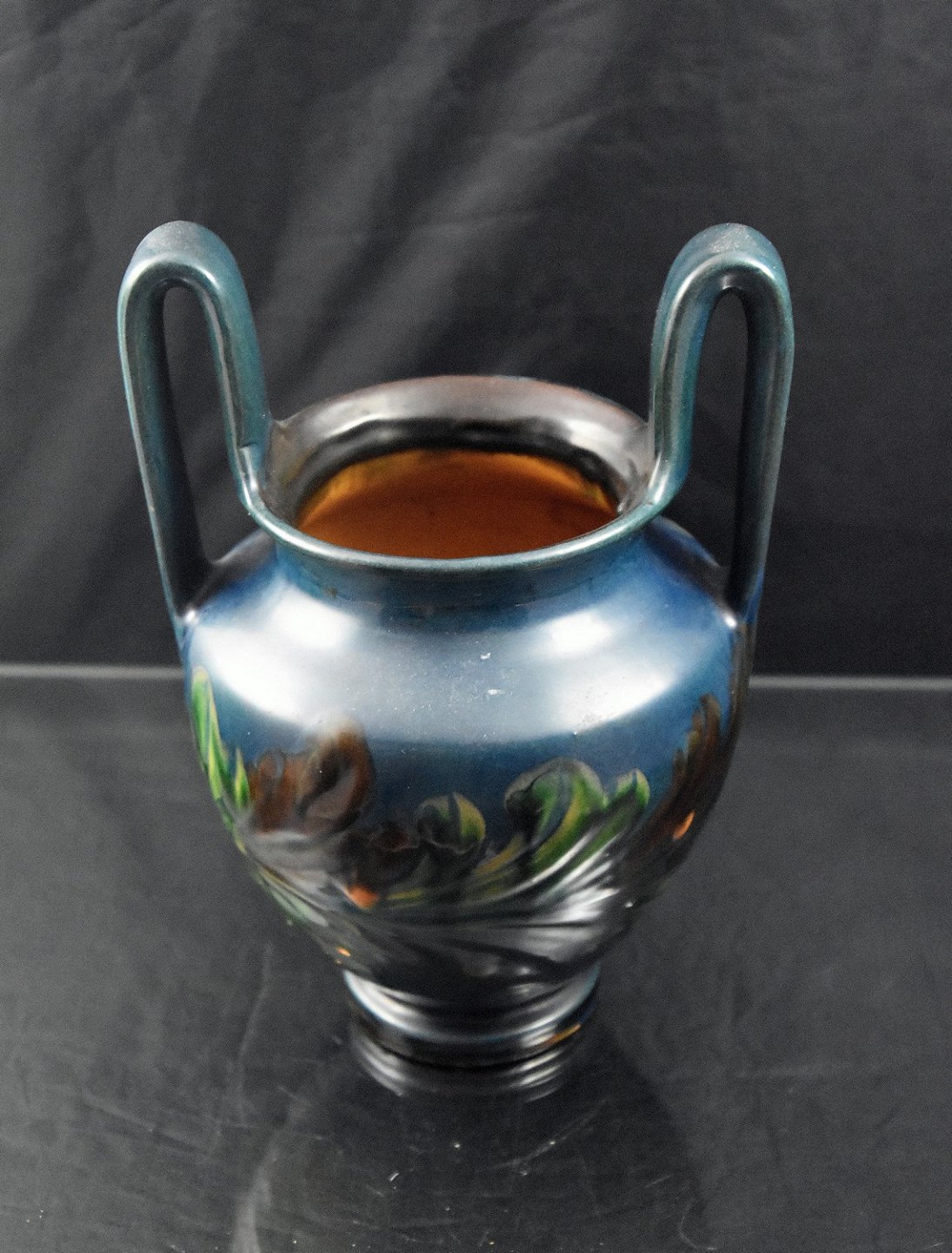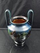 Kähler vase med 2 hanke, keramik, kohornsglassur. Blå med grønne og brune dekorationer, mørke farver.