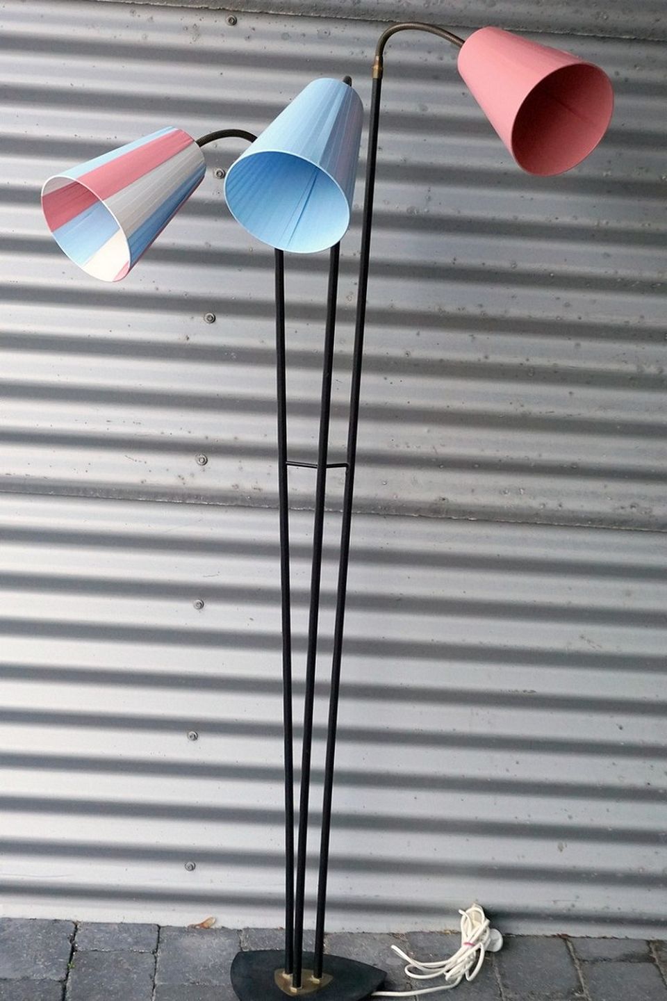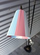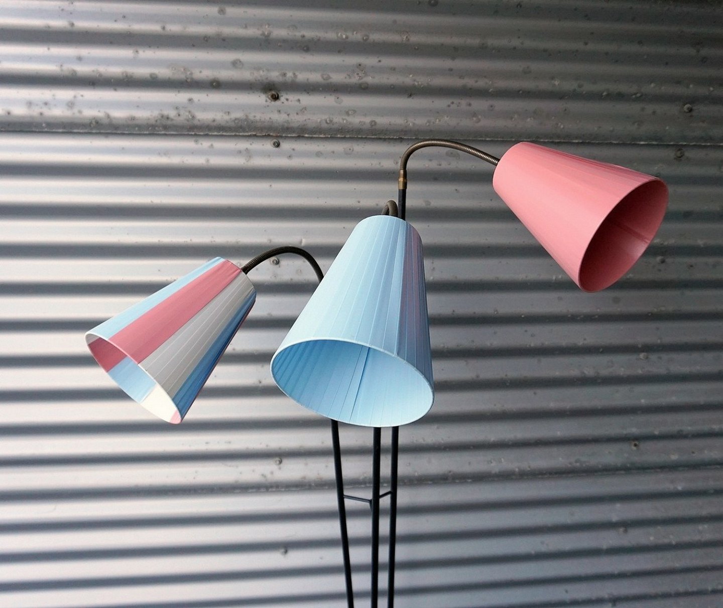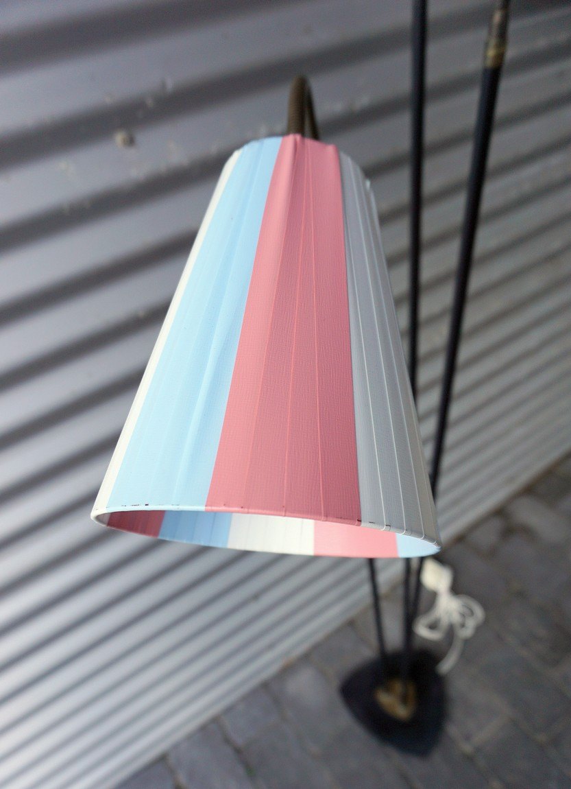 Standerlampe med 3 skærme, skærmene er omviklet med plast strimler i lys-rød, lys-blå og hvid. Skærmene er nye.