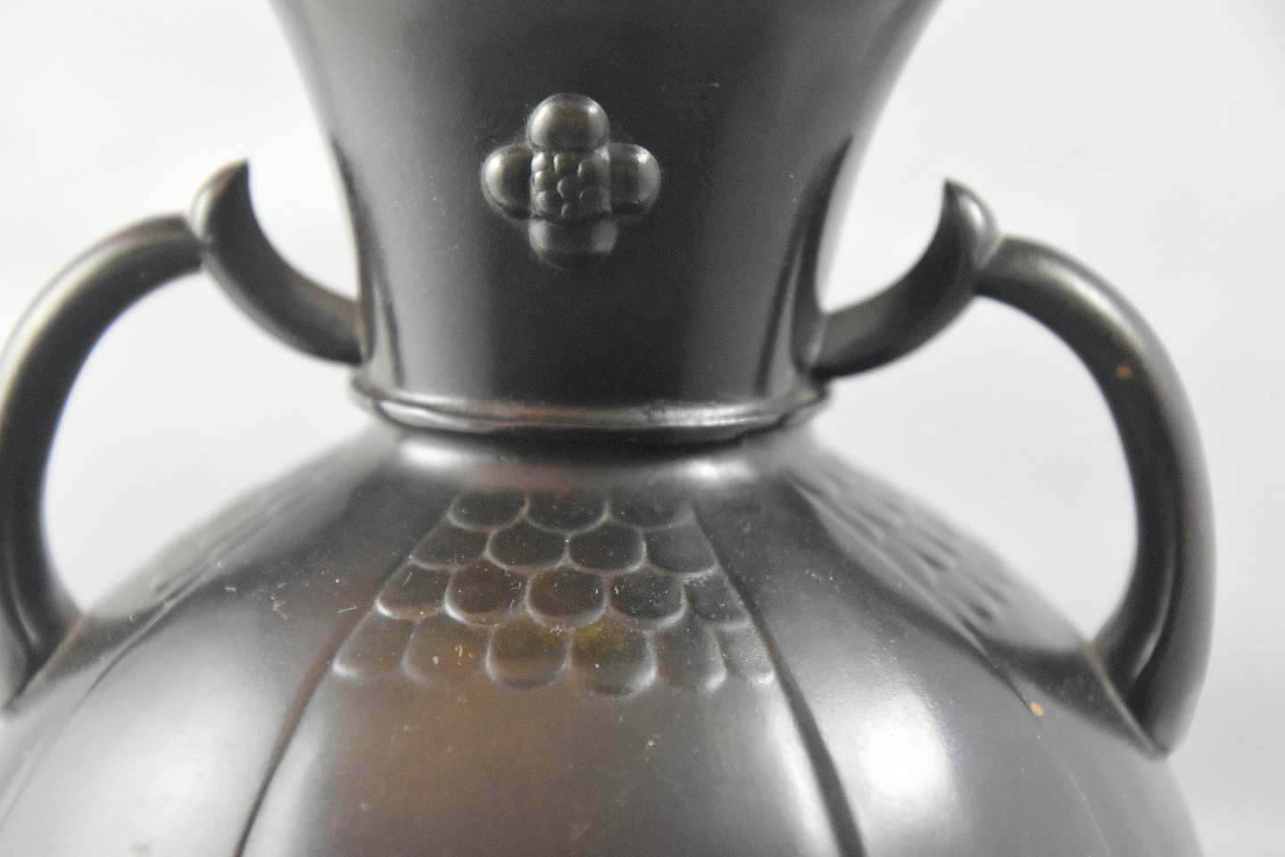 Just Andersen, kugleformet vase af Diskometal (D136), med hals og hanke. Stemplet monogram Just A