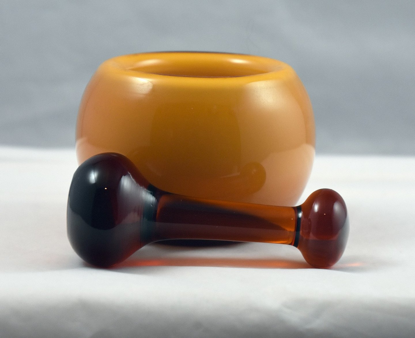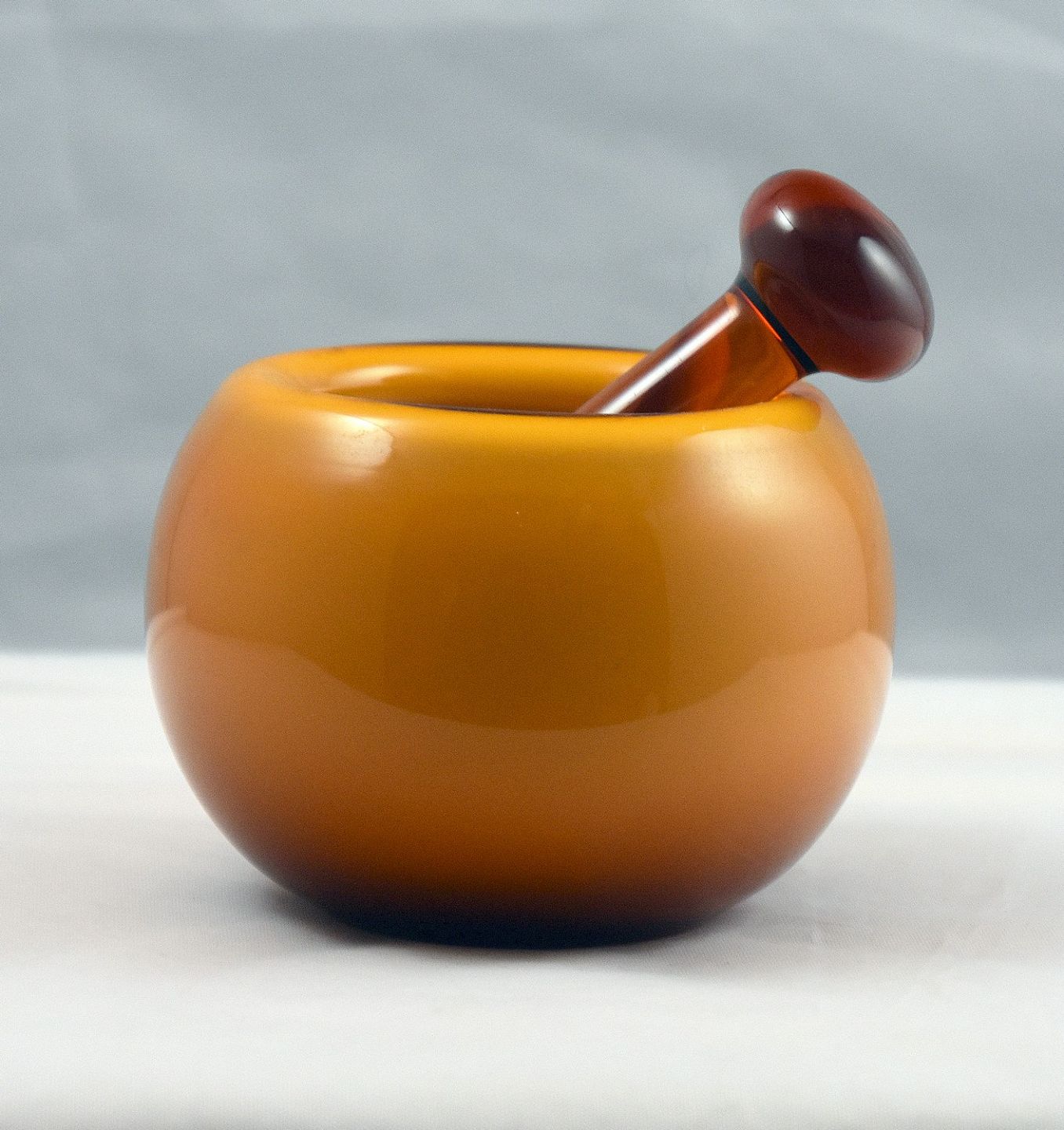 Holmegaard Palet glas, morter og støder, karamelfarvet. Design Michael Bang. Krydderimorter