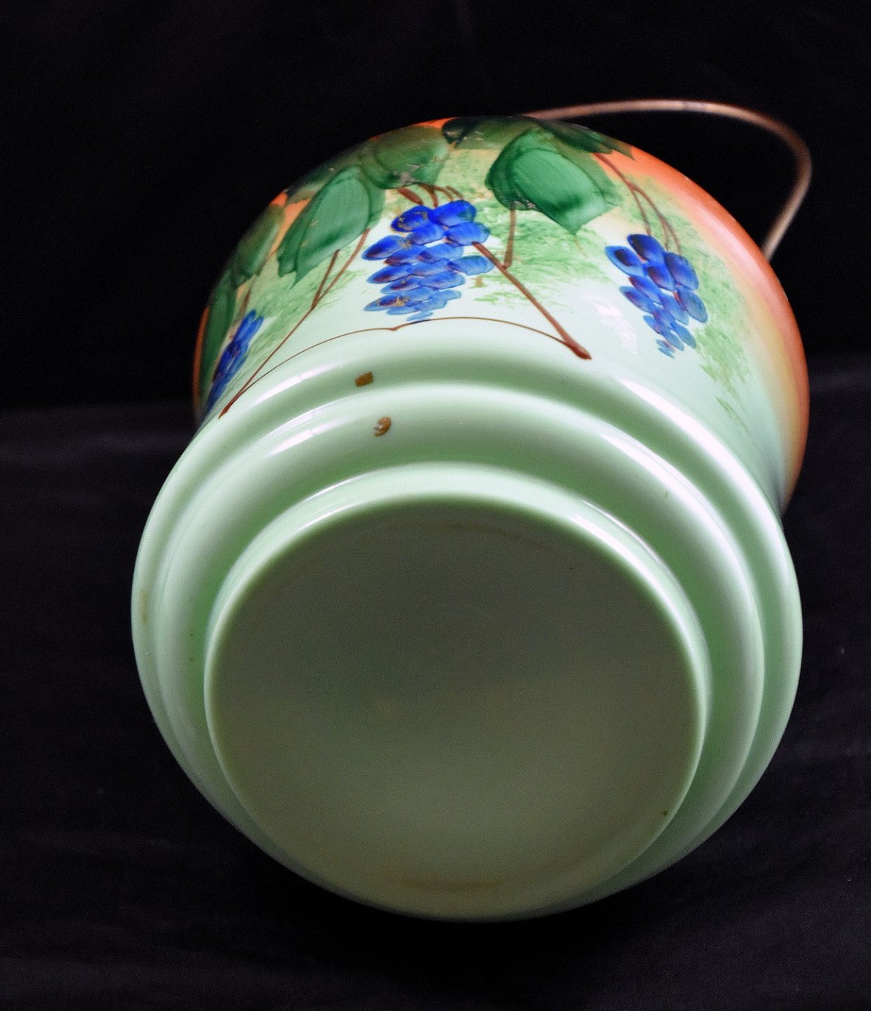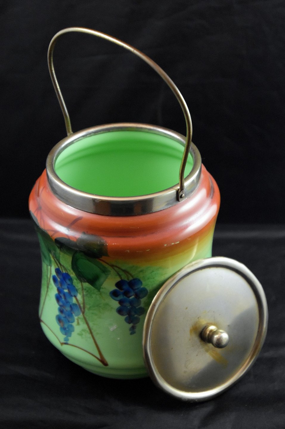 Grøn glas kiksespand, med dekoration af druer. Hank og låg er af stål