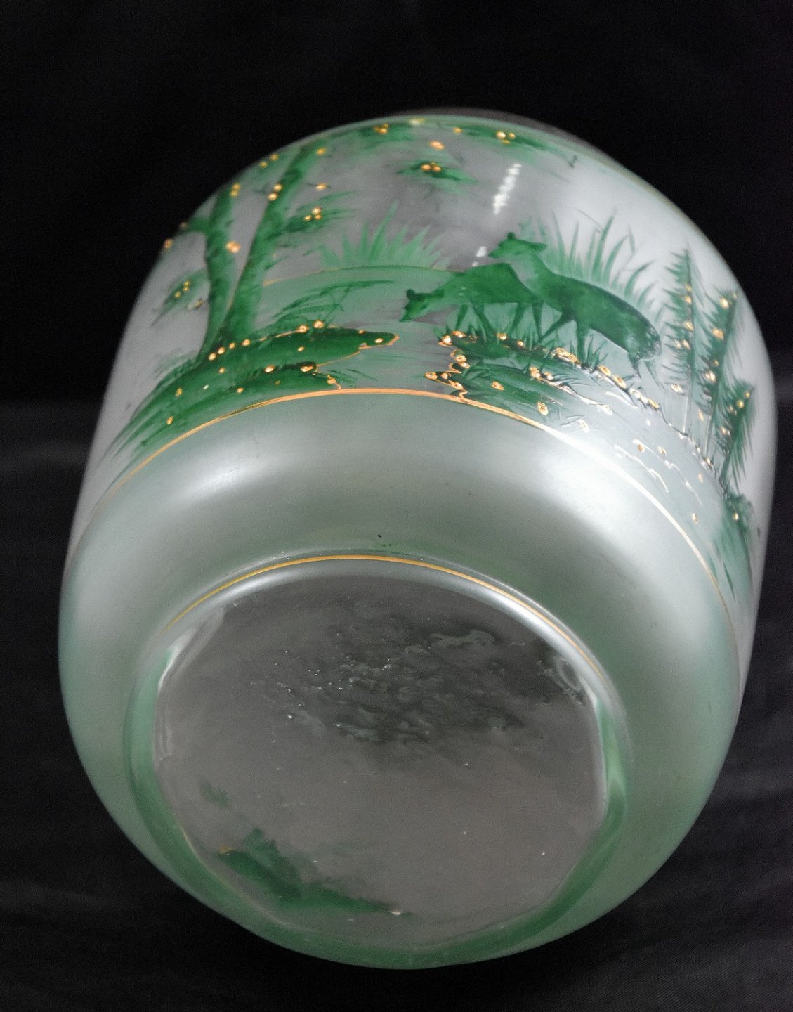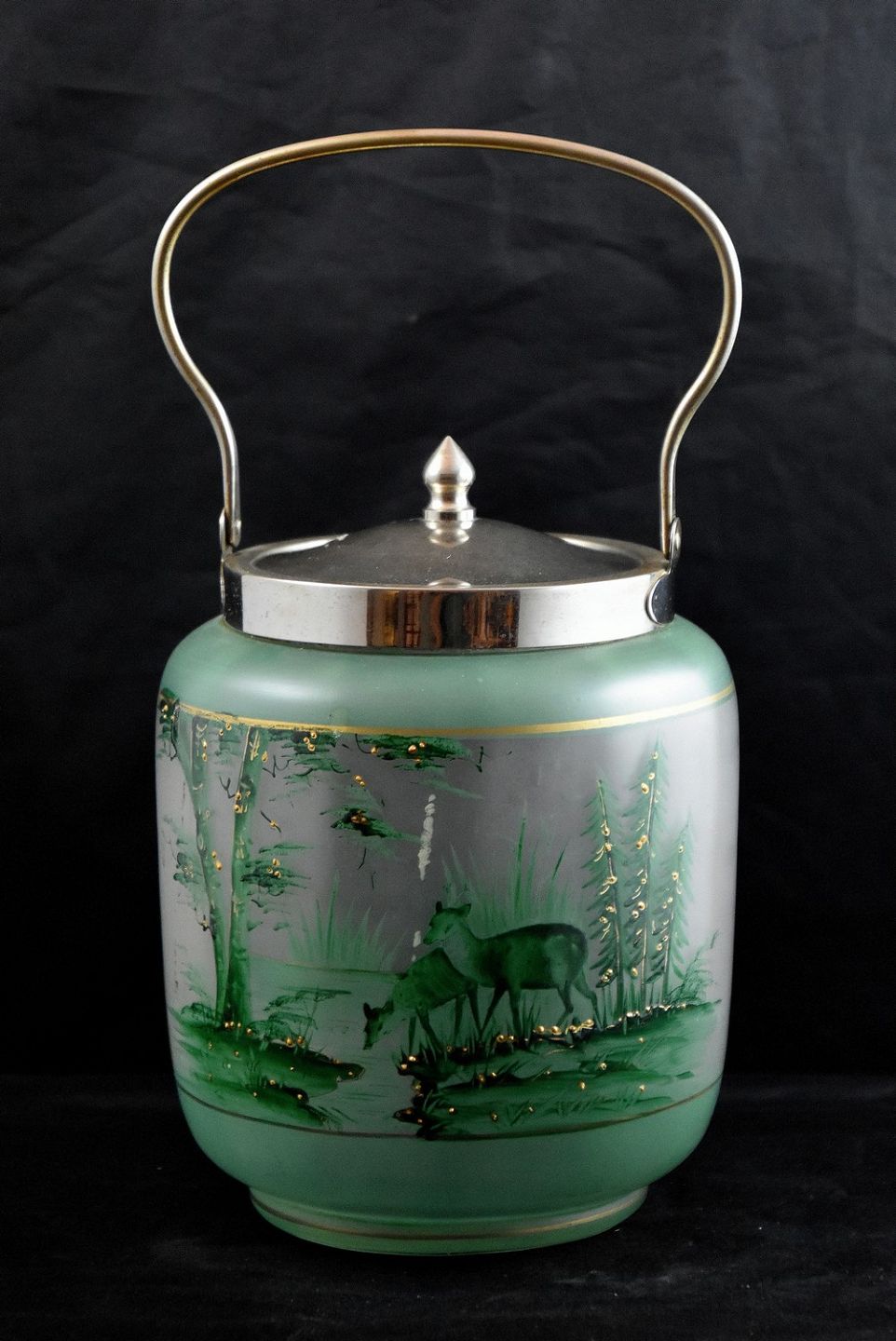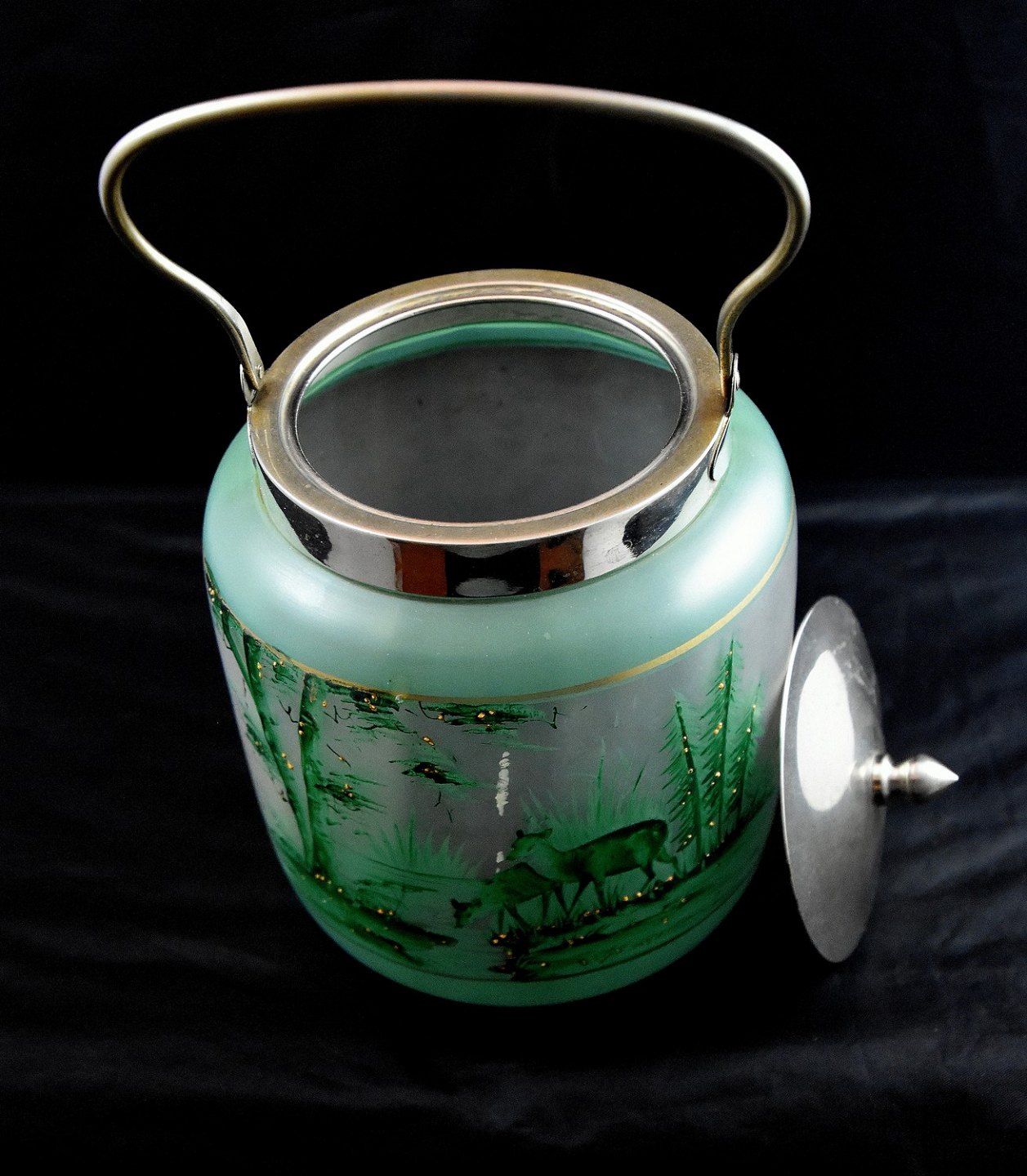 Glas Kiksespand, grøn med motiv af græssende dådyr. Hank og låg er af stål.