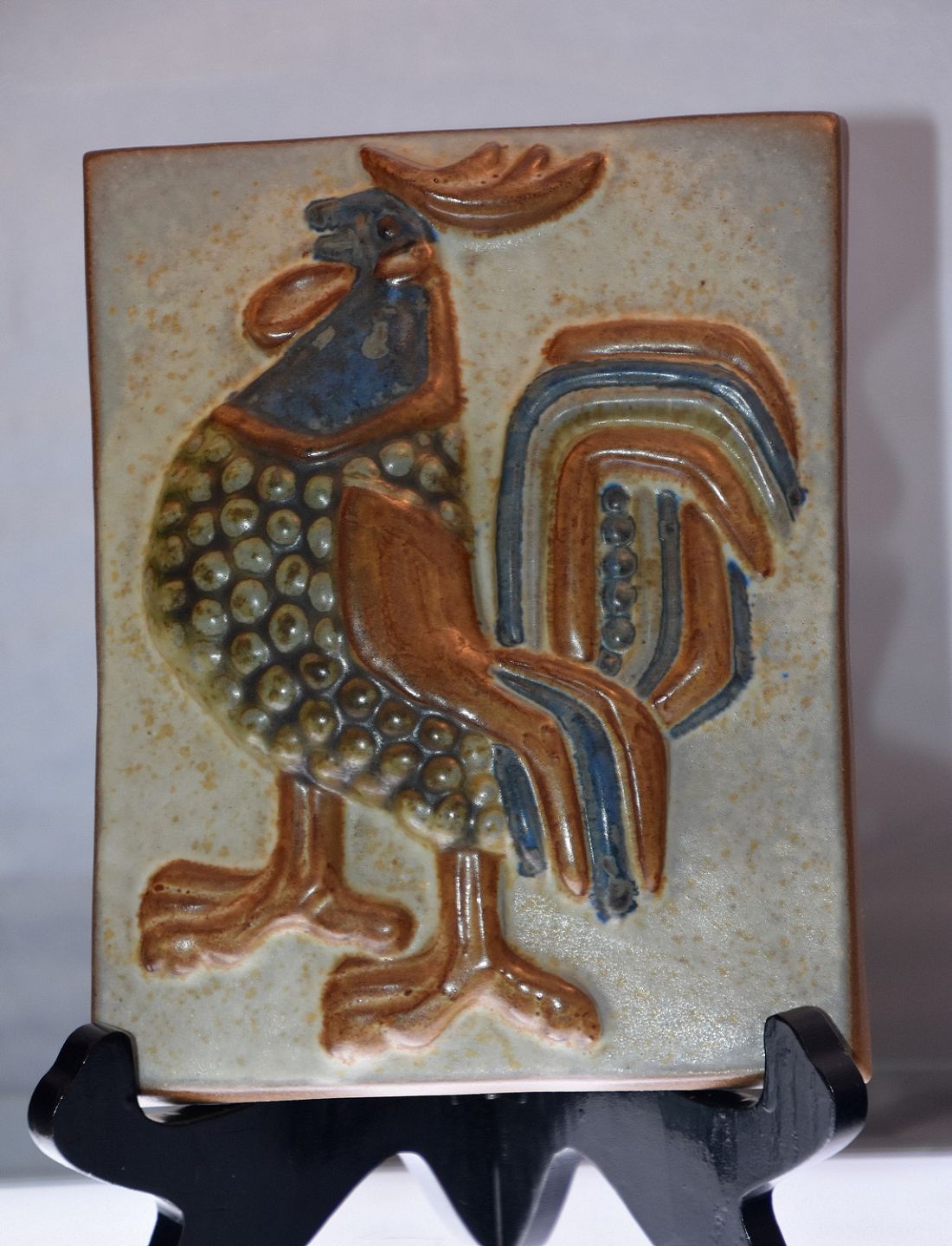 Michael Andersen relief. Hane i blålige farver af Marianne Starck for bornholmske Michael Andersen.