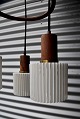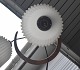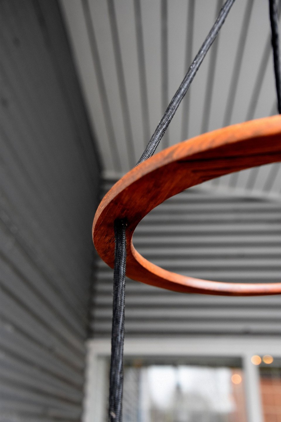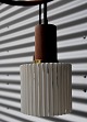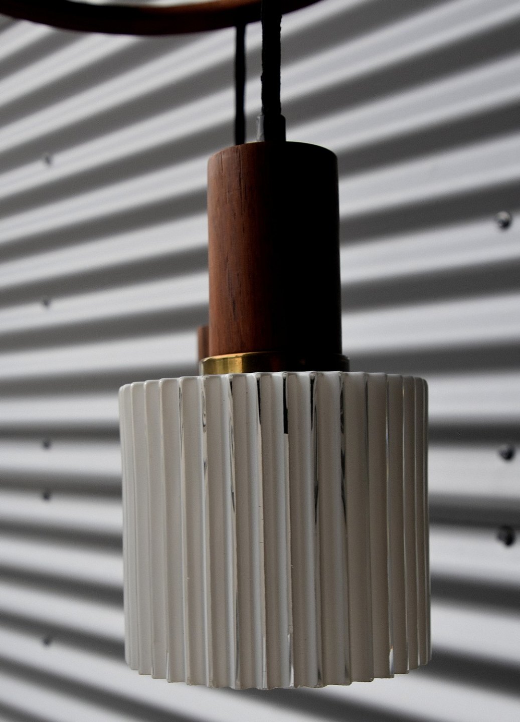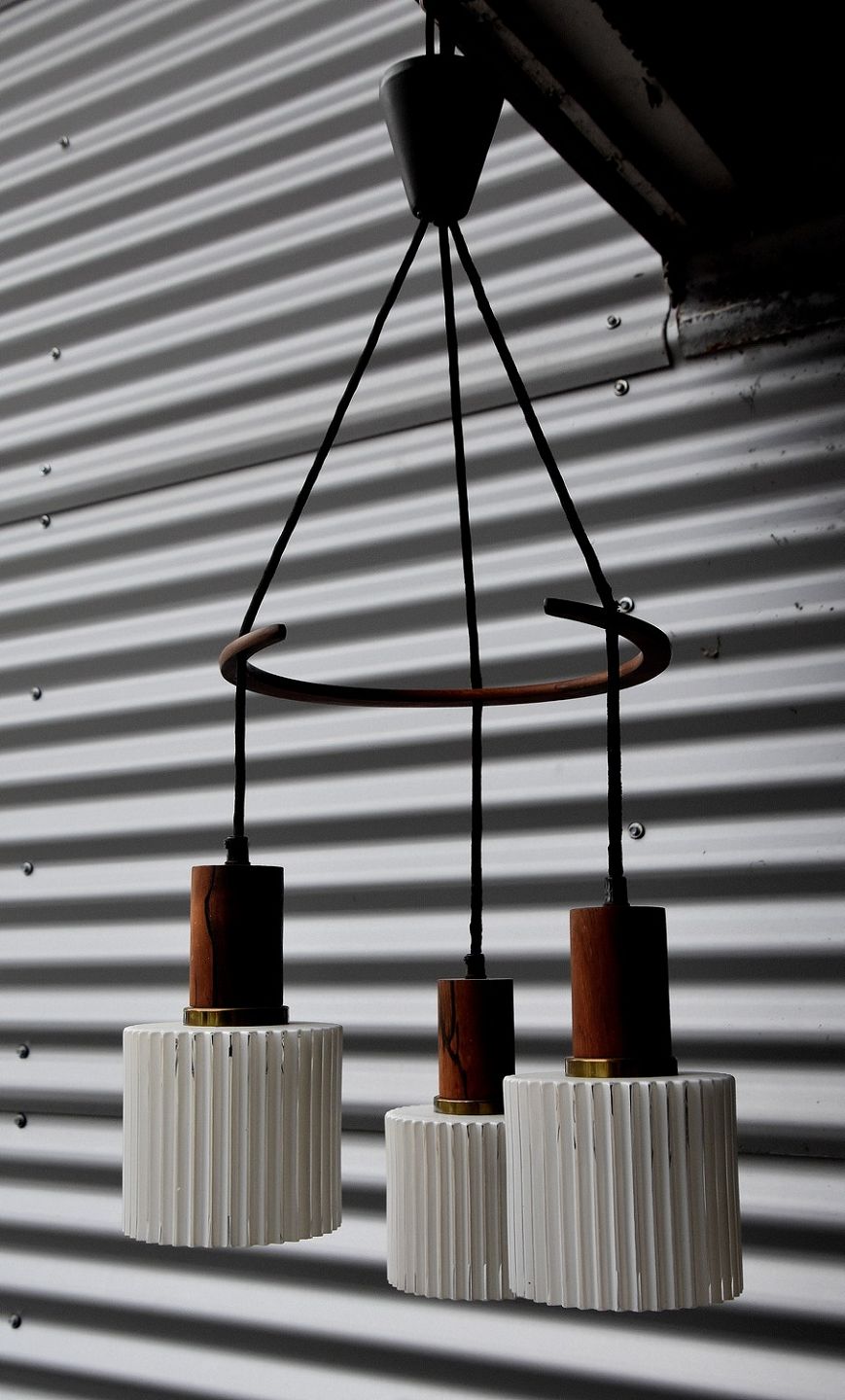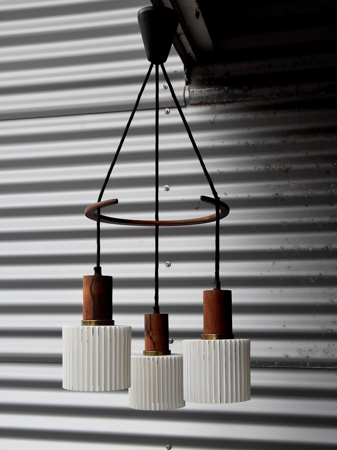 Loftslampe med 3 hvide glaspendler og teaktræs halvring, til at holde på pendlerne