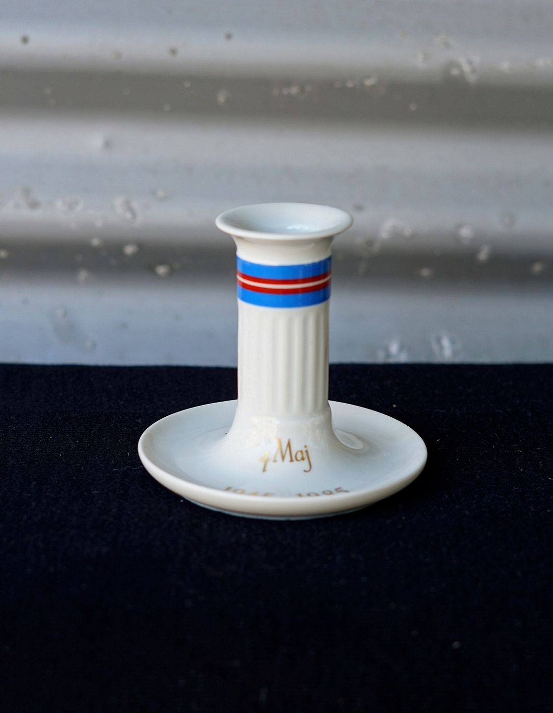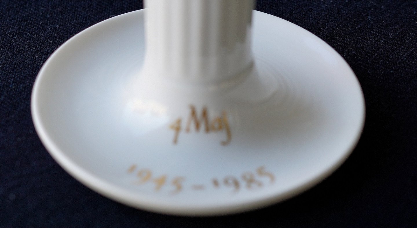 Royal Copenhagen 4. Maj lysestage. På den kongelige lysestage er skrevet med guld 4. Maj 1945-1985 til fejring af Danmarks befrielse. RC/KGL.