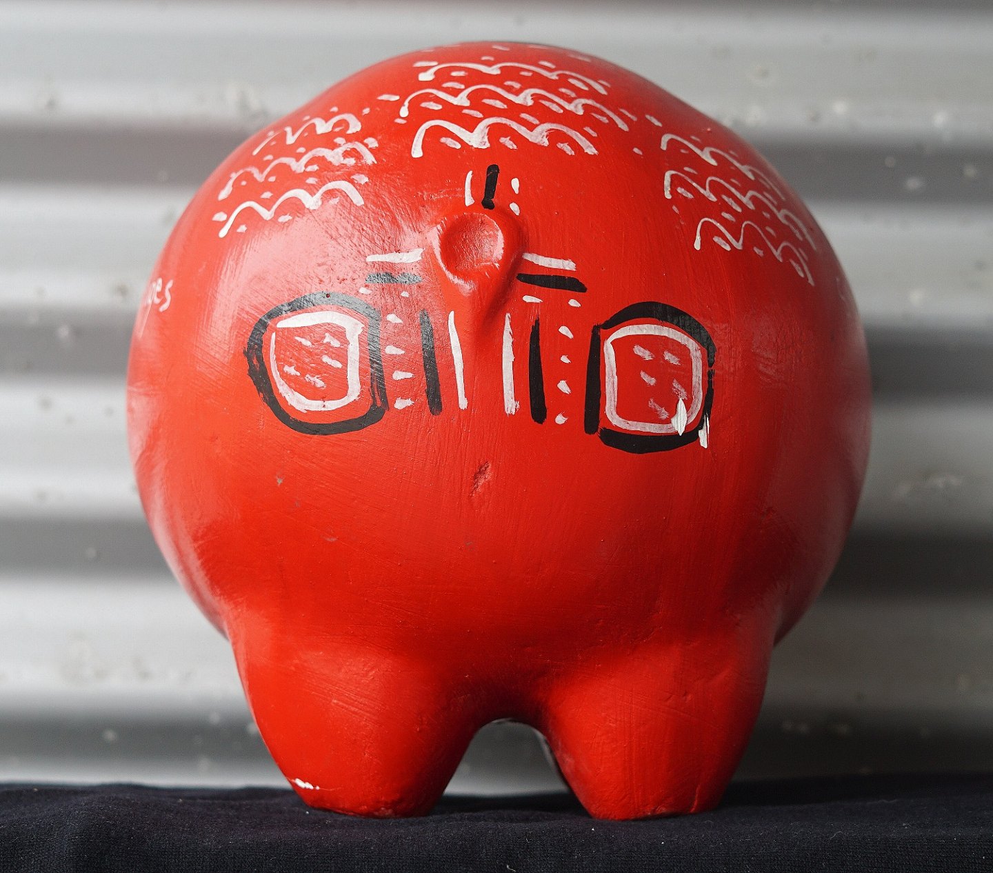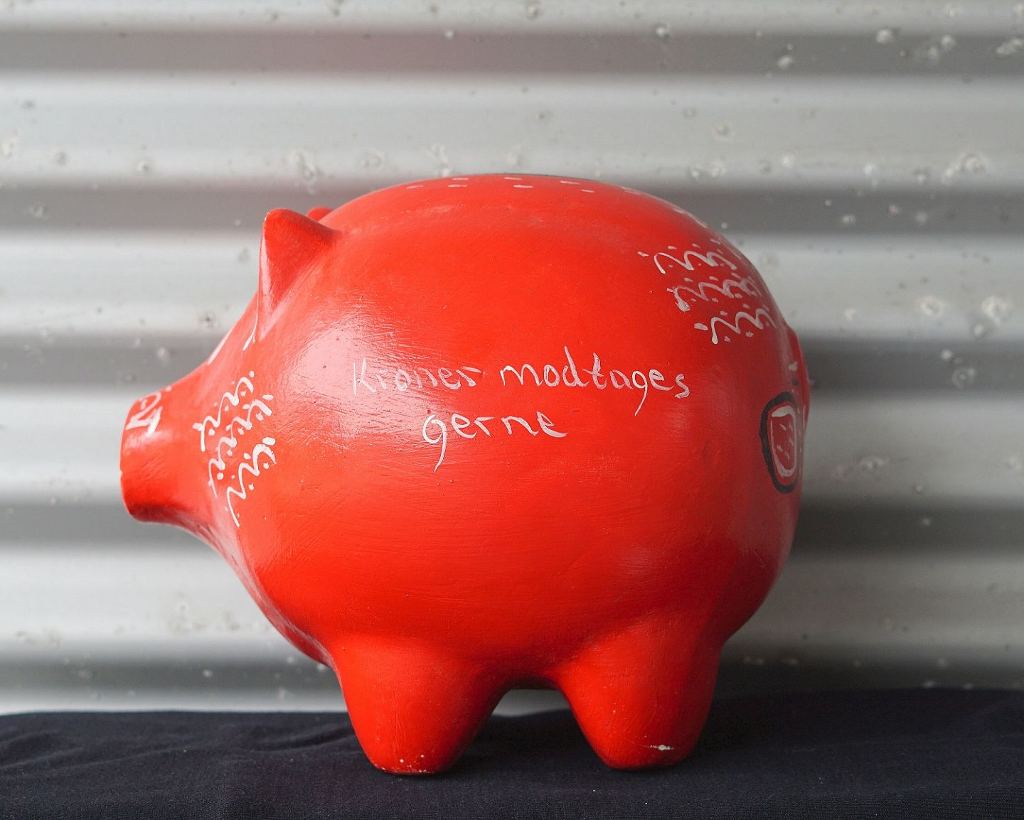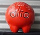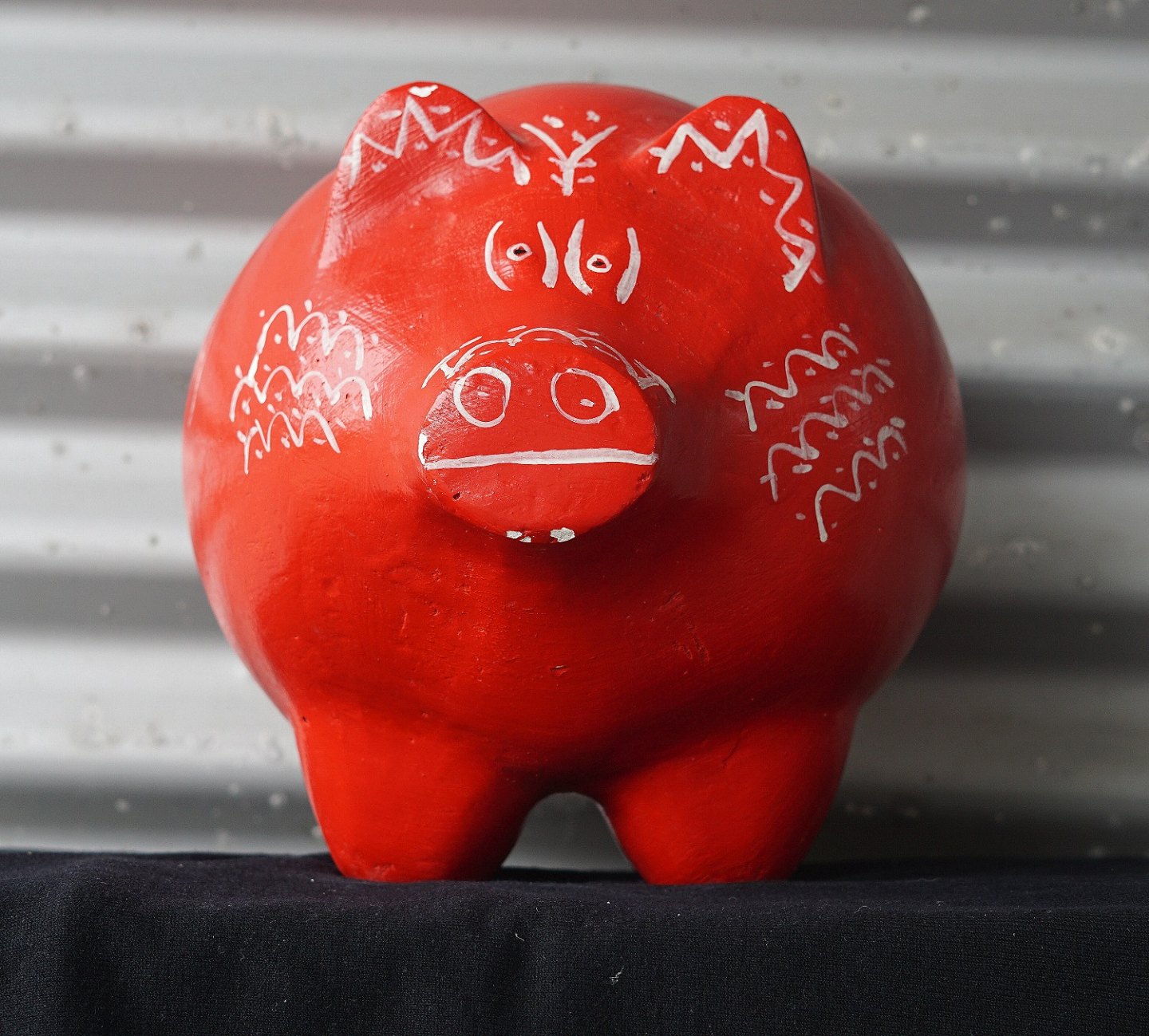 Stor rød sparregris, med hvide og sorte dekorationer. Der er ikke lavet, så sparrepengene kan komme ud. Grisen er lavet af gips eller papmache.