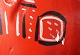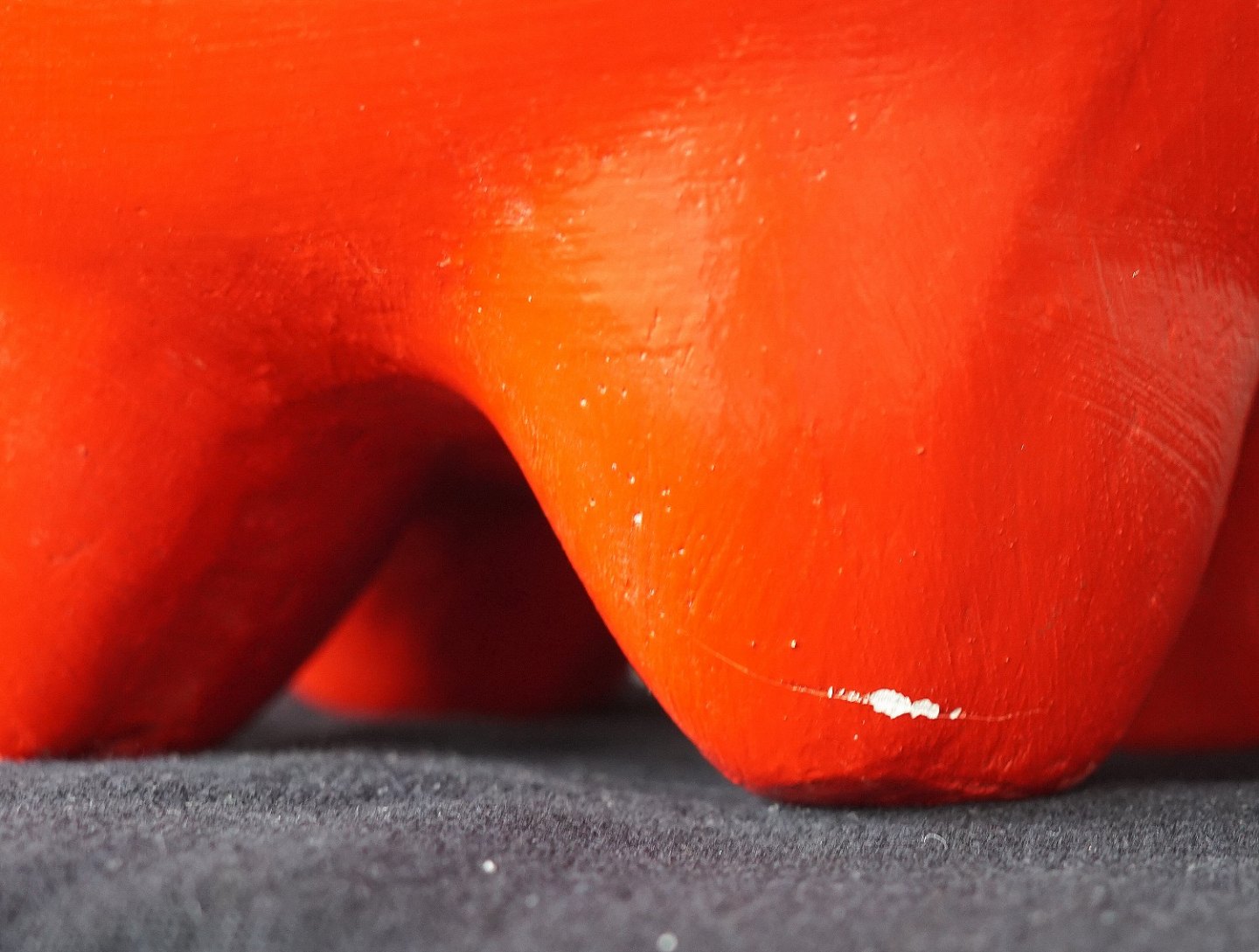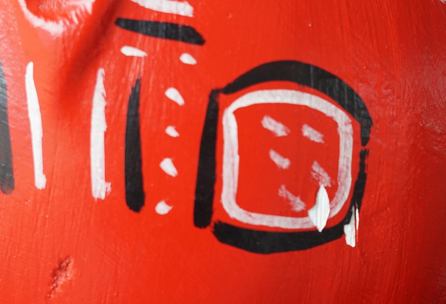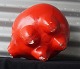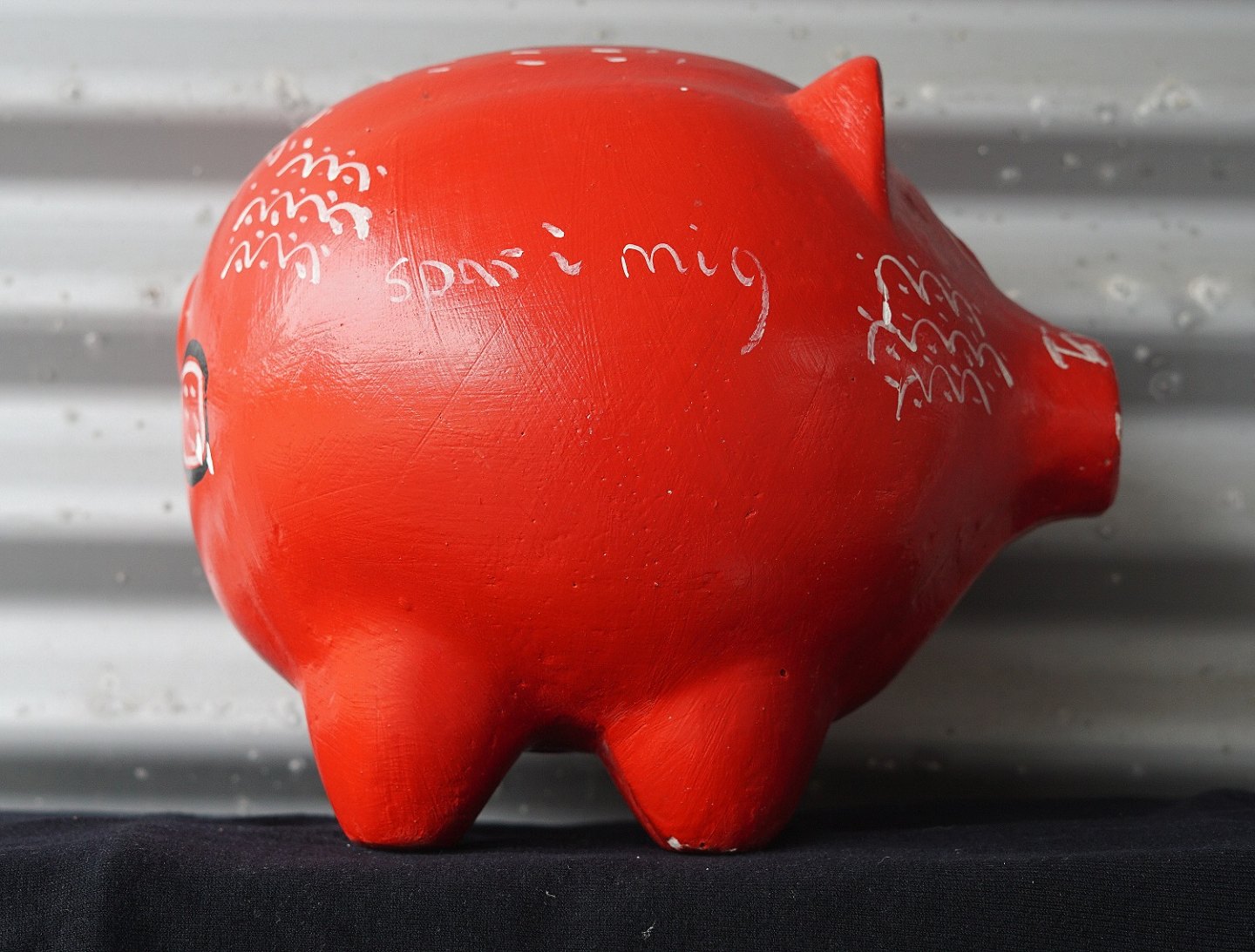 Stor rød sparregris, med hvide og sorte dekorationer. Der er ikke lavet, så sparrepengene kan komme ud. Grisen er lavet af gips eller papmache.