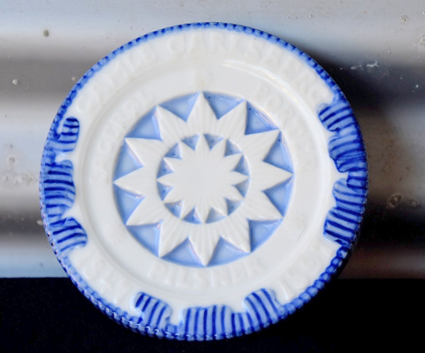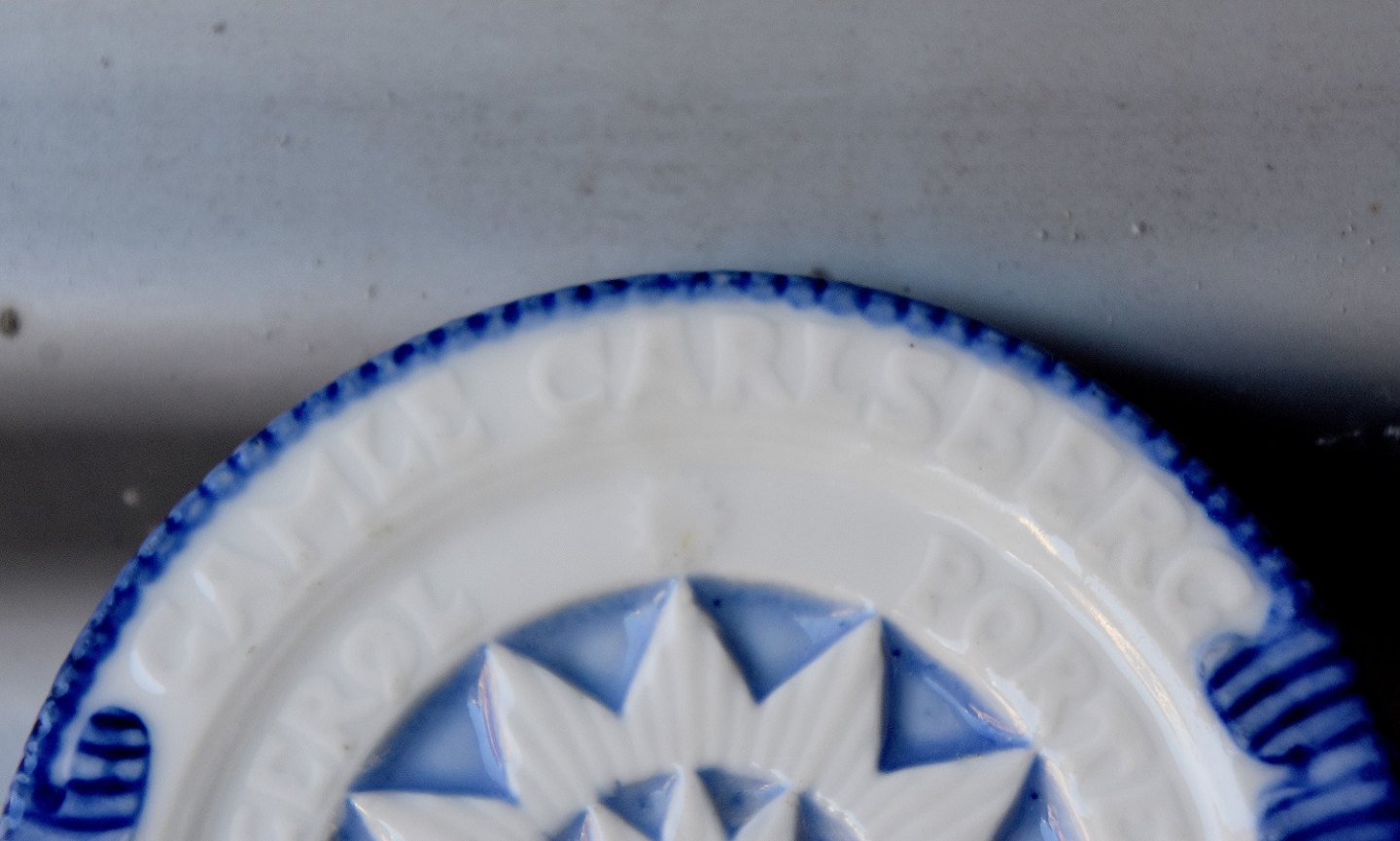 Bing & Grøndahl øl platte. Den hvide tekst: "Gamle Carlsberg 1847-1897 lagerøl porter pilsner". Må være lavet i anledningen af 50 års jubilæum.