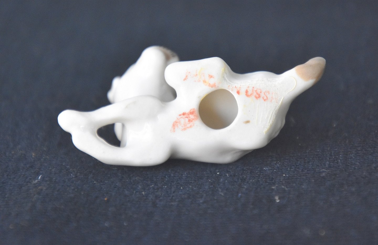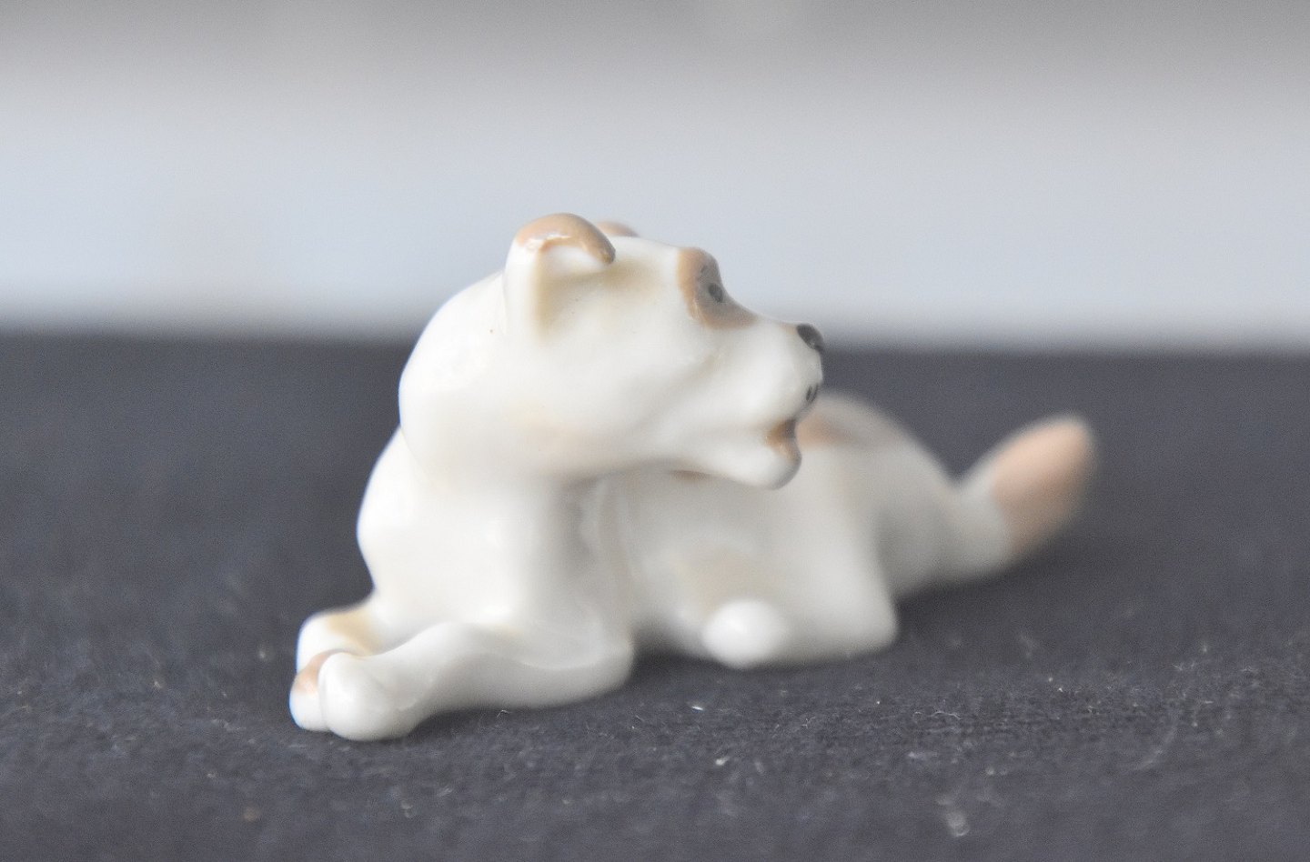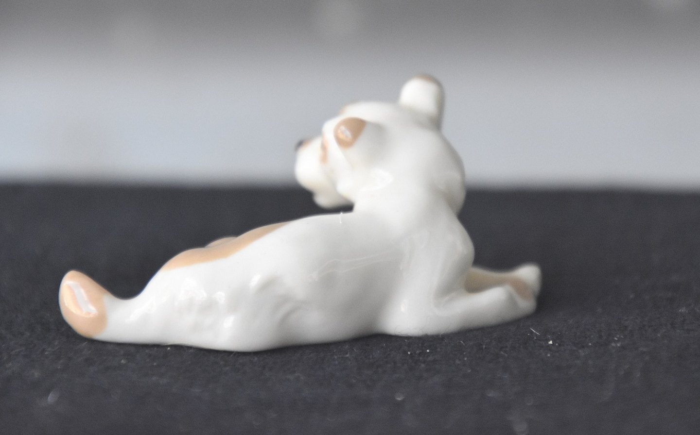 Russisk figur i porcelæn med motiv af liggende hund med ben