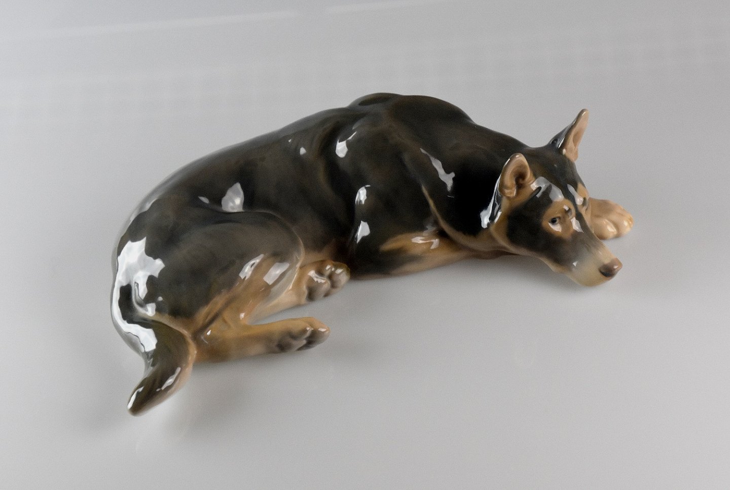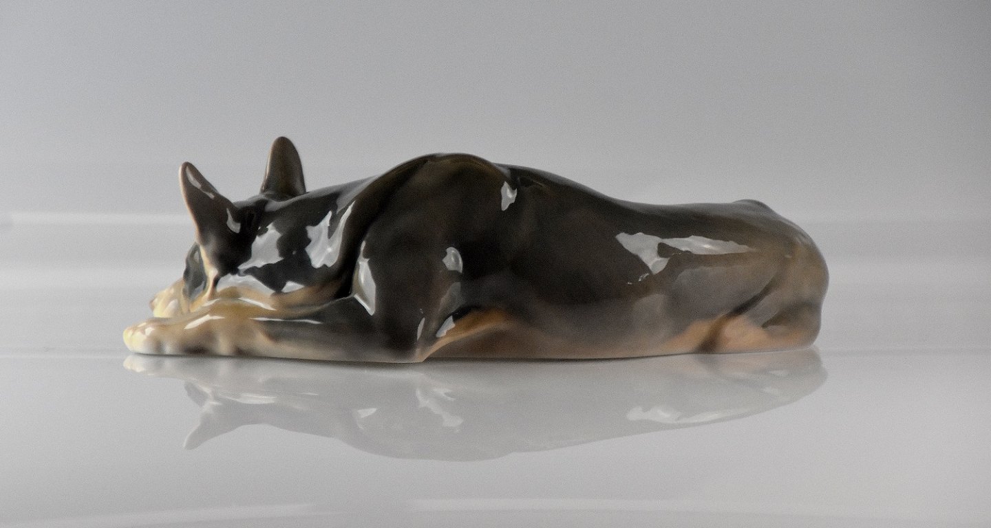 Figur i porcelæn med motiv af liggende schæferhund. Nr. 1789