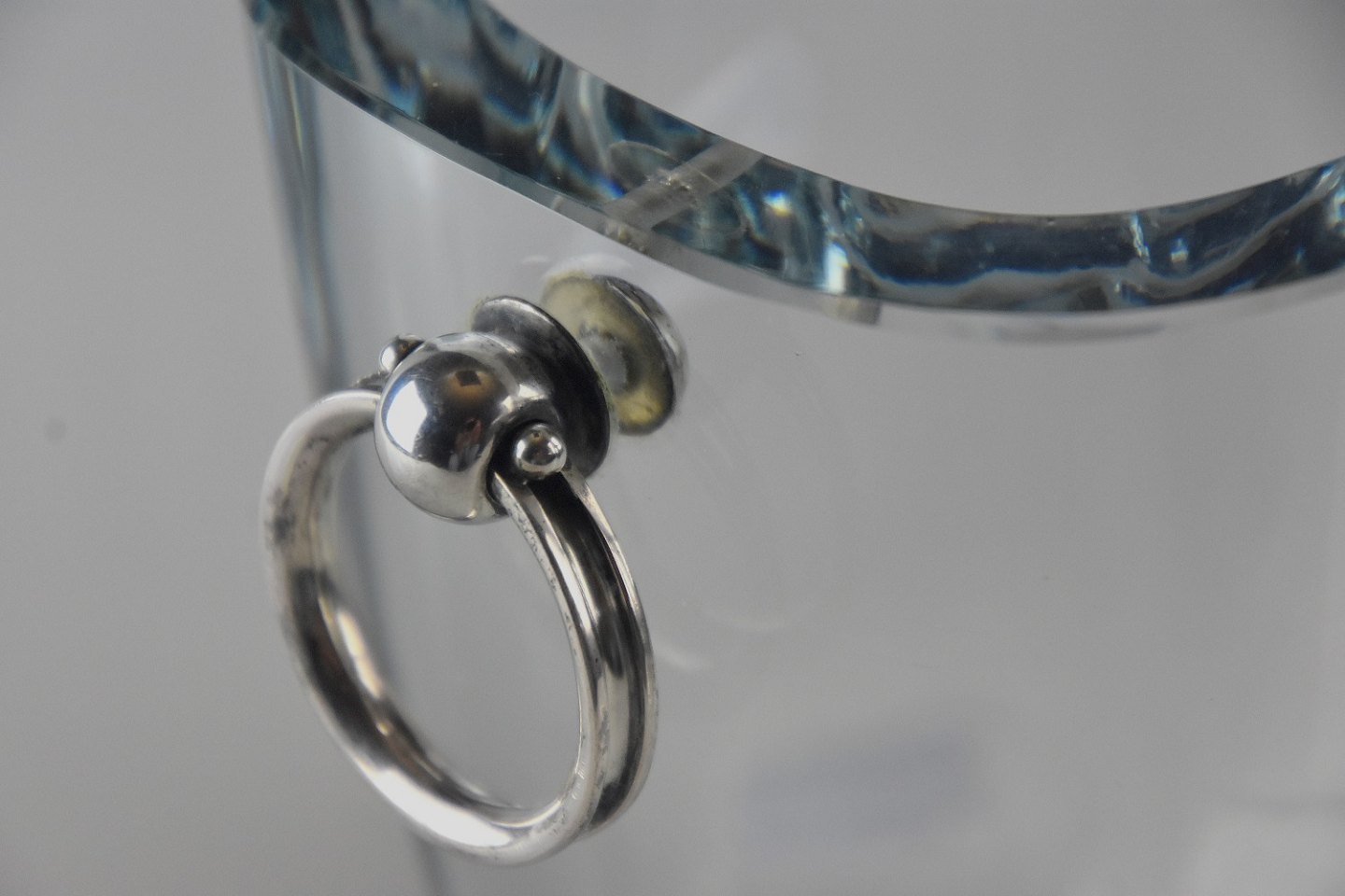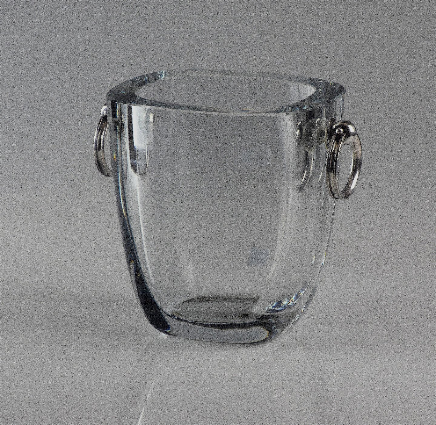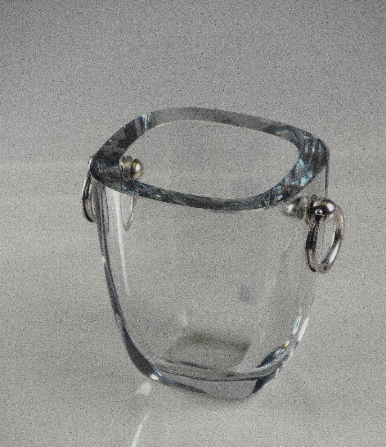 Holmgaard isspand i tykt blåligt glas, isspanden har 2 ringe som hanke. Hanken er sterling sølv