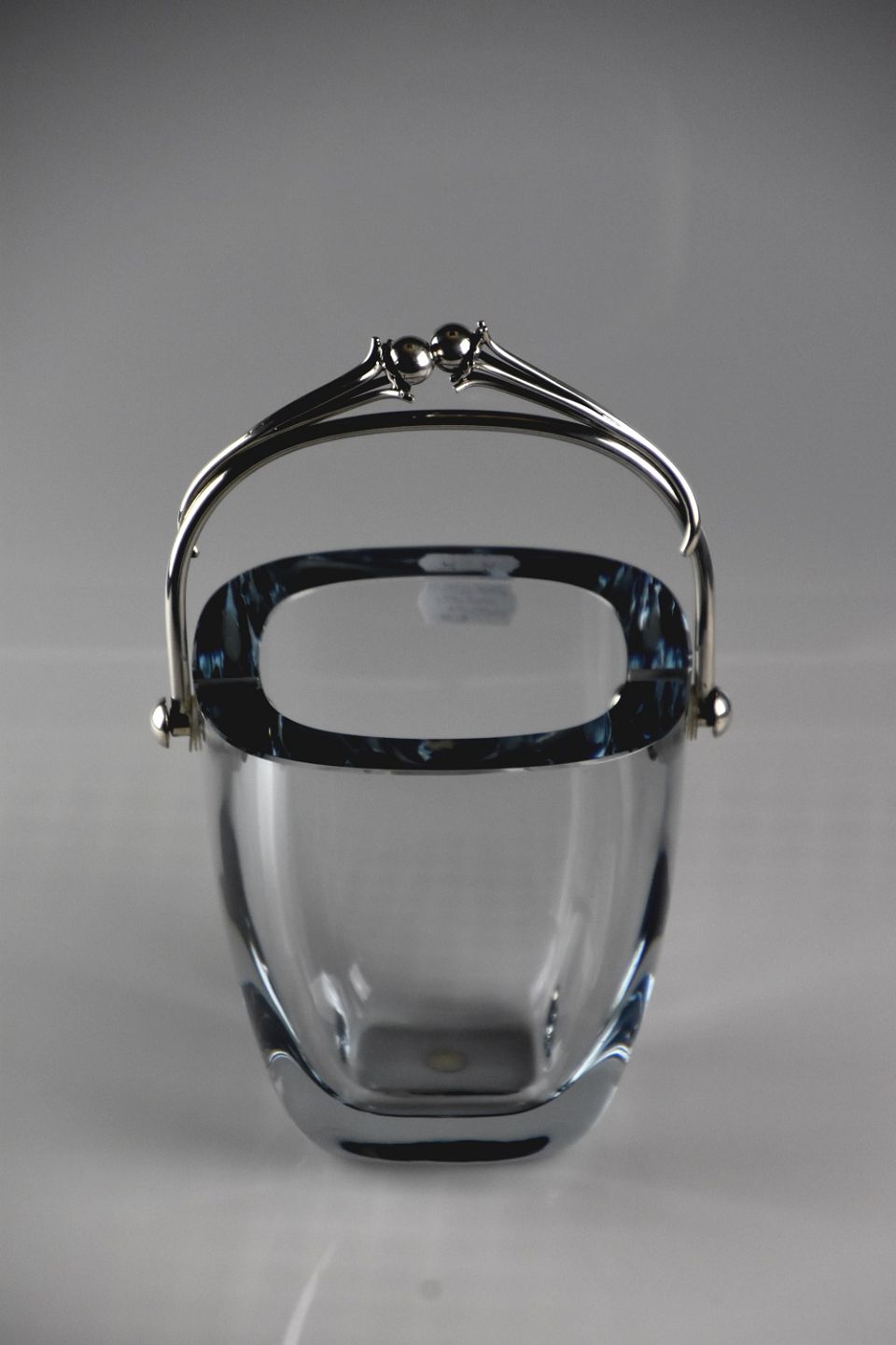 Holmegaard Isspand med sølv hank (sterling sølv), selve glasset er tykt og blåligt. Hanken fremstillet af Dansk Guldsmed Håndværk