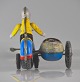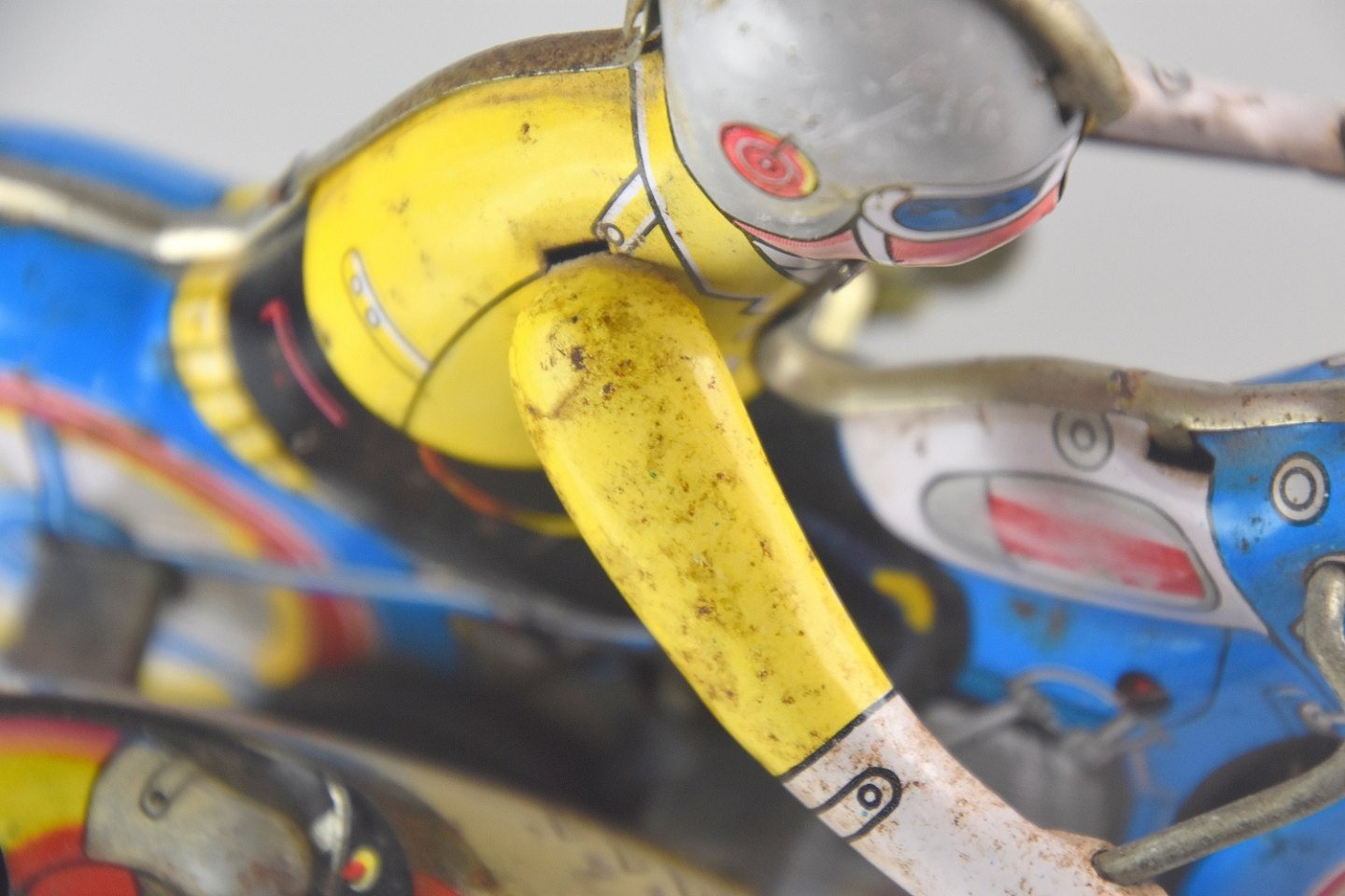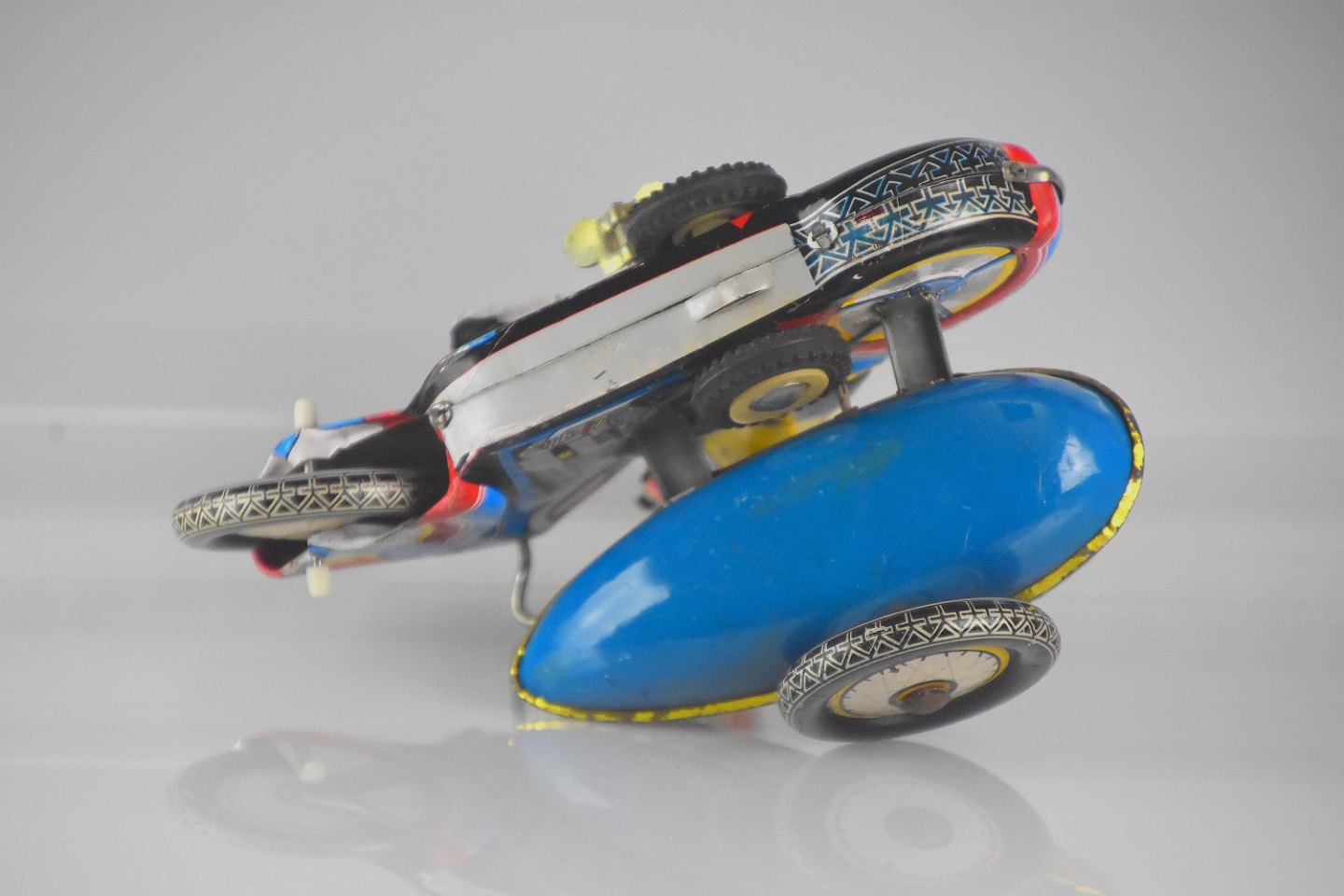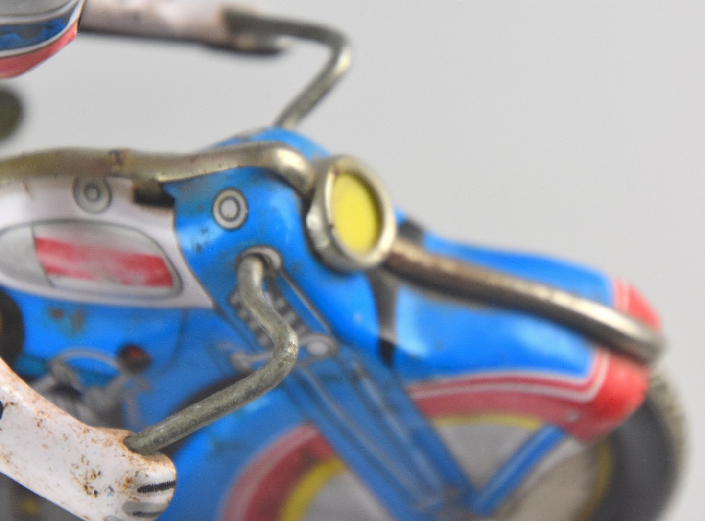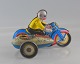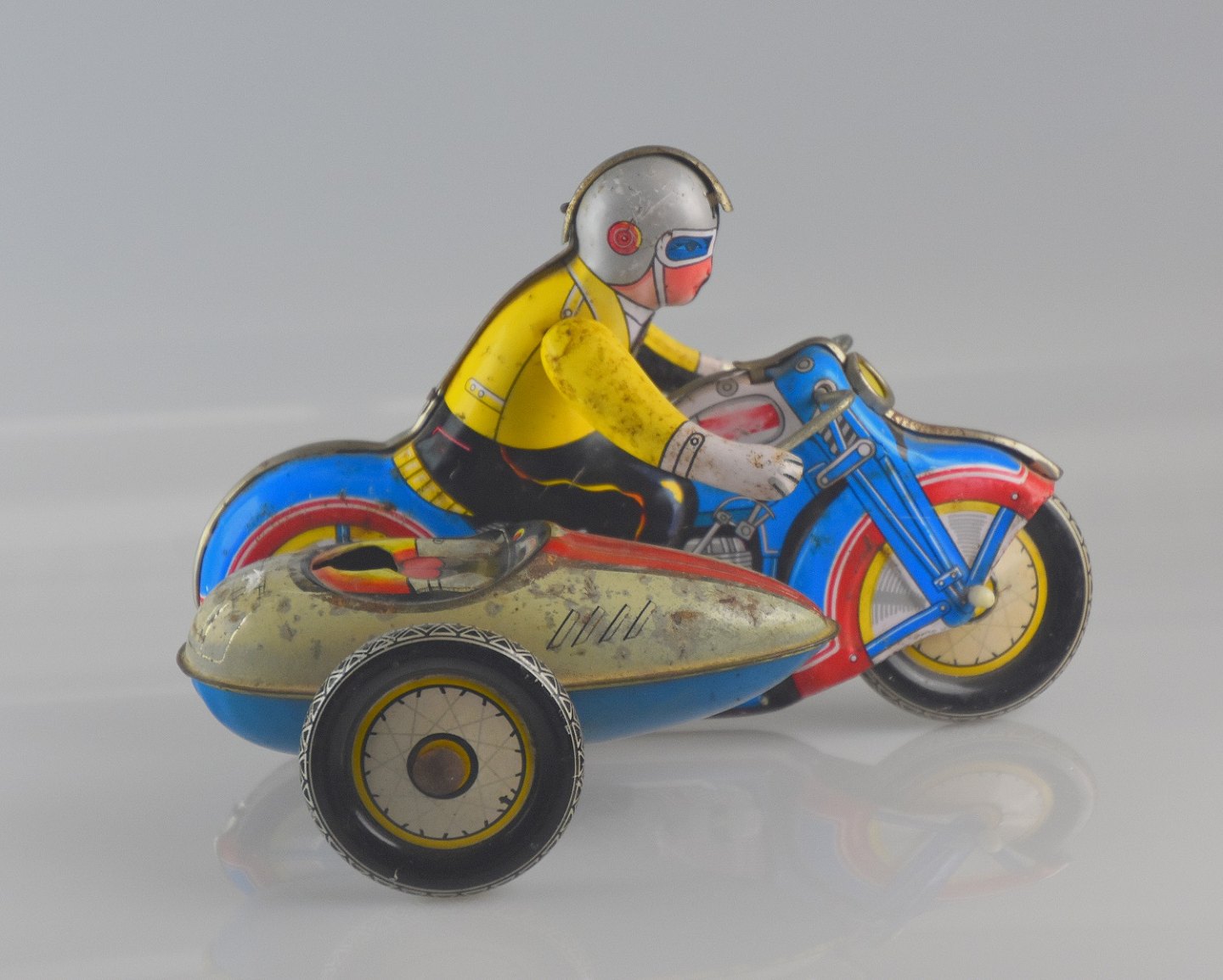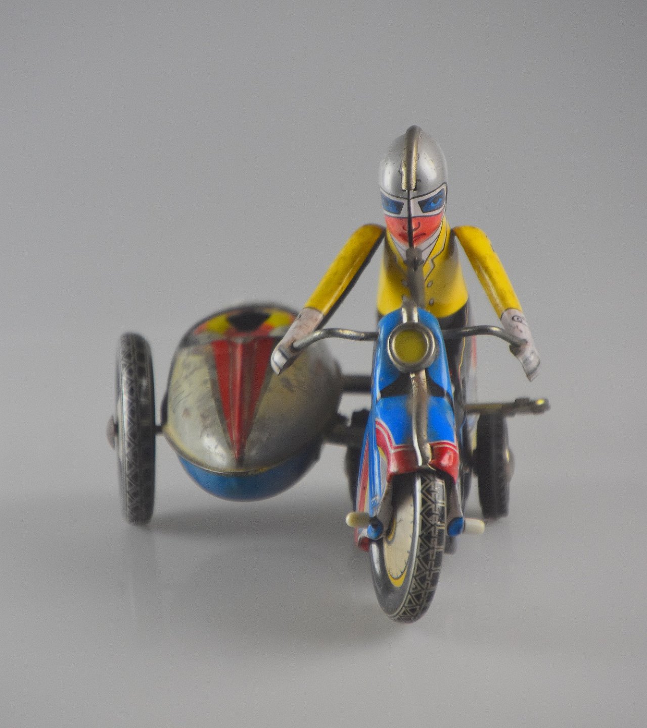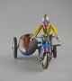 Mekanisk blik motorcykel med sidevogn. Motorcyklen er lavet i blik og skal trækkes op for at kører. Der er forskellige brugsspor på motorcyklen