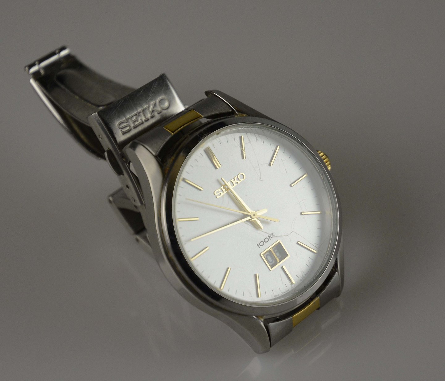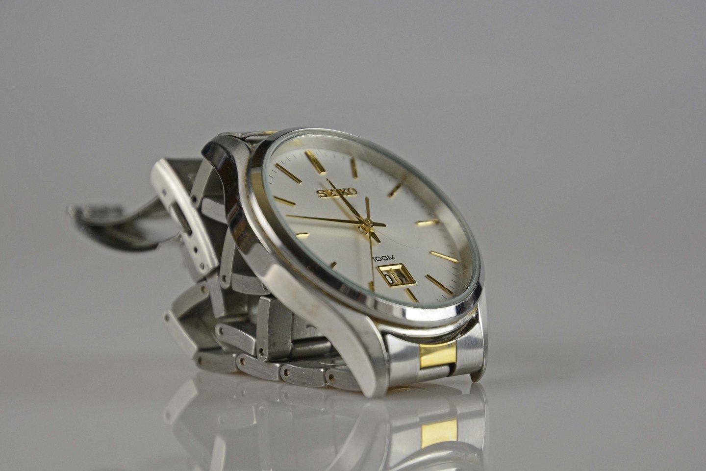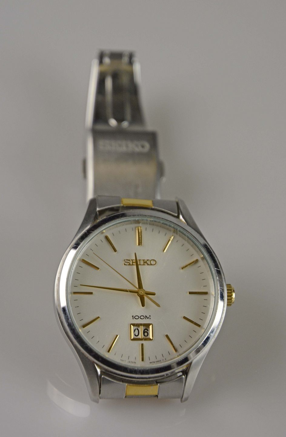 Seiko herrerur med dato, lænke og gyldne mellemled.