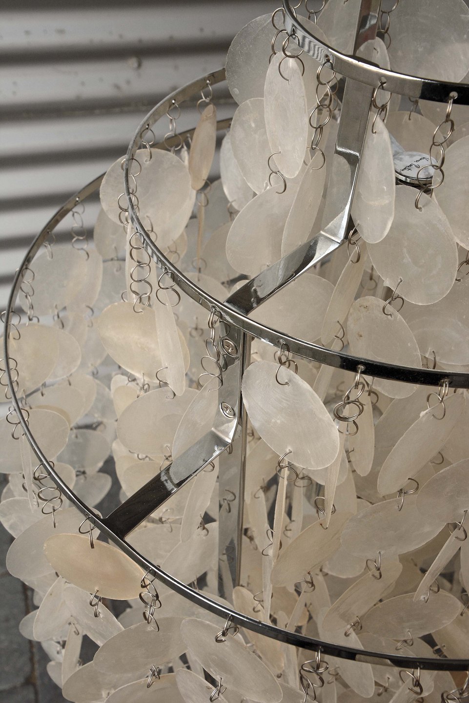 Lampenfod af blankpoleret metal med skærm af strenge af perlemorskaller.