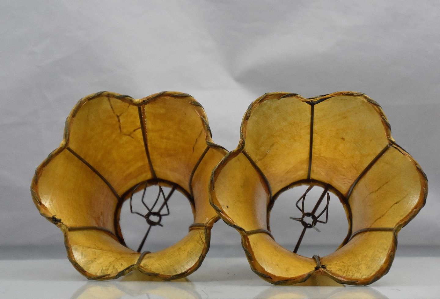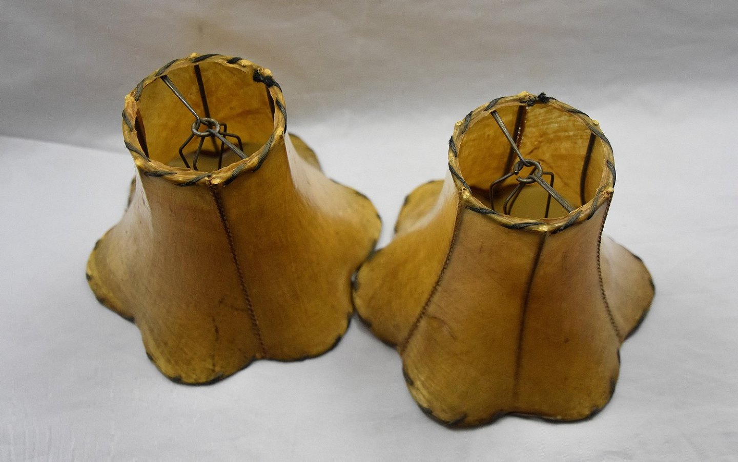 2 gamle lampeskærme lavet af svineblærer, lakeret.
