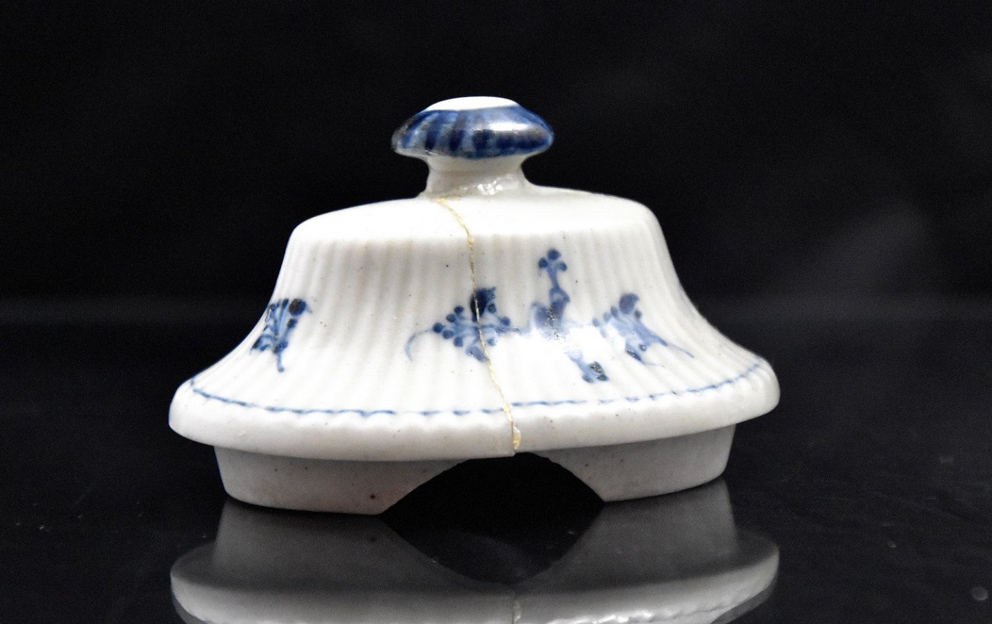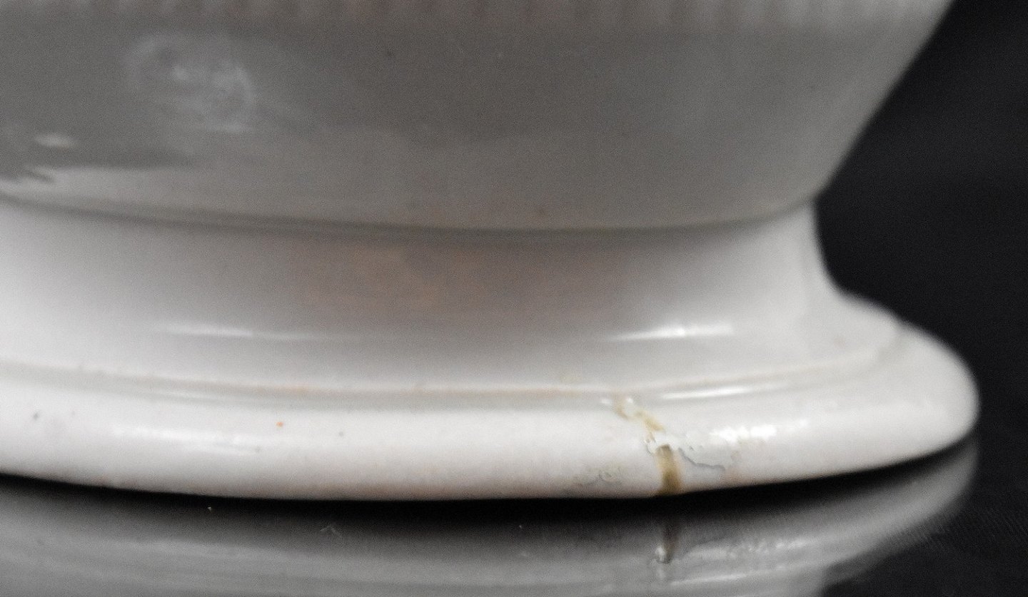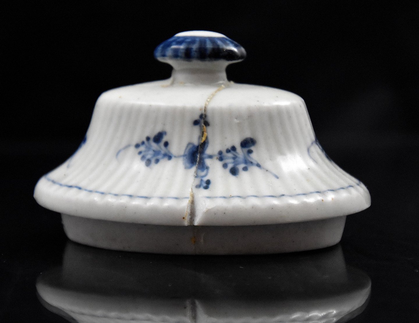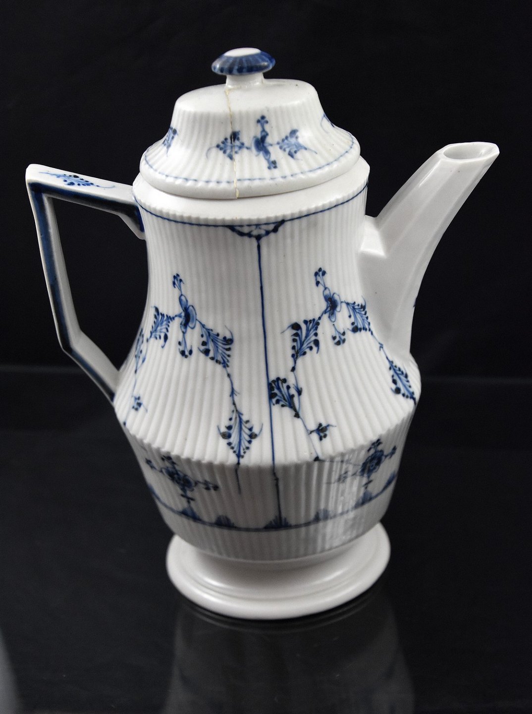 Kaffe kande i musselmalet fra ca 1800, Den Kongelig porcelænsfabrik. Kanden er oval. Kaffekanden har flere brugsspor og er klinket et par gange i låg