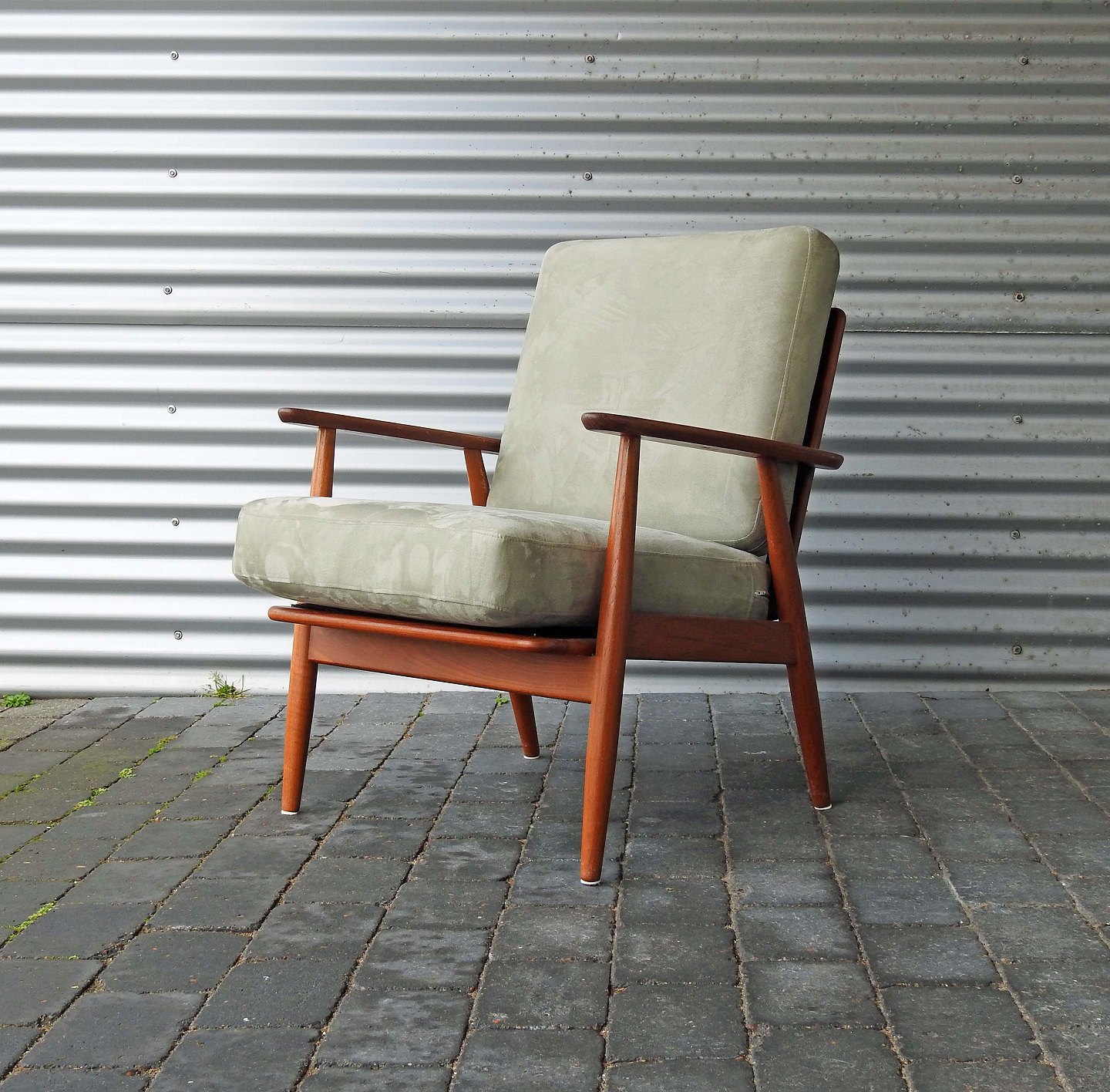 Lænestol i teaktræ med polstret sæde med gråt stofbetræk, betræk og polstring i god stand.