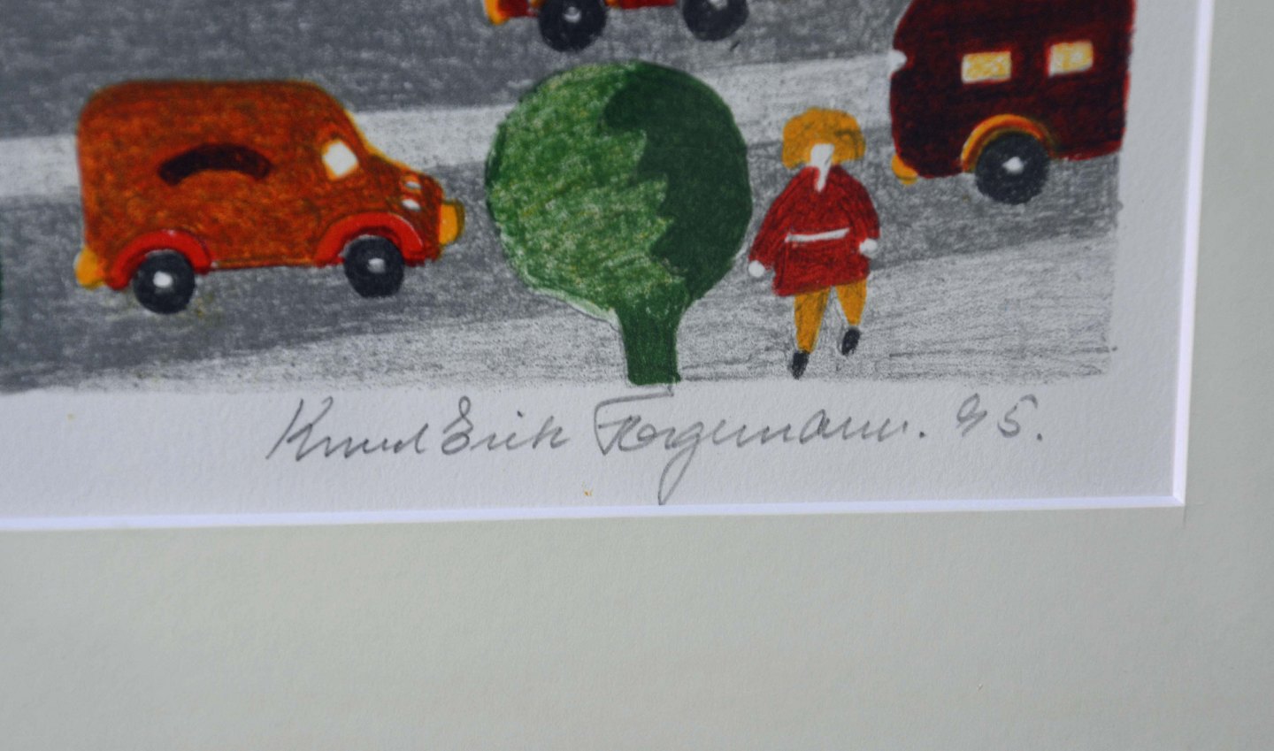 Litografi med motiv af bygninger og byliv af Knud Erik Færgemann