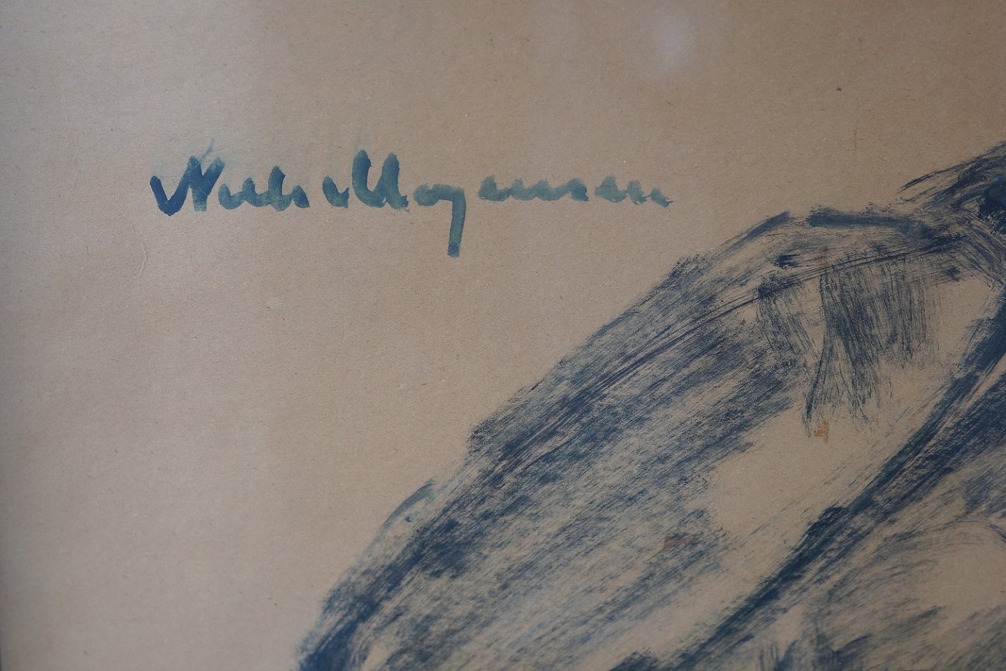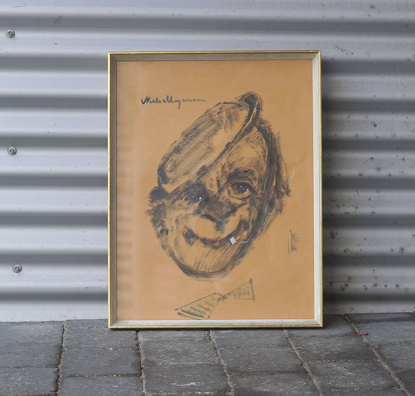 Oliemaling og oliekridt på brunt papir. Klovn med cigaret i munden