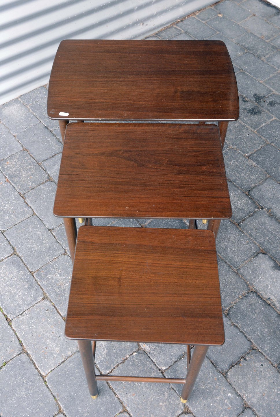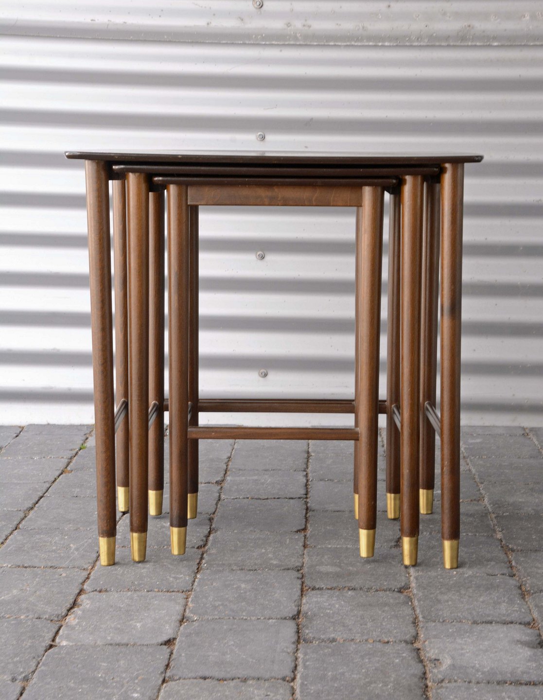 Et sæt indskudsborde i lakeret massivt træ med messingfod. Stellet er lavet af bejdset bøgetræ.
