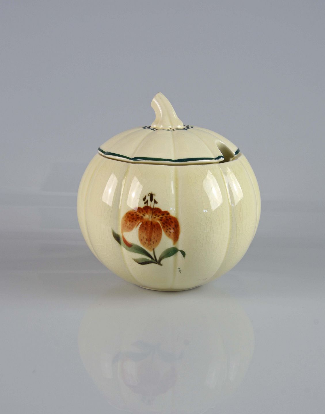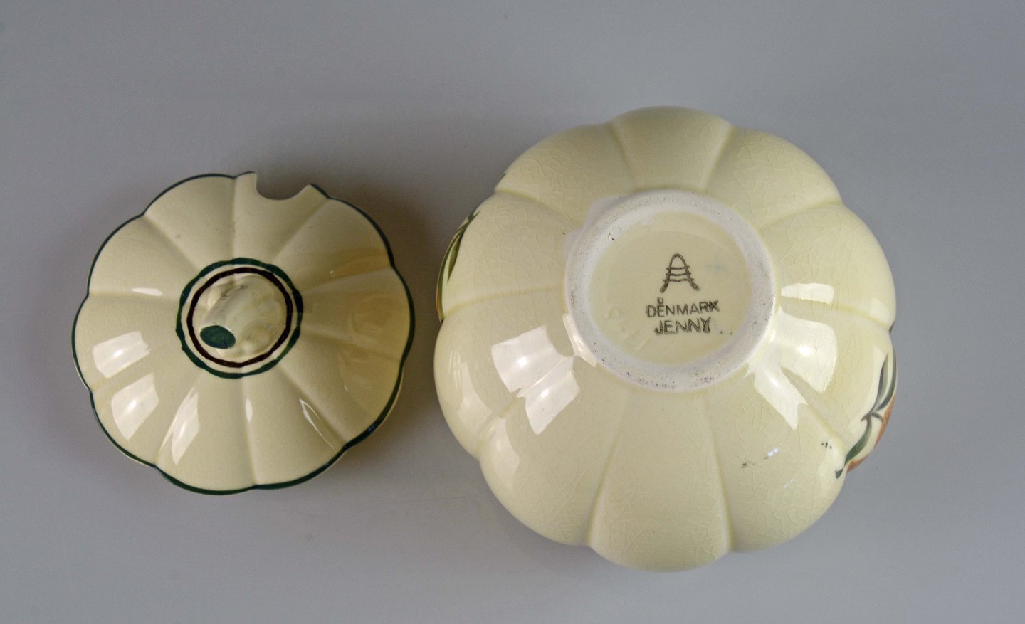 Græskar-formet lågkrukke fra stellet Jenny fra Aluminia år 1937-1967