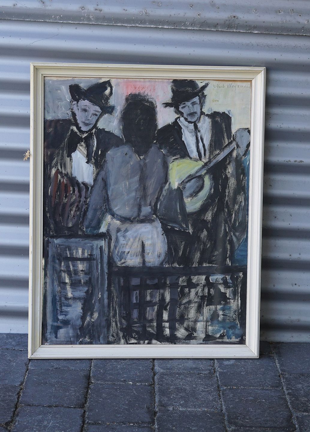 Maleri og Oliekridt af 2 musikanter med dame mellem sig.