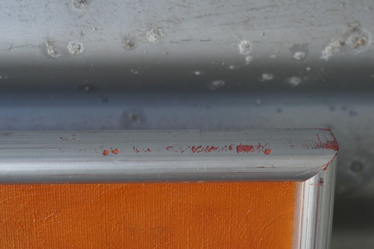 Orange maleri med rødt hjerte og grønne håndaftryk, olie/akryl på lærred