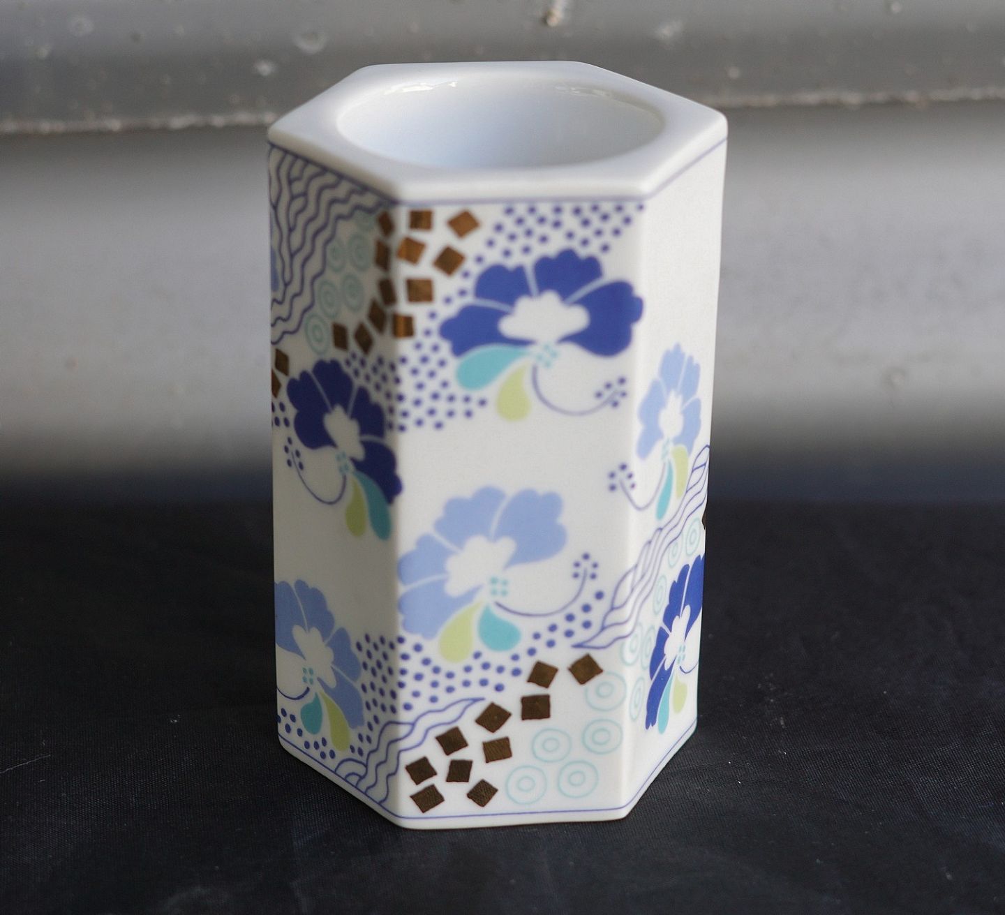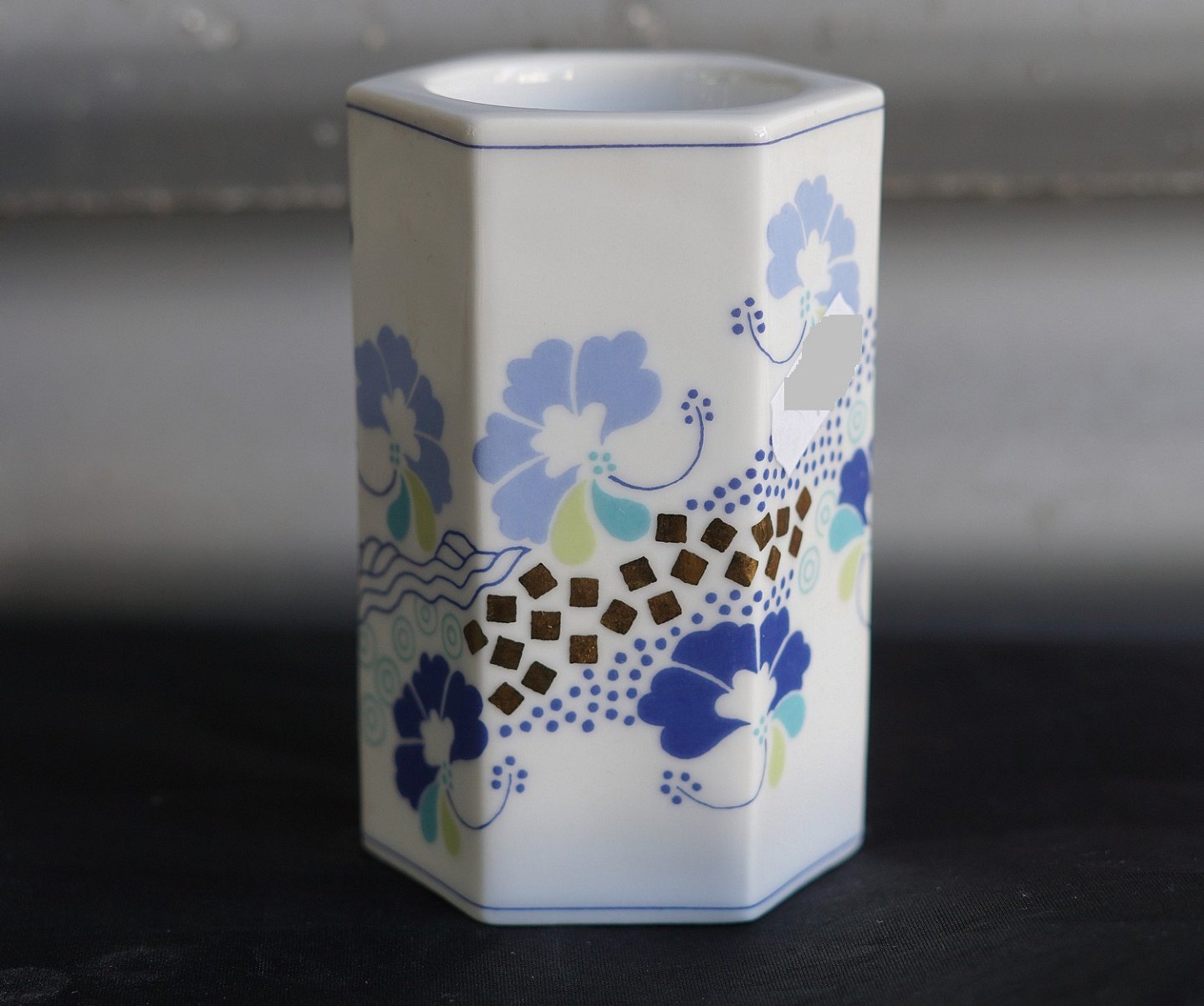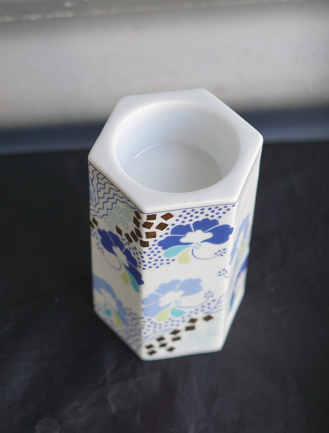 6-kantet fyrfadsstage (1817/5465). Porcelæn dekoreret med trykt motiv og guld