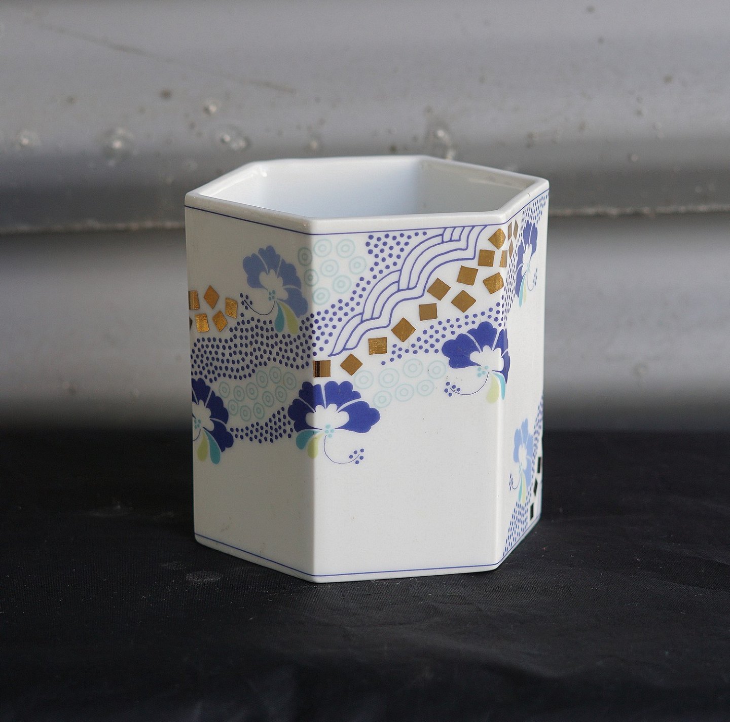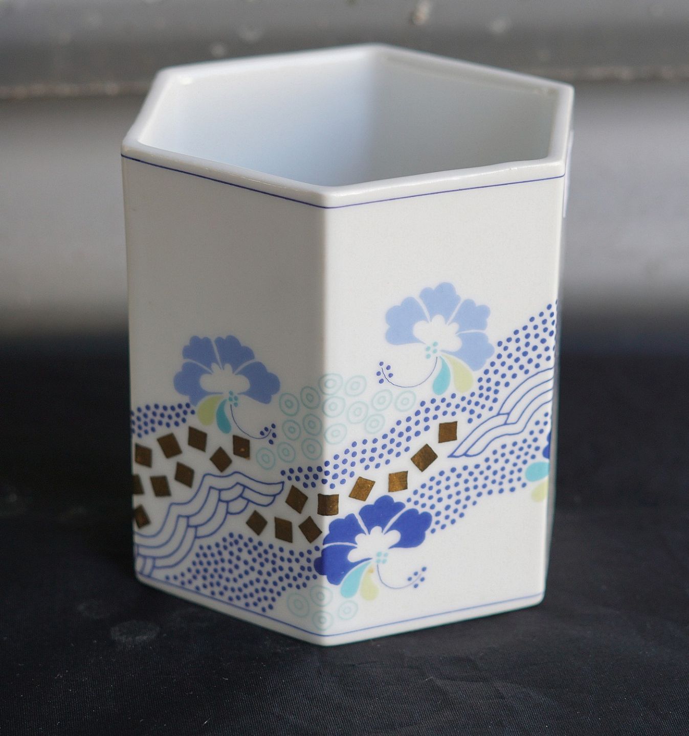 6-kantet vase (1817/5471). Porcelæn dekoreret med trykt motiv og guld