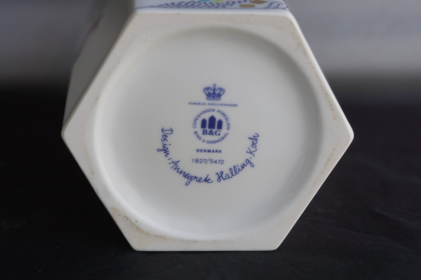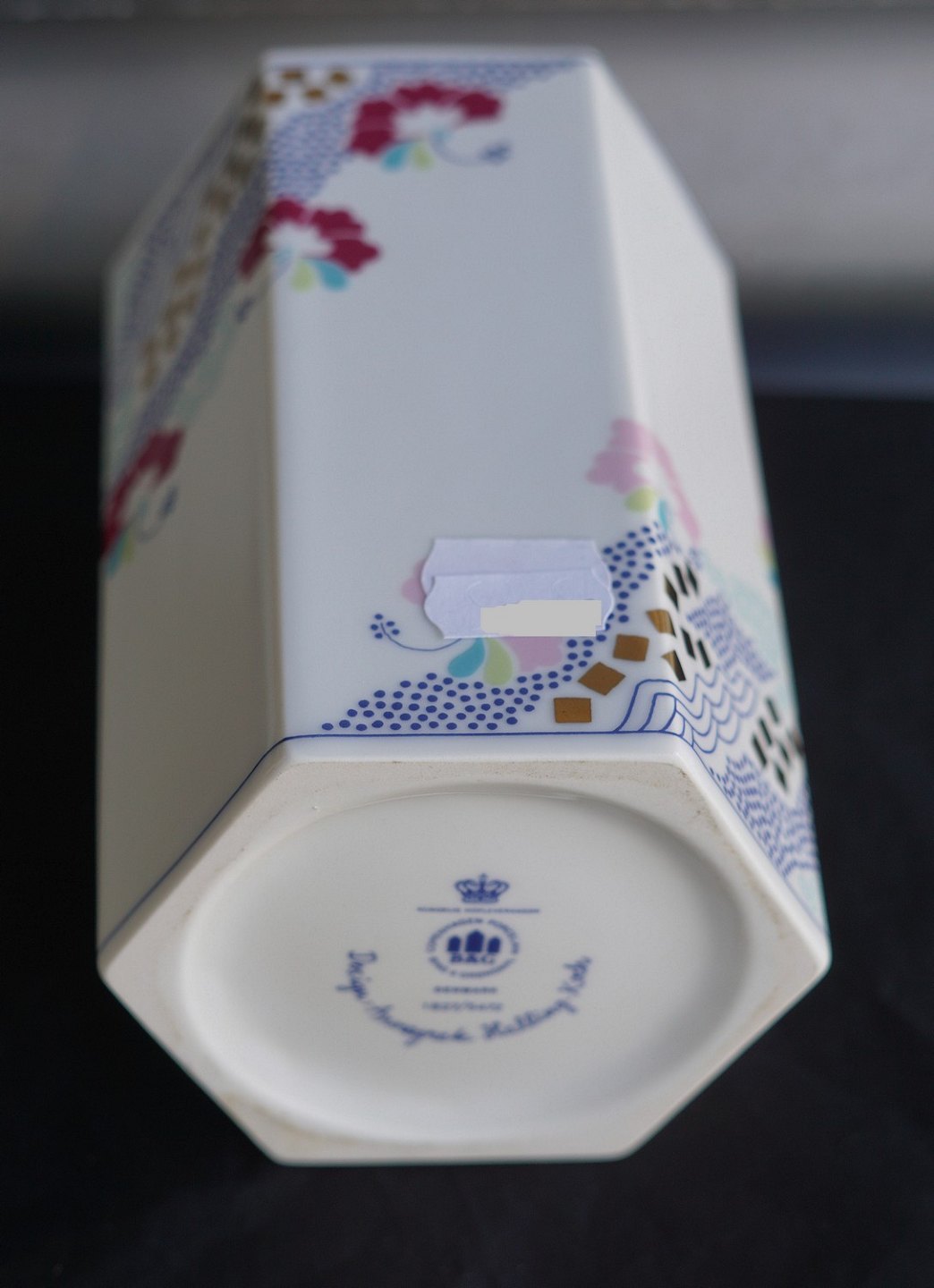 6-kantet vase (1827/5472). Porcelæn dekoreret med trykt motiv og guld